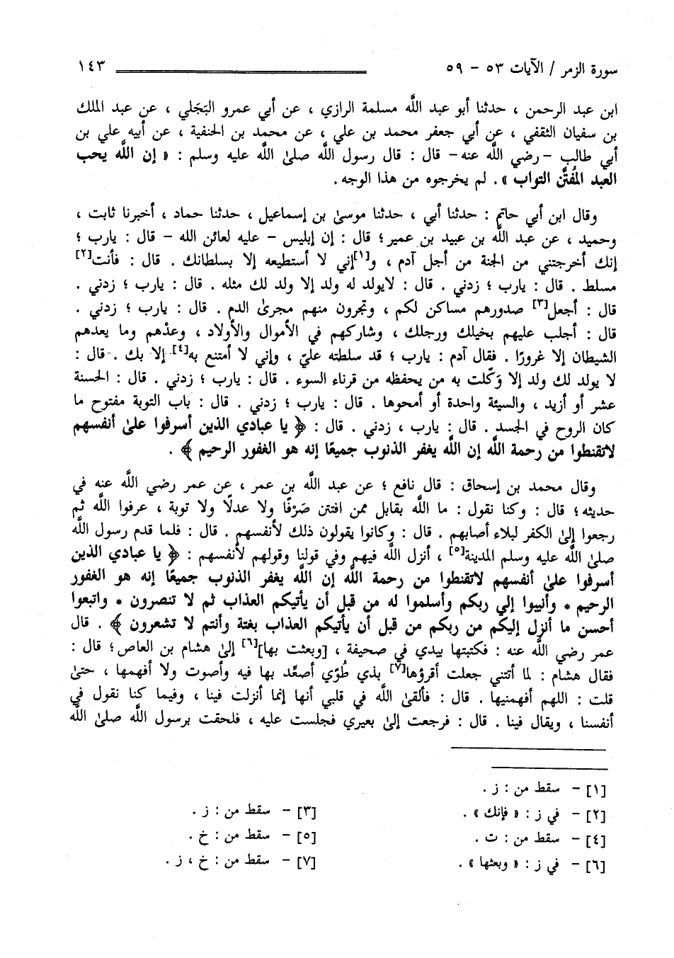 وَقَالَ مُحَمَّد بْن إِسْحَاق قَالَ نَافِع عَنْ عَبْد اللَّه بْن عُمَر عَنْ عُمَر رَضِيَ اللَّه عَنْهُمَا فِي حَدِيثه قَالَ وَكُنَّا نَقُول مَا اللَّه بِقَابِلٍ مِمَّنْ اُفْتُتِنَ صَرْفًا وَلَا عَدْلًا وَلَا تَوْبَة عَرَفُوا اللَّه ثُمَّ رَجَعُوا إِلَى الْكُفْر لِبَلَاءٍ أَصَابَهُمْ قَالَ وَكَانُوا يَقُولُونَ ذَلِكَ لِأَنْفُسِهِمْ قَالَ فَلَمَّا قَدِمَ رَسُول اللَّه صَلَّى اللَّه عَلَيْهِ وَسَلَّمَ الْمَدِينَة أَنْزَلَ اللَّه تَعَالَى فِيهِمْ وَفِي قَوْلنَا وَقَوْلهمْ لِأَنْفُسِهِمْ " يَا عِبَادِيَ الَّذِينَ أَسْرَفُوا عَلَى أَنْفُسهمْ لَا تَقْنَطُوا مِنْ رَحْمَة اللَّه إِنَّ اللَّه يَغْفِر الذُّنُوب جَمِيعًا إِنَّهُ هُوَ الْغَفُور الرَّحِيم وَأَنِيبُوا إِلَى رَبّكُمْ وَأَسْلِمُوا لَهُ مِنْ قَبْل أَنْ يَأْتِيَكُمْ الْعَذَاب ثُمَّ لَا تُنْصَرُونَ وَاتَّبِعُوا أَحْسَن مَا أُنْزِلَ إِلَيْكُمْ مِنْ رَبّكُمْ مِنْ قَبْل أَنْ يَأْتِيكُمْ الْعَذَاب بَغْتَة وَأَنْتُمْ لَا تَشْعُرُونَ " قَالَ عُمَر رَضِيَ اللَّه عَنْهُ فَكَتَبْتهَا بِيَدِي فِي صَحِيفَة وَبَعَثْت بِهَا إِلَى هِشَام بْن الْعَاص رَضِيَ اللَّه عَنْهُ قَالَ : فَقَالَ هِشَام لَمَّا أَتَتْنِي جَعَلْت أَقْرَأهَا بِذِي طُوًى أَصْعَد بِهَا فِيهِ وَأُصَوِّت وَلَا أَفْهَمهَا حَتَّى قُلْت اللَّهُمَّ أَفْهِمْنِيهَا قَالَ فَأَلْقَى اللَّه عَزَّ وَجَلَّ فِي قَلْبِي أَنَّهَا إِنَّمَا أُنْزِلَتْ فِينَا وَفِيمَا كُنَّا نَقُول فِي أَنْفُسنَا وَيُقَال فِينَا فَرَجَعْت إِلَى بَعِيرِي فَجَلَسْت عَلَيْهِ فَلَحِقْت بِرَسُولِ اللَّه صَلَّى اللَّه
