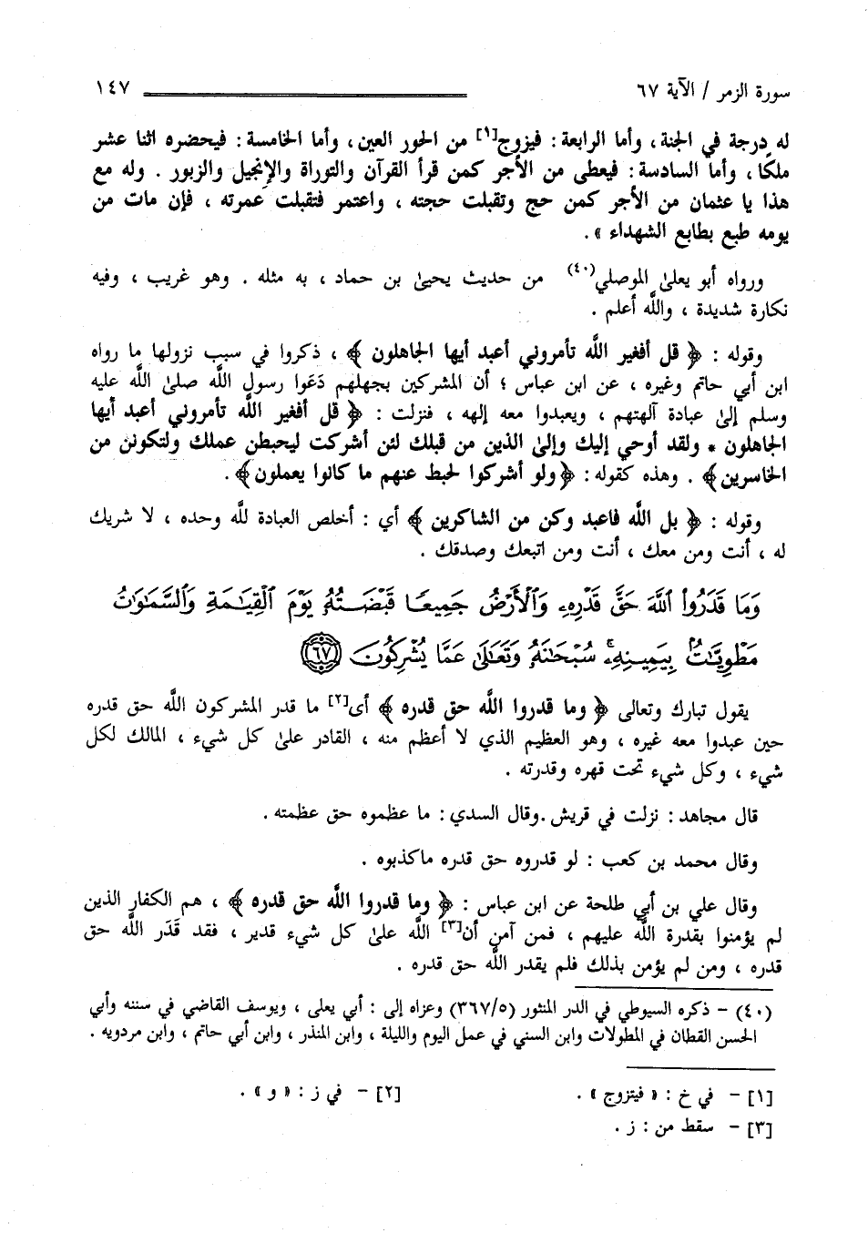 وَمَا قَدَرُوا اللَّهَ حَقَّ قَدْرِهِ وَالْأَرْضُ جَمِيعًا قَبْضَتُهُ يَوْمَ الْقِيَامَةِ وَالسَّماوَاتُ مَطْوِيَّاتٌ بِيَمِينِهِ سُبْحَانَهُ وَتَعَالَى عَمَّا يُشْرِكُونَ (67)
