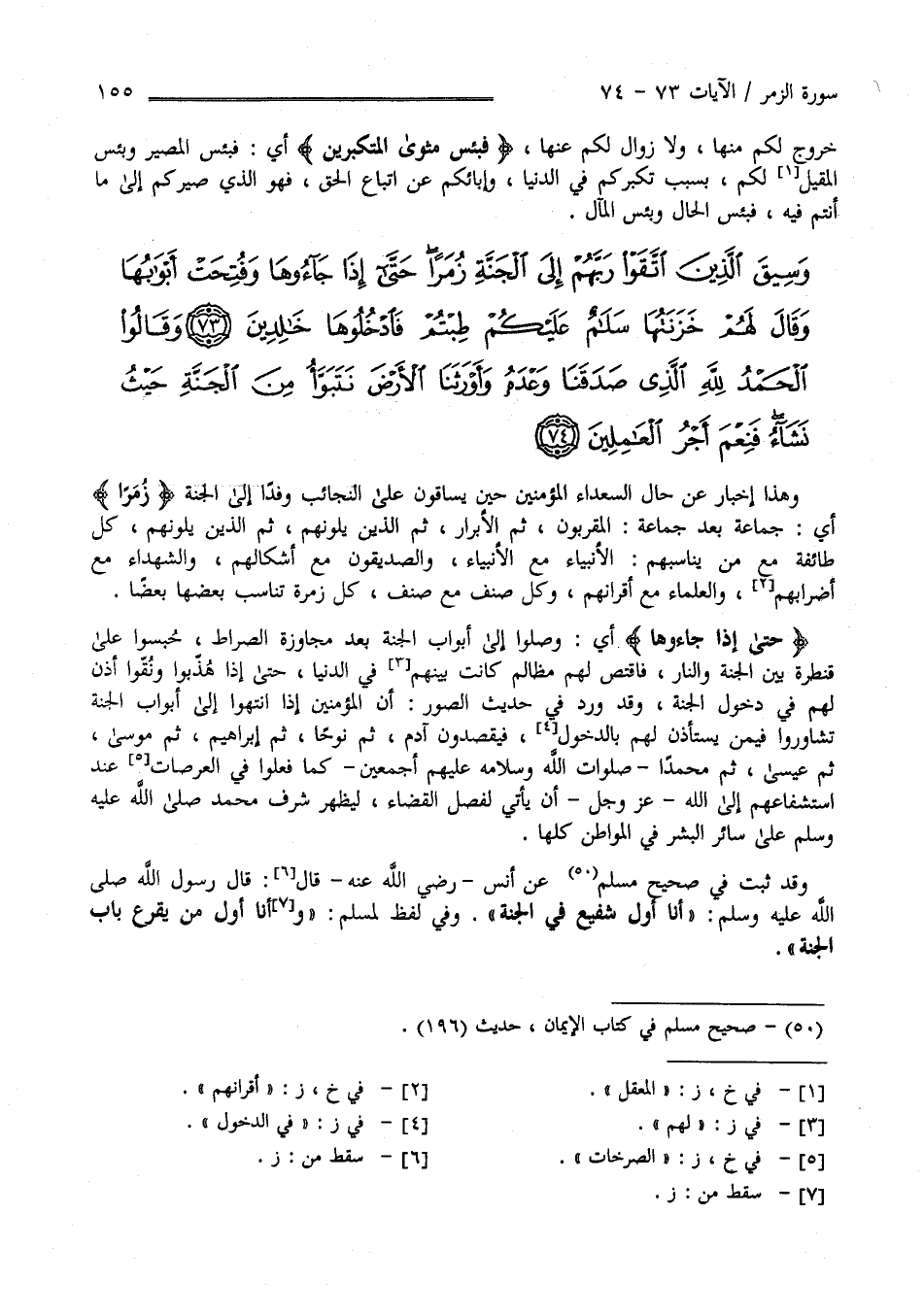 وَسِيقَ الَّذِينَ اتَّقَوْا رَبَّهُمْ إِلَى الْجَنَّةِ زُمَرًا حَتَّى إِذَا جَاءُوهَا وَفُتِحَتْ أَبْوَابُهَا وَقَالَ لَهُمْ خَزَنَتُهَا سَلَامٌ عَلَيْكُمْ طِبْتُمْ فَادْخُلُوهَا خَالِدِينَ (73)