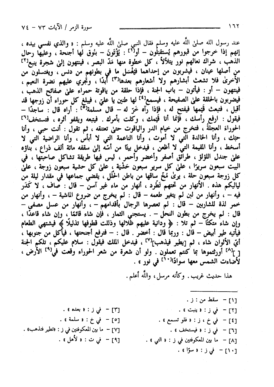 عِنْد رَسُول اللَّه صَلَّى اللَّه عَلَيْهِ وَسَلَّمَ فَقَالَ النَّبِيّ صَلَّى اللَّه عَلَيْهِ وَسَلَّمَ " وَاَلَّذِي نَفْسِي بِيَدِهِ إِنَّهُمْ إِذَا خَرَجُوا مِنْ قُبُورهمْ يَسْتَقْبِلُونَ - أَوْ يُؤْتَوْنَ - بِنُوقٍ لَهَا أَجْنِحَة وَعَلَيْهَا رِحَال الذَّهَب شِرَاك نِعَالهمْ نُور يَتَلَأْلَأ كُلّ خُطْوَة مِنْهَا مَدّ الْبَصَر فَيَنْتَهُونَ إِلَى شَجَرَة يَنْبُع مِنْ أَصْلِهَا عَيْنَانِ فَيَشْرَبُونَ مِنْ إِحْدَاهُمَا فَتَغْسِل مَا فِي بُطُونهمْ مِنْ دَنَس وَيَغْتَسِلُونَ مِنْ الْأُخْرَى فَلَا تَشْعَث أَبْشَارُهُمْ وَلَا أَشْعَارهمْ بَعْدهَا أَبَدًا وَتَجْرِي عَلَيْهِمْ نَضْرَة النَّعِيم فَيَنْتَهُونَ - أَوْ فَيَأْتُونَ - بَاب الْجَنَّة فَإِذَا حَلْقَة مِنْ يَاقُوتَة حَمْرَاء عَلَى صَفَائِح الذَّهَب فَيَضْرِبُونَ بِالْحَلْقَةِ عَلَى الصَّفِيحَة فَيُسْمَع لَهَا طَنِين يَا عَلِيّ فَيَبْلُغ كُلّ حَوْرَاء أَنَّ زَوْجهَا قَدْ أَقْبَلَ فَتَبْعَث قَيِّمَهَا فَيَفْتَح لَهُ فَإِذَا رَآهُ خَرَّ لَهُ - قَالَ مَسْلَمَة أُرَاهُ قَالَ سَاجِدًا - فَيَقُول اِرْفَعْ رَأَسَك فَإِنَّمَا أَنَا قَيِّمُك وُكِّلْت بِأَمْرِك فَيَتْبَعهُ وَيَقْفُو أَثَره فَتَسْتَخِفّ الْحَوْرَاء الْعَجَلَة فَتَخْرُج مِنْ خِيَام الدُّرّ وَالْيَاقُوت حَتَّى تَعْتَنِقَهُ ثُمَّ تَقُول أَنْتَ حِبِّي وَأَنَا حِبُّك وَأَنَا الْخَالِدَة الَّتِي لَا أَمُوت وَأَنَا النَّاعِمَة الَّتِي لَا أَبْأَس وَأَنَا الرَّاضِيَة الَّتِي لَا أَسْخَط وَأَنَا الْمُقِيمَة الَّتِي لَا أَظْعَن فَيَدْخُل بَيْتًا مِنْ أُسِّهِ إِلَى أُسْقُفه مِائَة أَلْف ذِرَاع بِنَاؤُهُ عَلَى جَنْدَل اللُّؤْلُؤ طَرَائِق أَصْفَر وَأَخْضَر وَأَحْمَر لَيْسَ مِنْهَا طَرِيقَة تُشَاكِل صَاحِبَتهَا فِي الْبَيْت سَبْعُونَ سَرِيرًا عَلَى كُلّ سَرِير سَبْعُونَ حَشِيَّة عَلَى كُلّ حَشِيَّة سَبْعُونَ زَوْجَة عَلَى كُلّ زَوْجَة سَبْعُونَ حُلَّة يَرَى مُخّ سَاقِهَا مِنْ بَاطِن الْحُلَل يَقْضِي جِمَاعهَا فِي مِقْدَار لَيْلَة مِنْ لَيَالِيكُمْ هَذِهِ الْأَنْهَار مِنْ تَحْتهمْ تَطَّرِد أَنْهَار مِنْ مَاء غَيْر آسِن - قَالَ صَافٍ لَا كَدَر فِيهِ - وَأَنْهَار مِنْ لَبَن لَمْ يَتَغَيَّر طَعْمُهُ - قَالَ لَمْ يَخْرُج مِنْ ضُرُوع الْمَاشِيَة - وَأَنْهَار مِنْ خَمْر لَذَّة لِلشَّارِبِينَ - قَالَ لَمْ تَعْصِرهَا الرِّجَال بِأَقْدَامِهِمْ - وَأَنْهَار مِنْ عَسَل مُصَفًّى - قَالَ لَمْ يَخْرُج مِنْ بُطُون النَّحْل - يَسْتَجْنِي الثِّمَار فَإِنْ شَاءَ قَائِمًا وَإِنْ شَاءَ قَاعِدًا وَإِنْ شَاءَ مُتَّكِئًا - ثُمَّ تَلَا " وَدَانِيَة عَلَيْهِمْ ظِلَالهَا وَذُلِّلَتْ قُطُوفهَا تَذْلِيلًا " - فَيَشْتَهِي الطَّعَام فَيَأْتِيه طَيْر أَبْيَض - قَالَ وَرُبَّمَا قَالَ أَخْضَر قَالَ - فَتَرْفَع أَجْنِحَتهَا فَيَأْكُل مِنْ جَنُوبهَا أَيّ الْأَلْوَان شَاءَ ثُمَّ يَطِير فَيَذْهَب فَيَدْخُل الْمَلَك فَيَقُول : سَلَام عَلَيْكُمْ تَلِكُمْ الْجَنَّة أُورِثْتُمُوهَا بِمَا كُنْتُمْ تَعْمَلُونَ .