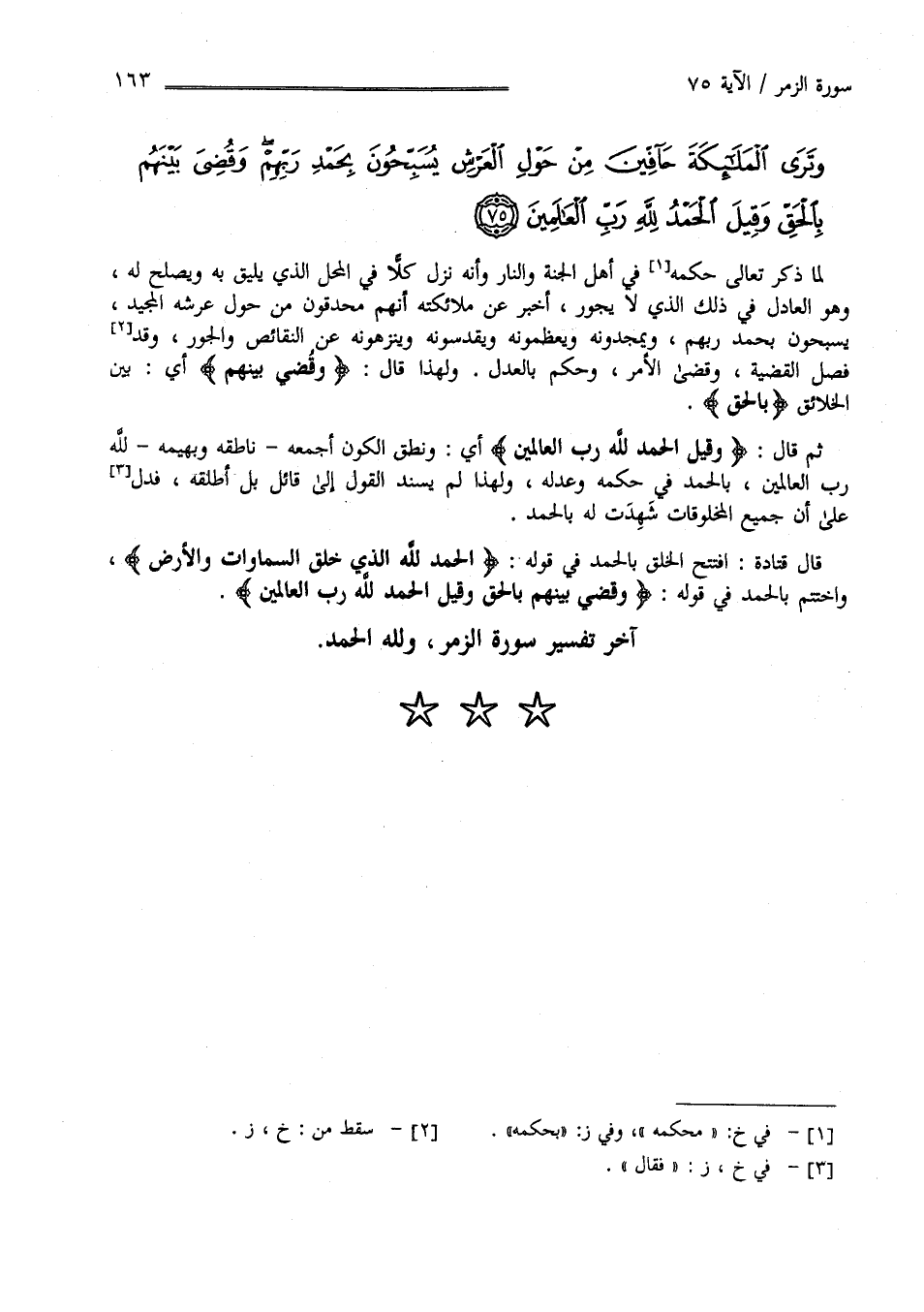 وَتَرَى الْمَلَائِكَةَ حَافِّينَ مِنْ حَوْلِ الْعَرْشِ يُسَبِّحُونَ بِحَمْدِ رَبِّهِمْ وَقُضِيَ بَيْنَهُمْ بِالْحَقِّ وَقِيلَ الْحَمْدُ لِلَّهِ رَبِّ الْعَالَمِينَ (75)