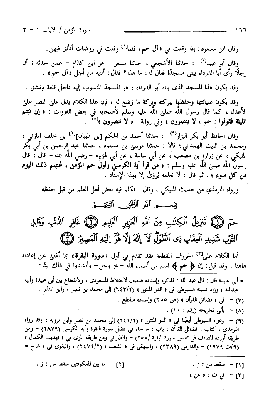 وَقَالَ أَبُو عُبَيْد ثنا الْأَشْجَعِيّ حَدَّثَنَا مِسْعَر - هُوَ اِبْن كِدَام - عَمَّنْ حَدَّثَهُ أَنَّ رَجُلًا رَأَى أَبَا الدَّرْدَاء رَضِيَ اللَّه عَنْهُ يَبْنِي مَسْجِدًا فَقَالَ لَهُ مَا هَذَا ؟ فَقَالَ أَبْنِيهِ مِنْ أَجْل آلِ حم وَقَدْ يَكُون هَذَا الْمَسْجِد الَّذِي بَنَاهُ أَبُو الدَّرْدَاء رَضِيَ اللَّه عَنْهُ هُوَ الْمَسْجِد الْمَنْسُوب إِلَيْهِ دَاخِل قَلْعَة دِمَشْق وَقَدْ يَكُون صِيَانَتهَا وَحِفْظهَا بِبَرَكَتِهِ وَبَرَكَة مَا وُضِعَ لَهُ فَإِنَّ هَذَا الْكَلَام يَدُلّ عَلَى النَّصْر عَلَى الْأَعْدَاء كَمَا قَالَ رَسُول اللَّه صَلَّى اللَّه عَلَيْهِ وَسَلَّمَ لِأَصْحَابِهِ فِي بَعْض الْغَزَوَات " إِنْ بُيِّتُّمْ اللَّيْلَة فَقُولُوا حم لَا يُنْصَرُونَ - وَفِي رِوَايَة - لَا تُنْصَرُونَ " وَقَالَ الْحَافِظ أَبُو بَكْر الْبَزَّار حَدَّثَنَا أَحْمَد بْن الْحَكَم بْن ظَبْيَان بْن خَلَف الْمَازِنِيّ وَمُحَمَّد بْن اللَّيْث الْهَمْدَانِيّ قَالَا حَدَّثَنَا مُوسَى بْن مَسْعُود حَدَّثَنَا عَبْد الرَّحْمَن بْن أَبِي بَكْر الْمَلِيكِيّ عَنْ زُرَارَة بْن مُصْعَب عَنْ أَبِي سَلَمَة عَنْ أَبِي هُرَيْرَة رَضِيَ اللَّه عَنْهُ قَالَ : قَالَ رَسُول اللَّه صَلَّى اللَّه عَلَيْهِ وَسَلَّمَ " مَنْ قَرَأَ آيَة الْكُرْسِيّ وَأَوَّل حم الْمُؤْمِن عُصِمَ ذَلِكَ الْيَوْم مِنْ كُلّ سُوء " ثُمَّ قَالَ لَا نَعْلَمهُ يُرْوَى إِلَّا بِهَذَا الْإِسْنَاد وَرَوَاهُ التِّرْمِذِيّ مِنْ حَدِيث الْمَلِيكِيّ وَقَالَ تَكَلَّمَ فِيهِ بَعْض أَهْل الْعِلْم مِنْ قِبَل حِفْظه .