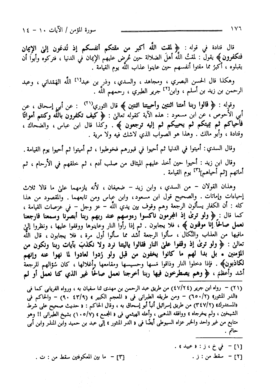 وَقَوْله " قَالُوا رَبَّنَا أَمَتَّنَا اِثْنَتَيْنِ وَأَحْيَيْتنَا اِثْنَتَيْنِ " قَالَ الثَّوْرِيّ عَنْ أَبِي إِسْحَاق عَنْ أَبِي الْأَحْوَص عَنْ اِبْن مَسْعُود رَضِيَ اللَّه عَنْهُ هَذِهِ الْآيَة كَقَوْلِهِ تَعَالَى " كَيْفَ تَكْفُرُونَ بِاَللَّهِ وَكُنْتُمْ أَمْوَاتًا فَأَحْيَاكُمْ ثُمَّ يُمِيتكُمْ ثُمَّ يُحْيِيكُمْ ثُمَّ إِلَيْهِ تُرْجَعُونَ " وَكَذَا قَالَ اِبْن عَبَّاس وَالضَّحَّاك وَقَتَادَة وَأَبُو مَالِك وَهَذَا هُوَ الصَّوَاب الَّذِي لَا شَكّ فِيهِ وَلَا مِرْيَة .