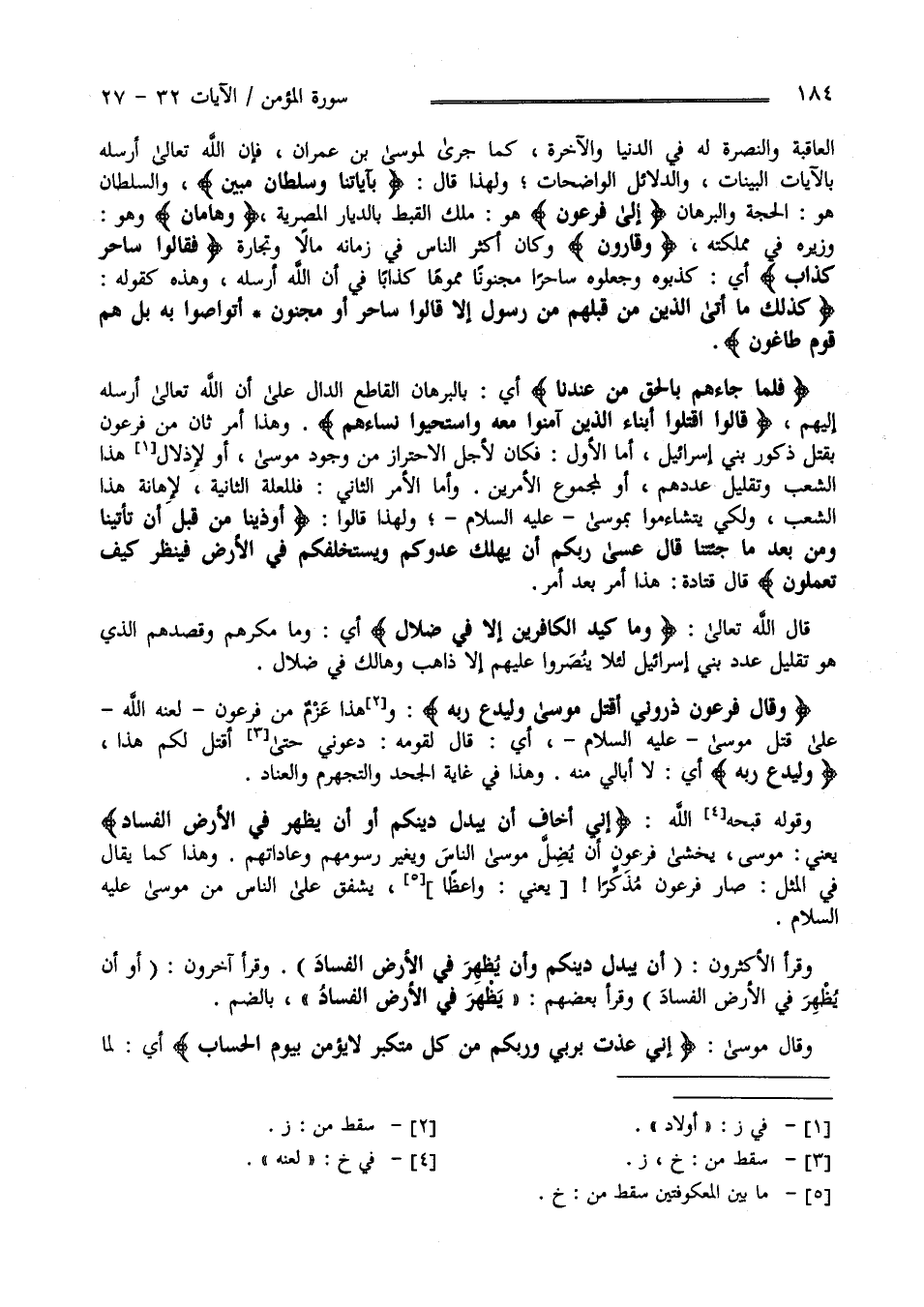 وَقَرَأَ الْأَكْثَرُونَ " أَنْ يُبَدِّلَ دِينَكُمْ وَأَنْ يُظْهِرَ فِي الْأَرْضِ الْفَسَادَ " وَقَرَأَ الْآخَرُونَ " أَنْ يُبَدِّلَ دِينَكُمْ أَوْ أَنْ يُظْهِرَ فِي الْأَرْضِ الْفَسَادَ " وَقَرَأَ بَعْضهمْ " يُظْهِر فِي الْأَرْض الْفَسَاد " بِالضَّمِّ .