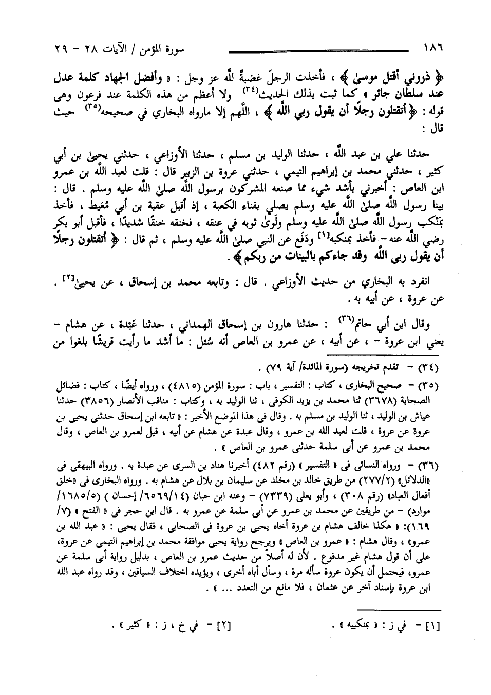 ذَرُونِي أَقْتُل مُوسَى " فَأَخَذَتْ الرَّجُل غَضْبَةٌ لِلَّهِ عَزَّ وَجَلَّ وَأَفْضَل الْجِهَاد كَلِمَة عَدْل عِنْد سُلْطَانٍ جَائِرٍ كَمَا ثَبَتَ بِذَلِكَ الْحَدِيثُ وَلَا أَعْظَم مِنْ هَذِهِ الْكَلِمَة عِنْد فِرْعَوْن وَهِيَ قَوْله " أَتَقْتُلُونَ رَجُلًا أَنْ يَقُولَ رَبِّي اللَّهُ " اللَّهُمَّ إِلَّا مَا رَوَاهُ الْبُخَارِيّ فِي صَحِيحه حَيْثُ قَالَ حَدَّثَنَا عَلِيُّ بْن عَبْد اللَّه حَدَّثَنَا الْوَلِيد بْن مُسْلِم حَدَّثَنَا الْأَوْزَاعِيّ حَدَّثَنِي يَحْيَى بْن أَبِي كَثِير حَدَّثَنِي مُحَمَّد بْن إِبْرَاهِيم التَّيْمِيّ حَدَّثَنِي عُرْوَة بْن الزُّبَيْر رَضِيَ اللَّه تَعَالَى عَنْهُمَا قَالَ : قُلْت لِعَبْدِ اللَّه بْن عَمْرو بْن الْعَاص رَضِيَ اللَّه عَنْهُمَا أَخْبِرْنِي بِأَشَدّ شَيْء صَنَعَهُ الْمُشْرِكُونَ بِرَسُولِ اللَّه صَلَّى اللَّه عَلَيْهِ وَسَلَّمَ قَالَ بَيْنَا رَسُول اللَّه صَلَّى اللَّه عَلَيْهِ وَسَلَّمَ يُصَلِّي بِفِنَاءِ الْكَعْبَة إِذْ أَقْبَلَ عُقْبَة بْن أَبِي مُعَيْط فَأَخَذَ بِمَنْكِبِ رَسُول اللَّه صَلَّى اللَّه عَلَيْهِ وَسَلَّمَ وَلَوَى ثَوْبه فِي عُنُقه فَخَنَقَهُ خَنْقًا شَدِيدًا فَأَقْبَلَ أَبُو بَكْر رَضِيَ اللَّه عَنْهُ فَأَخَذَ بِمَنْكِبِهِ وَدَفَعَهُ عَنْ النَّبِيِّ صَلَّى اللَّه عَلَيْهِ وَسَلَّمَ ثُمَّ قَالَ " أَتَقْتُلُونَ رَجُلًا أَنْ يَقُولَ رَبِّي اللَّهُ وَقَدْ جَاءَكُمْ بِالْبَيِّنَاتِ مِنْ رَبِّكُمْ " اِنْفَرَدَ بِهِ الْبُخَارِيُّ مِنْ حَدِيث الْأَوْزَاعِيّ قَالَ وَتَابَعَهُ مُحَمَّد اِبْن إِسْحَاق عَنْ إِبْرَاهِيم بْن عُرْوَة عَنْ أَبِيهِ بِهِ وَقَالَ اِبْن أَبِي حَاتِم حَدَّثَنَا هَارُون بْن إِسْحَاق الْهَمْدَانِيّ حَدَّثَنَا عَبْدَة عَنْ هِشَام - يَعْنِي اِبْن عُرْوَة - عَنْ أَبِيهِ عَنْ عَمْرو بْن الْعَاص رَضِيَ اللَّه عَنْهُ أَنَّهُ سُئِلَ مَا أَشَدّ مَا رَأَيْت قُرَيْشًا بَلَغُوا مِنْ