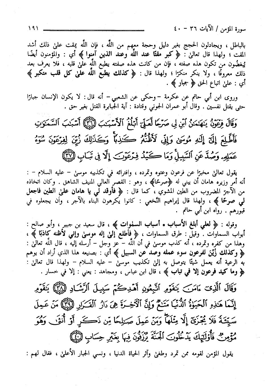 أَسْبَابَ السَّمَاوَاتِ فَأَطَّلِعَ إِلَى إِلَهِ مُوسَى وَإِنِّي لَأَظُنُّهُ كَاذِبًا وَكَذَلِكَ زُيِّنَ لِفِرْعَوْنَ سُوءُ عَمَلِهِ وَصُدَّ عَنِ السَّبِيلِ وَمَا كَيْدُ فِرْعَوْنَ إِلَّا فِي تَبَابٍ (37)