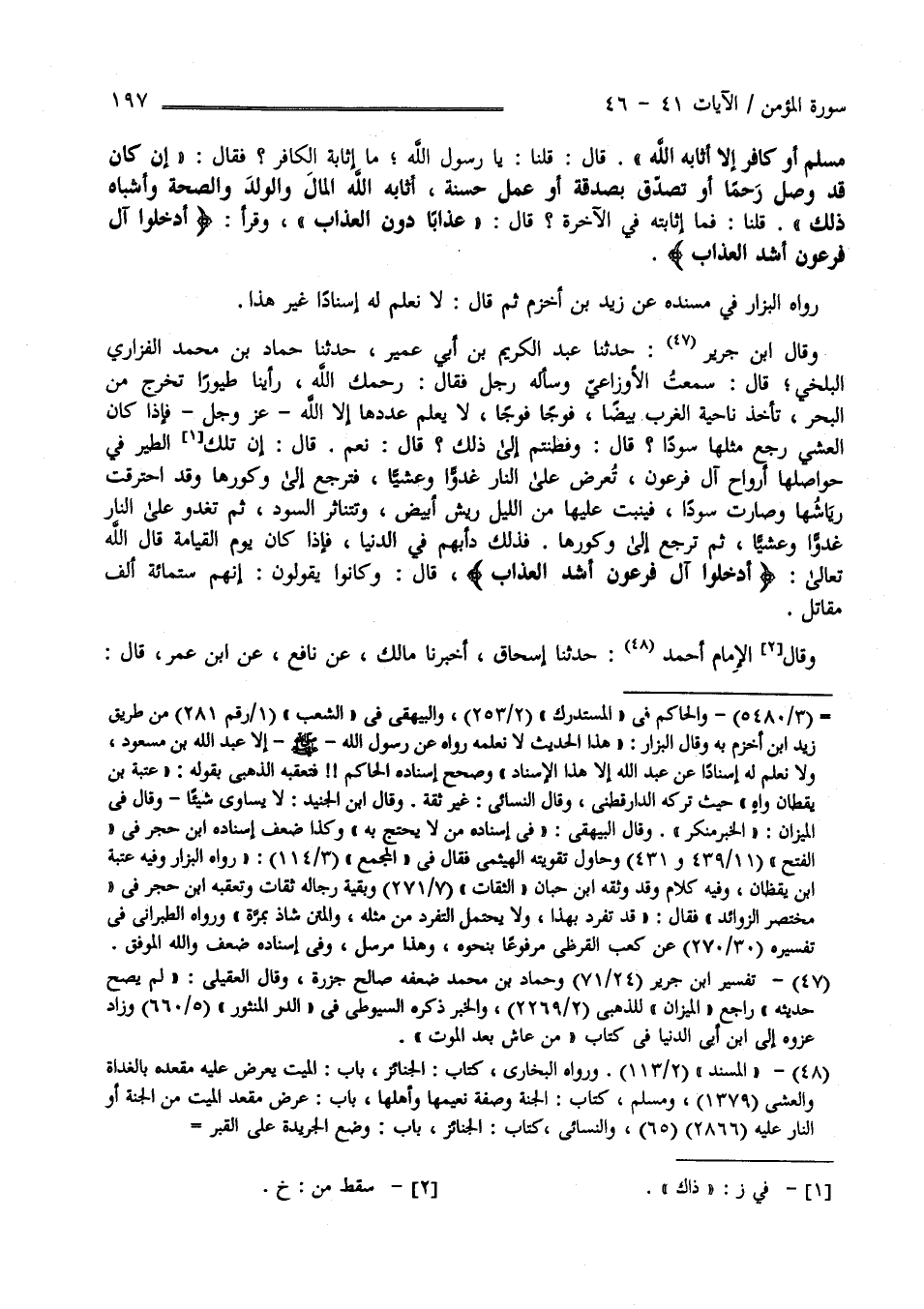 وَقَالَ اِبْن جَرِير ثنا عَبْد الْكَرِيم بْن أَبِي عُمَيْر ثنا حَمَّاد بْن مُحَمَّد الْفَزَارِيّ الْبَلْخِيّ قَالَ سَمِعْت الْأَوْزَاعِيّ وَسَأَلَهُ رَجُل فَقَالَ رَحِمَكَ اللَّه رَأَيْنَا طُيُورًا تَخْرُج مِنْ الْبَحْر تَأْخُذ نَاحِيَة الْغَرْب بِيضًا فَوْجًا فَوْجًا لَا يَعْلَم عَدَدَهَا إِلَّا اللَّهُ عَزَّ وَجَلَّ فَإِذَا كَانَ الْعَشِيّ رَجَعَ مِثْلهَا سَوْدَاء قَالَ وَفَطِنْتُمْ إِلَى ذَلِكَ ؟ قَالَ نَعَمْ قَالَ إِنَّ ذَلِكَ الطَّيْر فِي حَوَاصِلهَا أَرْوَاحُ آلِ فِرْعَوْنَ يُعْرَضُونَ عَلَى النَّار غُدُوًّا وَعَشِيًّا فَتَرْجِع إِلَى وُكُورهَا وَقَدْ اِحْتَرَقَتْ أَرْيَاشُهَا وَصَارَتْ سَوْدَاء فَيَنْبُتُ عَلَيْهَا مِنْ اللَّيْلِ رِيشٌ أَبْيَضُ وَيَتَنَاثَرُ الْأَسْوَدُ ثُمَّ تَغْدُو عَلَى النَّار غُدُوًّا وَعَشِيًّا ثُمَّ تَرْجِع إِلَى وُكُورهَا فَذَلِكَ دَأْبُهُمْ فِي الدُّنْيَا فَإِذَا كَانَ يَوْم الْقِيَامَة قَالَ اللَّهُ تَعَالَى " أَدْخِلُوا آلَ فِرْعَوْن أَشَدَّ الْعَذَاب " قَالَ وَكَانُوا يَقُولُونَ إِنَّهُمْ سِتُّمِائَةٍ أَلْف مُقَاتِل وَقَالَ الْإِمَام أَحْمَد ثنا إِسْحَاق ثنا مَالِك عَنْ نَافِع عَنْ اِبْن عُمَر رَضِيَ اللَّه عَنْهُمَا قَالَ