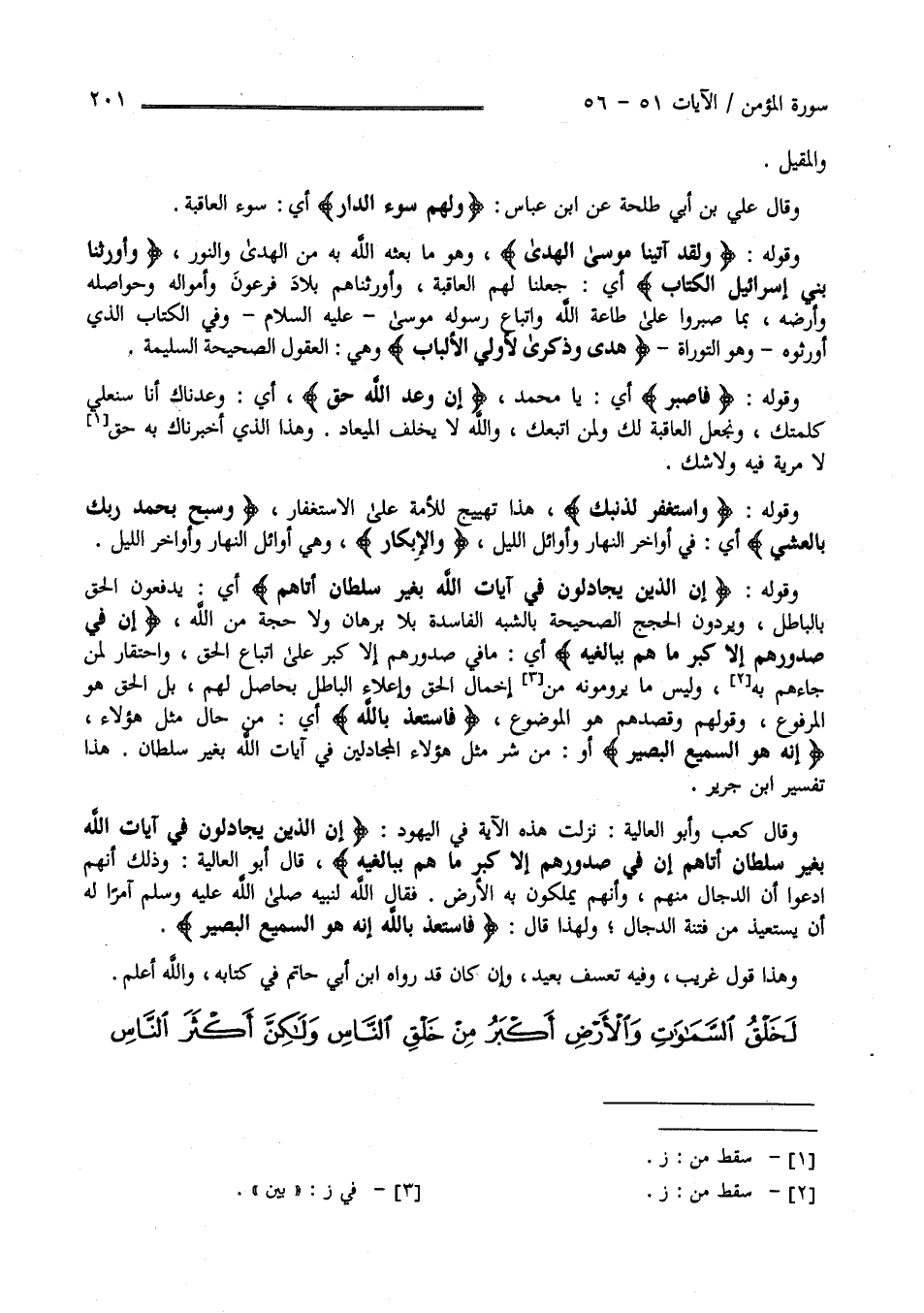 وَقَوْله تَعَالَى " إِنَّ الَّذِينَ يُجَادِلُونَ فِي آيَات اللَّه بِغَيْرِ سُلْطَان أَتَاهُمْ " أَيْ يَدْفَعُونَ الْحَقّ بِالْبَاطِلِ وَيَرُدُّونَ الْحُجَج الصَّحِيحَة بِالشُّبَهِ الْفَاسِدَة بِلَا بُرْهَان وَلَا حُجَّة مِنْ اللَّه " إِنْ فِي صُدُورهمْ إِلَّا كِبْر مَا هُمْ بِبَالِغِيهِ " أَيْ مَا فِي صُدُورهمْ إِلَّا كِبْر عَلَى اِتِّبَاع الْحَقّ وَاحْتِقَار لِمَنْ جَاءَهُمْ بِهِ وَلَيْسَ مَا يَرُومُونَهُ مِنْ إِخْمَاد الْحَقّ وَإِعْلَاء الْبَاطِل بِحَاصِلٍ لَهُمْ بَلْ الْحَقّ هُوَ الْمَرْفُوع وَقَوْلهمْ وَقَصْدهمْ هُوَ الْمَوْضُوع " فَاسْتَعِذْ بِاَللَّهِ " أَيْ مِنْ حَال مِثْل هَؤُلَاءِ أَوْ مِنْ شَرّ مِثْل هَؤُلَاءِ الْمُجَادِلِينَ فِي آيَات اللَّه بِغَيْرِ سُلْطَان هَذَا تَفْسِير اِبْن جَرِير وَقَالَ كَعْب وَأَبُو الْعَالِيَة نَزَلَتْ هَذِهِ الْآيَة فِي الْيَهُود " إِنَّ الَّذِينَ يُجَادِلُونَ فِي آيَات اللَّه بِغَيْرِ سُلْطَان أَتَاهُمْ إِنْ فِي صُدُورِهِمْ إِلَّا كِبْرٌ مَا هُمْ بِبَالِغِيهِ " قَالَ أَبُو الْعَالِيَة وَذَلِكَ أَنَّهُمْ اِدَّعَوْا أَنَّ الدَّجَّال مِنْهُمْ وَأَنَّهُمْ يَمْلِكُونَ بِهِ الْأَرْض فَقَالَ اللَّه تَعَالَى لِنَبِيِّهِ صَلَّى اللَّه عَلَيْهِ وَسَلَّمَ آمِرًا لَهُ أَنْ يَسْتَعِيذ مِنْ فِتْنَة الدَّجَّال وَلِهَذَا قَالَ عَزَّ وَجَلَّ " فَاسْتَعِذْ بِاَللَّهِ إِنَّهُ هُوَ السَّمِيع الْبَصِير " وَهَذَا قَوْل غَرِيب وَفِيهِ تَعَسُّف بَعِيدٌ وَإِنْ كَانَ قَدْ رَوَاهُ اِبْن أَبِي حَاتِم فِي كِتَابه وَاَللَّه سُبْحَانه وَتَعَالَى أَعْلَم .