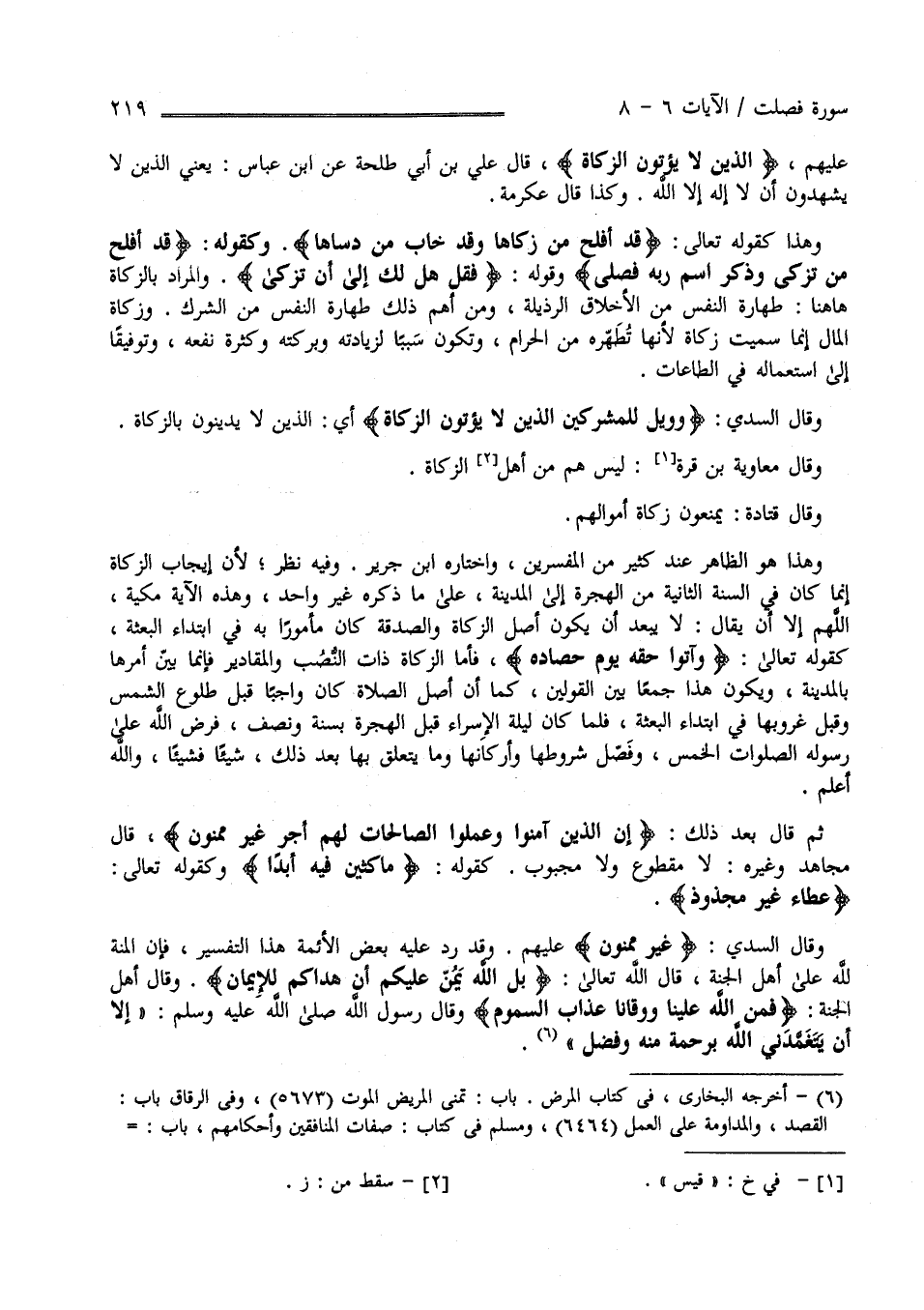 " الَّذِينَ لَا يُؤْتُونَ الزَّكَاة " قَالَ عَلِيّ بْن أَبِي طَلْحَة عَنْ اِبْن عَبَّاس يَعْنِي الَّذِينَ لَا يَشْهَدُونَ أَنْ لَا إِلَه إِلَّا اللَّه وَكَذَا قَالَ عِكْرِمَة وَهَذَا كَقَوْلِهِ تَبَارَكَ وَتَعَالَى " قَدْ أَفْلَحَ مَنْ زَكَّاهَا وَقَدْ خَابَ مَنْ دَسَّاهَا" وَكَقَوْلِهِ جَلَّتْ عَظَمَته " قَدْ أَفْلَحَ مَنْ تَزَكَّى وَذَكَرَ اِسْم رَبّه فَصَلَّى " وَقَوْله عَزَّ وَجَلَّ " فَقُلْ هَلْ لَك إِلَى أَنْ تَزَكَّى " وَالْمُرَاد بِالزَّكَاةِ هَهُنَا طَهَارَة النَّفْس مِنْ الْأَخْلَاق الرَّذِيلَة وَمِنْ أَهَمّ ذَلِكَ طَهَارَة النَّفْس مِنْ الشِّرْك وَزَكَاة الْمَال إِنَّمَا سُمِّيَتْ زَكَاة لِأَنَّهَا تُطَهِّرهُ مِنْ الْحَرَام وَتَكُون سَبَبًا لِزِيَادَتِهِ وَبَرَكَته وَكَثْرَة نَفْعه وَتَوْفِيقًا إِلَى اِسْتِعْمَاله فِي الطَّاعَات .