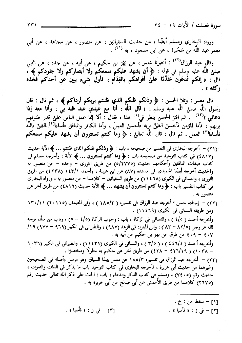 وَرَوَاهُ الْبُخَارِيّ وَمُسْلِم أَيْضًا مِنْ حَدِيث السُّفْيَانَيْنِ كِلَاهُمَا عَنْ مَنْصُور عَنْ مُجَاهِد عَنْ أَبِي مَعْمَر عَبْد اللَّه بْن سَخْبَرَة عَنْ اِبْن مَسْعُود رَضِيَ اللَّه عَنْهُ بِهِ وَقَالَ عَبْد الرَّزَّاق حَدَّثَنَا مَعْمَر عَنْ بَهْز بْن حَكِيم عَنْ أَبِيهِ عَنْ جَدّه عَنْ النَّبِيّ صَلَّى اللَّه عَلَيْهِ وَسَلَّمَ فِي قَوْله تَعَالَى " أَنْ يَشْهَد عَلَيْكُمْ سَمْعكُمْ وَلَا أَبْصَاركُمْ وَلَا جُلُودكُمْ " قَالَ " إِنَّكُمْ تُدْعَوْنَ يَوْم الْقِيَامَة مُفَدَّمًا عَلَى أَفْوَاهكُمْ بِالْفِدَامِ فَأَوَّل شَيْء يُبَيِّن عَنْ أَحَدكُمْ فَخِذه وَكَفّه " .
