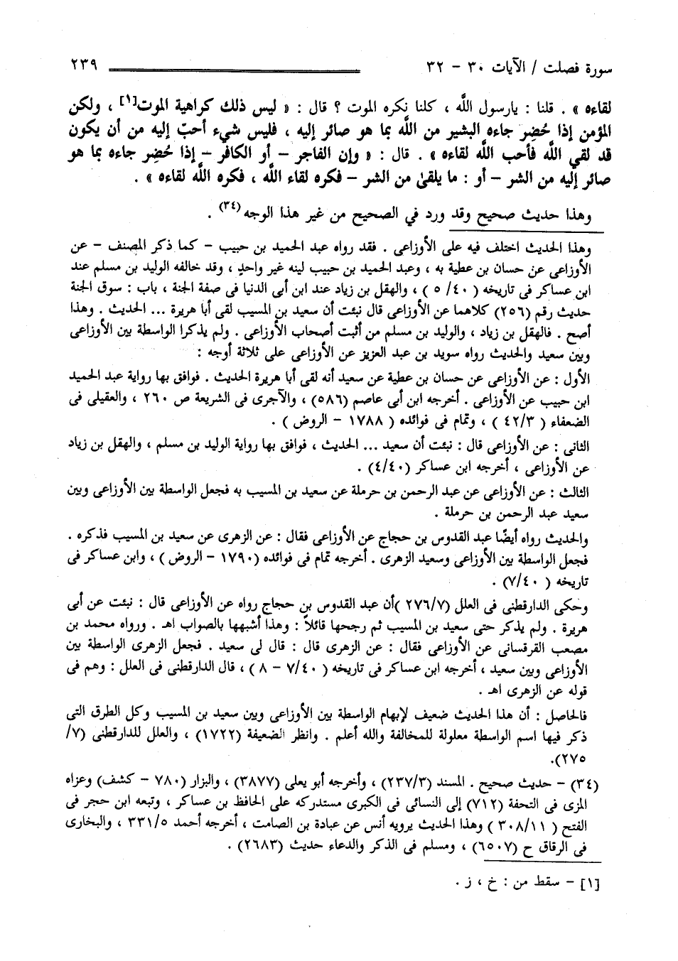 لِقَاءَهُ " قُلْنَا يَا رَسُول اللَّه كُلّنَا نَكْرَه الْمَوْت قَالَ صَلَّى اللَّه عَلَيْهِ وَسَلَّمَ " لَيْسَ ذَلِكَ كَرَاهِيَة الْمَوْت وَلَكِنَّ الْمُؤْمِن إِذَا حَضَرَ جَاءَهُ الْبَشِير مِنْ اللَّه تَعَالَى بِمَا هُوَ صَائِر إِلَيْهِ فَلَيْسَ شَيْء أَحَبَّ إِلَيْهِ مِنْ أَنْ يَكُون قَدْ لَقِيَ اللَّه تَعَالَى فَأَحَبَّ اللَّه لِقَاءَهُ قَالَ وَإِنَّ الْفَاجِر أَوْ الْكَافِر إِذَا حَضَرَ جَاءَهُ بِمَا هُوَ صَائِر إِلَيْهِ مِنْ الشَّرّ أَوْ مَا يَلْقَى مِنْ الشَّرّ فَكَرِهَ لِقَاء اللَّه فَكَرِهَ اللَّه لِقَاءَهُ" وَهَذَا حَدِيث صَحِيح وَقَدْ وَرَدَ فِي الصَّحِيح مِنْ غَيْر هَذَا الْوَجْه