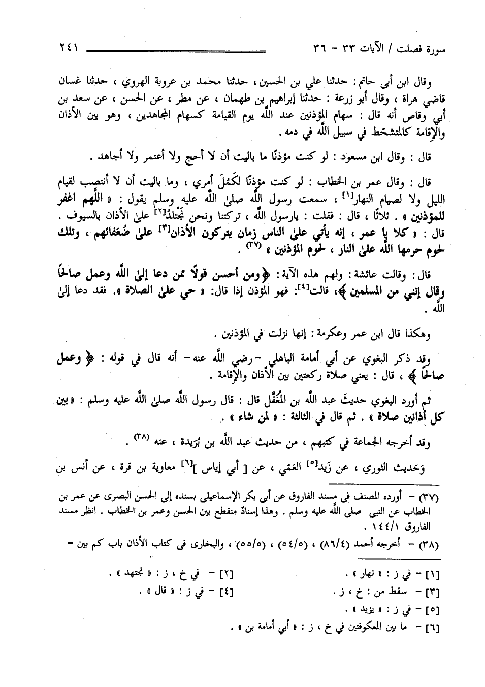 قَالَ : وَقَالَ اِبْن مَسْعُود رَضِيَ اللَّه عَنْهُ لَوْ كُنْت مُؤَذِّنًا مَا بَالَيْت أَنْ لَا أَحُجّ وَلَا أَعْتَمِر وَلَا أُجَاهِد قَالَ وَقَالَ عُمَر بْن الْخَطَّاب رَضِيَ اللَّه عَنْهُ لَوْ كُنْت مُؤَذِّنًا لَكَمُلَ أَمْرِي وَمَا بَالَيْت أَنْ لَا أَنْتَصِب لِقِيَامِ اللَّيْل وَلَا لِصِيَامِ النَّهَار سَمِعْت رَسُول اللَّه صَلَّى اللَّه عَلَيْهِ وَسَلَّمَ يَقُول " اللَّهُمَّ اِغْفِرْ لِلْمُؤَذِّنِينَ ثَلَاثًا " قَالَ : فَقُلْت يَا رَسُول اللَّه تَرَكْتنَا وَنَحْنُ نَجْتَلِد عَلَى الْأَذَان بِالسُّيُوفِ قَالَ " كَلَّا يَا عُمَر إِنَّهُ سَيَأْتِي عَلَى النَّاس زَمَان يَتْرُكُونَ الْأَذَان عَلَى ضُعَفَائِهِمْ وَتِلْكَ لُحُوم حَرَّمَهَا اللَّه عَزَّ وَجَلَّ عَلَى النَّار لُحُوم الْمُؤَذِّنِينَ " قَالَ : وَقَالَتْ عَائِشَة رَضِيَ اللَّه تَعَالَى عَنْهَا وَلَهُمْ هَذِهِ الْآيَة " وَمَنْ أَحْسَن قَوْلًا مِمَّنْ دَعَا إِلَى اللَّه وَعَمِلَ صَالِحًا وَقَالَ إِنَّنِي مِنْ الْمُسْلِمِينَ " قَالَتْ فَهُوَ الْمُؤَذِّن إِذَا قَالَ حَيَّ عَلَى الصَّلَاة فَقَدْ دَعَا إِلَى اللَّه وَهَكَذَا قَالَ اِبْن عُمَر رَضِيَ اللَّه عَنْهُمَا وَعِكْرِمَة إِنَّهَا نَزَلَتْ فِي الْمُؤَذِّنِينَ وَقَدْ ذَكَرَ الْبَغَوِيّ عَنْ أَبِي أُمَامَةَ الْبَاهِلِيّ رَضِيَ اللَّه عَنْهُ أَنَّهُ قَالَ فِي قَوْله عَزَّ وَجَلَّ " وَعَمِلَ صَالِحًا" يَعْنِي صَلَاة رَكْعَتَيْنِ بَيْن الْأَذَان وَالْإِقَامَة ثُمَّ أَوْرَدَ الْبَغَوِيّ حَدِيث عَبْد اللَّه بْن الْمُغَفَّل رَضِيَ اللَّه عَنْهُ قَالَ : قَالَ رَسُول اللَّه صَلَّى اللَّه عَلَيْهِ وَسَلَّمَ" بَيْن كُلّ أَذَانَيْنِ صَلَاة - ثُمَّ قَالَ فِي الثَّالِثَة - لِمَنْ شَاءَ " وَقَدْ أَخْرَجَهُ الْجَمَاعَة فِي كُتُبهمْ مِنْ حَدِيث عَبْد اللَّه بْن بُرَيْدَة عَنْهُ وَحَدِيث الثَّوْرِيّ عَنْ زَيْد الْعَمِّيّ عَنْ أَبِي إِيَاس مُعَاوِيَة بْن قُرَّة عَنْ أَنَس بْن