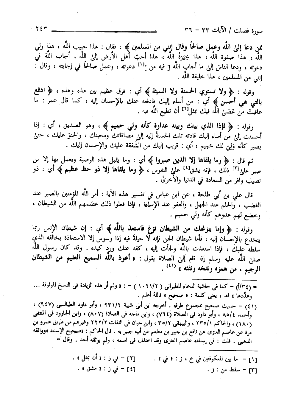 قَالَ عَزَّ وَجَلَّ " وَمَا يُلَقَّاهَا إِلَّا الَّذِينَ صَبَرُوا " أَيْ وَمَا يَقْبَل هَذِهِ الْوَصِيَّة وَيَعْمَل بِهَا إِلَّا مَنْ صَبْر عَلَى ذَلِكَ فَإِنَّهُ يَشُقّ عَلَى النُّفُوس" وَمَا يُلَقَّاهَا إِلَّا ذُو حَظّ عَظِيم " أَيْ ذُو نُصِيب وَافِر مِنْ السَّعَادَة فِي الدُّنْيَا وَالْآخِرَة قَالَ عَلِيّ بْن أَبِي طَلْحَة عَنْ اِبْن عَبَّاس فِي تَفْسِير هَذِهِ الْآيَة : أَمَرَ اللَّه الْمُؤْمِنِينَ بِالصَّبْرِ عِنْد الْغَضَب وَالْحِلْم عِنْد الْجَهْل وَالْعَفْو عِنْد الْإِسَاءَة فَإِذَا فَعَلُوا ذَلِكَ عَصَمَهُمْ اللَّه مِنْ الشَّيْطَان وَخَضَعَ لَهُمْ عَدُوّهُمْ كَأَنَّهُ وَلِيّ حَمِيم.