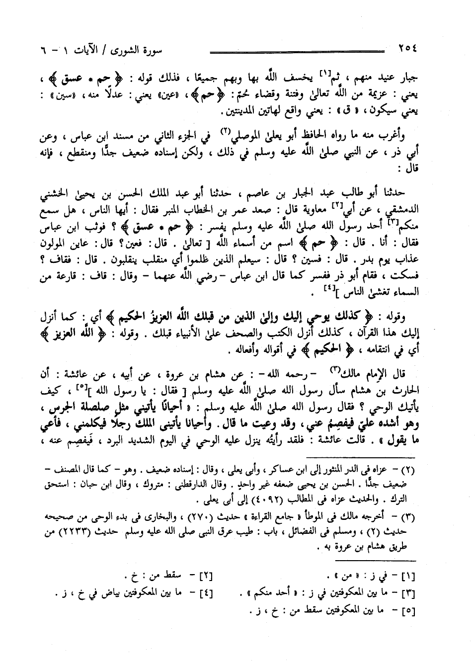 قَدْ تَقَدَّمَ الْكَلَام عَلَى الْحُرُوف الْمُقَطَّعَة وَقَدْ رَوَى اِبْن جَرِير هَهُنَا أَثَرًا غَرِيبًا عَجِيبًا مُنْكَرًا فَقَالَ أَخْبَرَنَا أَحْمَد بْن زُهَيْر حَدَّثَنَا عَبْد الْوَهَّاب بْن نَجْدَة الْحَوْطِيّ حَدَّثَنَا أَبُو الْمُغِيرَة عَبْد الْقُدُّوس بْن الْحَجَّاج عَنْ أَرْطَاة بْن الْمُنْذِر قَالَ : جَاءَ رَجُل إِلَى اِبْن عَبَّاس رَضِيَ اللَّه عَنْهُمَا قَالَ لَهُ وَعِنْده حُذَيْفَة بْن الْيَمَان رَضِيَ اللَّه تَعَالَى عَنْهُ أَخْبِرْنِي عَنْ تَفْسِير قَوْل اللَّه تَعَالَى " حم عسق " قَالَ فَأَطْرَقَ ثُمَّ أَعْرَضَ عَنْهُ ثُمَّ كَرَّرَ مَقَالَته فَأَعْرَضَ عَنْهُ فَلَمْ يُجِبْهُ بِشَيْءٍ وَكَرِهَ مَقَالَته ثُمَّ كَرَّرَهَا الثَّالِثَة فَلَمْ يُحِرْ إِلَيْهِ شَيْئًا فَقَالَ لَهُ حُذَيْفَة رَضِيَ اللَّه عَنْهُ أَنَا أُنَبِّئك بِهَا قَدْ عَرَفْت لِمَ كَرِهَهَا نَزَلَتْ فِي رَجُل مِنْ أَهْل بَيْته يُقَال لَهُ عَبْد الْإِلَه وَعَبْد اللَّه يَنْزِل عَلَى نَهَر مِنْ أَنْهَار الْمَشْرِق تُبْنَى عَلَيْهِ مَدِينَتَانِ يَشُقّ النَّهَر بَيْنهمَا شَقًّا فَإِذَا أَذِنَ اللَّه تَبَارَكَ وَتَعَالَى فِي زَوَال مُلْكهمْ وَانْقِطَاع دَوْلَتهمْ وَمُدَّتهمْ بَعَثَ اللَّه عَزَّ وَجَلَّ عَلَى إِحْدَاهُمَا نَارًا لَيْلًا فَتُصْبِح سَوْدَاء مُظْلِمَة وَقَدْ اِحْتَرَقَتْ كَأَنَّهَا لَمْ تَكُنْ مَكَانهَا وَتُصْبِح صَاحِبَتهَا مُتَعَجِّبَة كَيْف أَفْلَتَتْ ؟ فَمَا هُوَ إِلَّا بَيَاض يَوْمهَا ذَلِكَ حَتَّى يَجْتَمِع فِيهَا كُلّ جَبَّار عَنِيد مِنْهُمْ ثُمَّ يَخْسِف اللَّه بِهَا وَبِهِمْ جَمِيعًا فَذَلِكَ قَوْله تَعَالَى " حم عسق " يَعْنِي عَزِيمَة مِنْ اللَّه تَعَالَى وَفِتْنَة وَقَضَاء حم عين يَعْنِي عَدْلًا مِنْهُ سِين يَعْنِي سَيَكُونُ ق يَعْنِي وَاقِع بِهَاتَيْنِ الْمَدِينَتَيْنِ وَأَغْرَب مِنْهُ مَا رَوَاهُ الْحَافِظ أَبُو يَعْلَى الْمَوْصِلِيّ فِي الْجُزْء الثَّانِي مِنْ مُسْنَد اِبْن عَبَّاس رَضِيَ اللَّه عَنْهُ عَنْ أَبِي ذَرّ رَضِيَ اللَّه عَنْهُ عَنْ النَّبِيّ صَلَّى اللَّه عَلَيْهِ وَسَلَّمَ فِي ذَلِكَ وَلَكِنَّ إِسْنَاده ضَعِيف جِدًّا وَمُنْقَطِع فَإِنَّهُ قَالَ حَدَّثَنَا أَبُو طَالِب عَبْد الْجَبَّار بْن عَاصِم حَدَّثَنَا أَبُو عَبْد اللَّه الْحَسَن بْن يَحْيَى الْخُشَنِيّ الدِّمَشْقِيّ عَنْ أَبِي مُعَاوِيَة قَالَ : صَعِدَ عُمَر بْن الْخَطَّاب رَضِيَ اللَّه عَنْهُ الْمِنْبَر فَقَالَ : أَيّهَا النَّاس هَلْ سَمِعَ مِنْكُمْ أَحَد رَسُول اللَّه صَلَّى اللَّه عَلَيْهِ وَسَلَّمَ يُفَسِّر " حم عسق " فَوَثَبَ اِبْن عَبَّاس رَضِيَ اللَّه عَنْهُ فَقَالَ أَنَا قَالَ حم اِسْم مِنْ أَسْمَاء اللَّه تَعَالَى قَالَ فعين ؟ قَالَ عَايَنَ الْمُوَلُّونَ عَذَاب يَوْم بَدْر قَالَ فَسِين ؟ قَالَ سَيَعْلَمُ الَّذِينَ ظَلَمُوا أَيّ مُنْقَلَب يَنْقَلِبُونَ قَالَ فَقَاف ؟ فَسَكَتَ فَقَامَ أَبُو ذَرّ فَفَسَّرَ كَمَا قَالَ اِبْن عَبَّاس رَضِيَ اللَّه عَنْهُمَا وَقَالَ قَاف قَارِعَة مِنْ السَّمَاء تَغْشَى النَّاس .