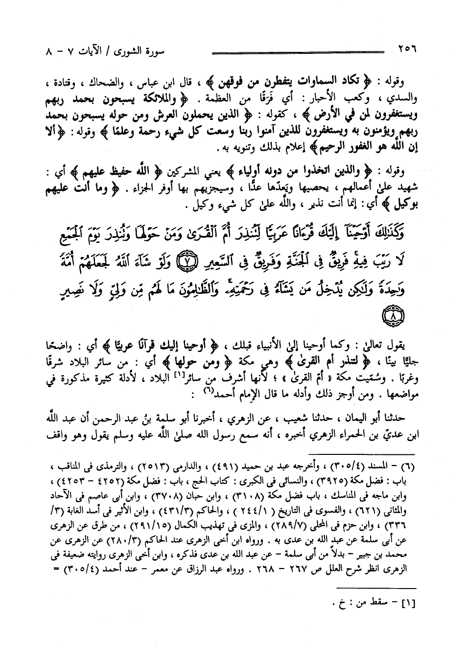 وَكَذَلِكَ أَوْحَيْنَا إِلَيْكَ قُرْآنًا عَرَبِيًّا لِتُنْذِرَ أُمَّ الْقُرَى وَمَنْ حَوْلَهَا وَتُنْذِرَ يَوْمَ الْجَمْعِ لَا رَيْبَ فِيهِ فَرِيقٌ فِي الْجَنَّةِ وَفَرِيقٌ فِي السَّعِيرِ