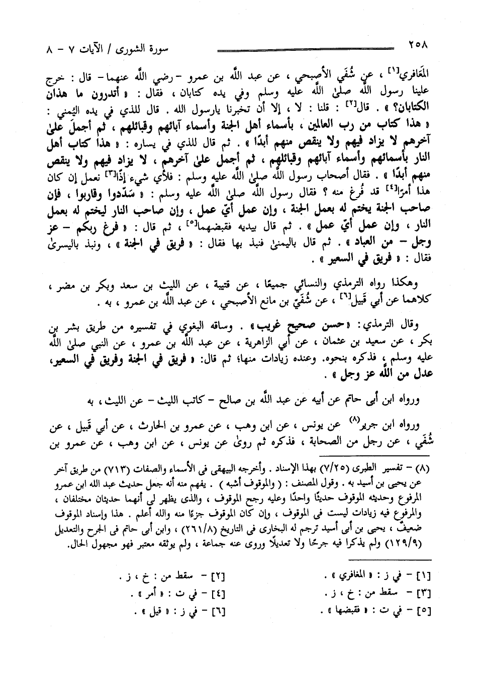 فَقَالَ أَصْحَاب رَسُول اللَّه صَلَّى اللَّه عَلَيْهِ وَسَلَّمَ فَلِأَيِّ شَيْء نَعْمَل إِنْ كَانَ هَذَا أَمْر قَدْ فُرِغَ مِنْهُ قَالَ رَسُول اللَّه صَلَّى اللَّه عَلَيْهِ وَسَلَّمَ " سَدِّدُوا وَقَارِبُوا فَإِنَّ صَاحِب الْجَنَّة يُخْتَم لَهُ بِعَمَلِ أَهْل الْجَنَّة وَإِنْ عَمِلَ أَيّ عَمَل وَإِنَّ صَاحِب النَّار يُخْتَم لَهُ بِعَمَلِ أَهْل النَّار وَإِنْ عَمِلَ أَيّ عَمَل" ثُمَّ قَالَ صَلَّى اللَّه عَلَيْهِ وَسَلَّمَ بِيَدِهِ فَقَبَضَهَا ثُمَّ قَالَ " فَرَغَ رَبّكُمْ عَزَّ وَجَلَّ مِنْ الْعِبَاد - ثُمَّ قَالَ بِالْيُمْنَى فَنَبَذَ بِهَا فَقَالَ - فَرِيق فِي الْجَنَّة - وَنَبَذَ بِالْيُسْرَى وَقَالَ - فَرِيق فِي السَّعِير " وَهَكَذَا رَوَاهُ التِّرْمِذِيّ وَالنَّسَائِيّ جَمِيعًا عَنْ قُتَيْبَة عَنْ اللَّيْث بْن سَعْد وَبَكْر بْن مُضَر كِلَاهُمَا عَنْ أَبِي قُبَيْل عَنْ شُفَيّ بْن مَاتِع الْأَصْبَحِيّ عَنْ عَبْد اللَّه بْن عَمْرو رَضِيَ اللَّه عَنْهُمَا بِهِ وَقَالَ التِّرْمِذِيّ حَسَن صَحِيح غَرِيب وَسَاقَهُ الْبَغَوِيّ فِي تَفْسِيره مِنْ طَرِيق بِشْر بْن بَكْر عَنْ سَعِيد بْن عُثْمَان عَنْ أَبِي الزَّاهِرِيَّة عَنْ عَبْد اللَّه بْن عَمْرو رَضِيَ اللَّه عَنْهُمَا عَنْ النَّبِيّ صَلَّى اللَّه عَلَيْهِ وَسَلَّمَ فَذَكَرَهُ بِنَحْوِهِ وَعِنْده زِيَادَات مِنْهَا - ثُمَّ فَرِيق فِي الْجَنَّة وَفَرِيق فِي السَّعِير عَدْل مِنْ اللَّه عَزَّ وَجَلَّ - وَرَوَاهُ اِبْن أَبِي حَاتِم عَنْ أَبِيهِ عَنْ عَبْد اللَّه بْن صَالِح كَاتِب اللَّيْث عَنْ اللَّيْث بِهِ وَرَوَاهُ اِبْن جَرِير عَنْ يُونُس عَنْ اِبْن وَهْب عَنْ عَمْرو بْنالْحَارِث عَنْ أَبِي قُبَيْل عَنْ شُفَيّ عَنْ رَجُل مِنْ الصَّحَابَة رَضِيَ اللَّه عَنْهُمْ فَذَكَرَهُ ثُمَّ رُوِيَ عَنْ يُونُس عَنْ اِبْن وَهْب عَنْ عَمْرو بْن