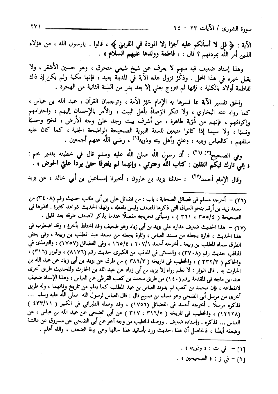 الْآيَة " قُلْ لَا أَسْأَلكُمْ عَلَيْهِ أَجْرًا إِلَّا الْمَوَدَّة فِي الْقُرْبَى" قَالُوا يَا رَسُول اللَّه مَنْ هَؤُلَاءِ الَّذِينَ أَمَرَ اللَّه بِمَوَدَّتِهِمْ ؟ قَالَ " فَاطِمَة وَوَلَدهَا رَضِيَ اللَّه عَنْهُمْ" وَهَذَا إِسْنَاد ضَعِيف فِيهِ مُبْهَم لَا يُعْرَف عَنْ شَيْخ شِيعِيّ مُخْتَرِق وَهُوَ حُسَيْن الْأَشْقَر وَلَا يُقْبَل خَبَره فِي هَذَا الْمَحِلّ وَذِكْرُ نُزُول الْآيَة فِي الْمَدِينَة بَعِيد فَإِنَّهَا مَكِّيَّة وَلَمْ يَكُنْ إِذْ ذَاكَ لِفَاطِمَة رَضِيَ اللَّه عَنْهَا أَوْلَاد بِالْكُلِّيَّةِ فَإِنَّهَا لَمْ تَتَزَوَّج بِعَلِيٍّ رَضِيَ اللَّه عَنْهُ إِلَّا بَعْد بَدْر مِنْ السَّنَة الثَّانِيَة مِنْ الْهِجْرَة وَالْحَقّ تَفْسِير هَذِهِ الْآيَة بِمَا فَسَّرَهَا بِهِ حَبْر الْأُمَّة وَتُرْجُمَان الْقُرْآن عَبْد اللَّه بْن عَبَّاس رَضِيَ اللَّه عَنْهُمَا كَمَا رَوَاهُ عَنْهُ الْبُخَارِيّ وَلَا نُنْكِر الْوَصَاة بِأَهْلِ الْبَيْت وَالْأَمْر بِالْإِحْسَانِ إِلَيْهِمْ وَاحْتِرَامهمْ وَإِكْرَامهمْ فَإِنَّهُمْ مِنْ ذُرِّيَّة طَاهِرَة مِنْ أَشْرَف بَيْت وُجِدَ عَلَى وَجْه الْأَرْض فَخْرًا وَحَسَبًا وَنَسَبًا وَلَا سِيَّمَا إِذَا كَانُوا مُتَّبِعِينَ لِلسُّنَّةِ النَّبَوِيَّة الصَّحِيحَة الْوَاضِحَة الْجَلِيَّة كَمَا كَانَ عَلَيْهِ سَلَفهمْ كَالْعَبَّاسِ وَبَنِيهِ وَعَلِيّ وَأَهْل بَيْته وَذُرِّيَّته رَضِيَ اللَّه عَنْهُمْ أَجْمَعِينَ .