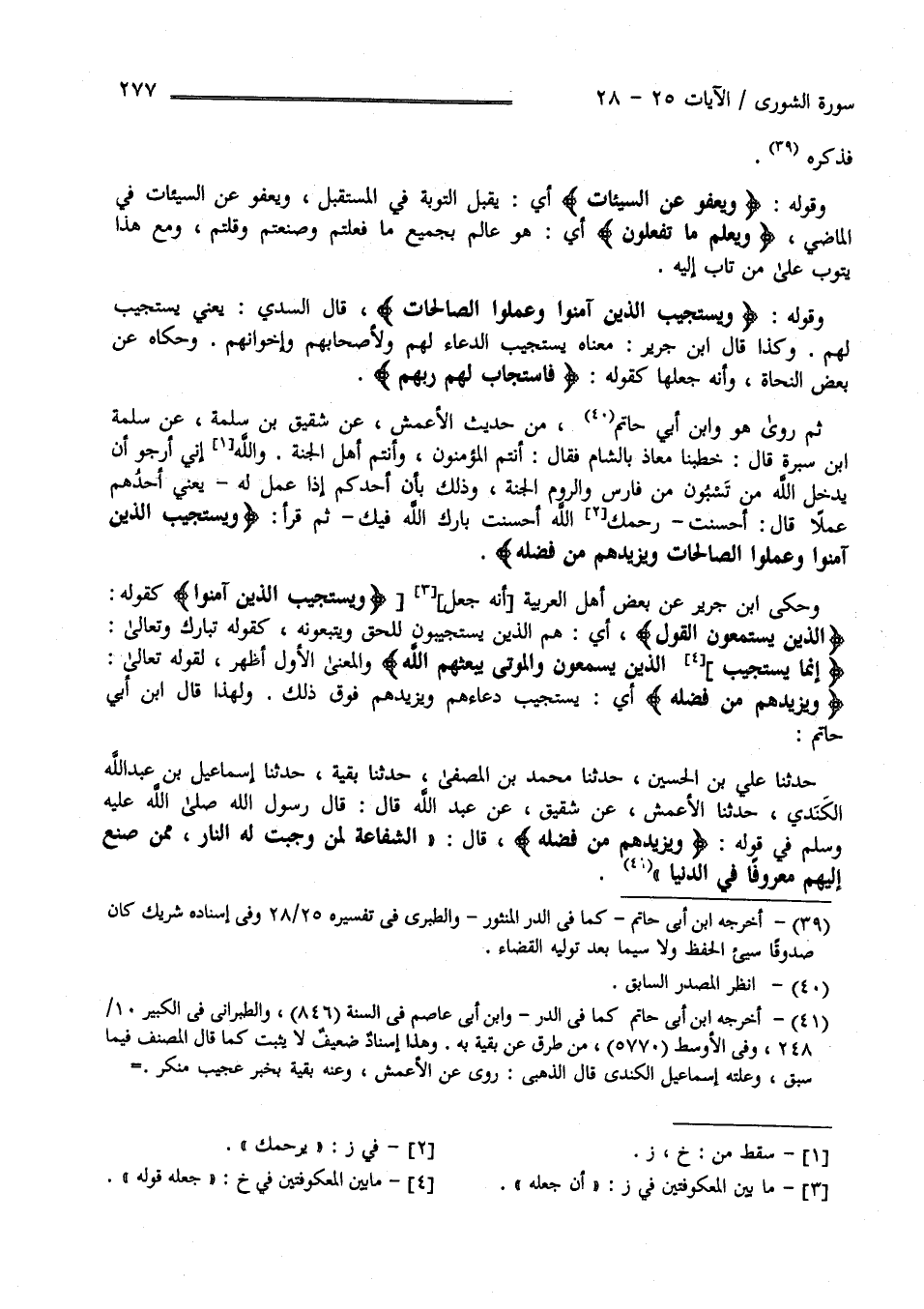 فَذَكَرَهُ وَقَوْله عَزَّ وَجَلَّ " وَيَعْفُو عَنْ السَّيِّئَات" أَيْ يَقْبَل التَّوْبَة فِي الْمُسْتَقْبَل وَيَعْفُو عَنْ السَّيِّئَات فِي الْمَاضِي " وَيَعْلَم مَا تَفْعَلُونَ " أَيْ هُوَ عَالِم بِجَمِيعِ مَا فَعَلْتُمْ وَصَنَعْتُمْ وَقُلْتُمْ وَمَعَ هَذَا يَتُوب عَلَى مَنْ تَابَ إِلَيْهِ .