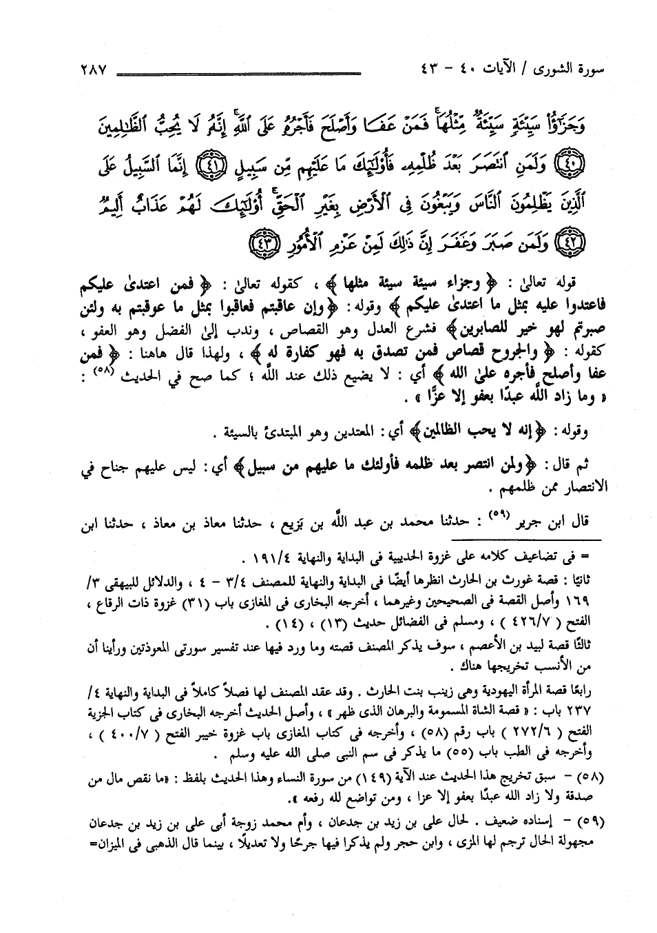 قَوْله تَبَارَكَ وَتَعَالَى" وَجَزَاء سَيِّئَة سَيِّئَة مِثْلهَا " كَقَوْلِهِ تَعَالَى " فَمَنْ اِعْتَدَى عَلَيْكُمْ فَاعْتَدُوا عَلَيْهِ بِمِثْلِ مَا اِعْتَدَى عَلَيْكُمْ" وَكَقَوْلِهِ " وَإِنْ عَاقَبْتُمْ فَعَاقِبُوا بِمِثْلِ مَا عُوقِبْتُمْ بِهِ " الْآيَة فَشَرَعَ الْعَدْل وَهُوَ الْقِصَاص وَنَدَبَ إِلَى الْفَضْل وَهُوَ الْعَفْو كَقَوْلِهِ جَلَّ وَعَلَا " وَالْجُرُوح قِصَاص فَمَنْ تَصَدَّقَ بِهِ فَهُوَ كَفَّارَة لَهُ " وَلِهَذَا قَالَ هَهُنَا " فَمَنْ عَفَا وَأَصْلَحَ فَأَجْره عَلَى اللَّه " أَيْ لَا يَضِيع ذَلِكَ عِنْد اللَّه كَمَا صَحَّ ذَلِكَ فِي الْحَدِيث " وَمَا زَادَ اللَّه تَعَالَى عَبْدًا بِعَفْوٍ إِلَّا عِزًّا " وَقَوْله تَعَالَى " إِنَّهُ لَا يُحِبّ الظَّالِمِينَ " أَيْ الْمُعْتَدِينَ وَهُوَ الْمُبْتَدِئ بِالسَّيِّئَةِ.
