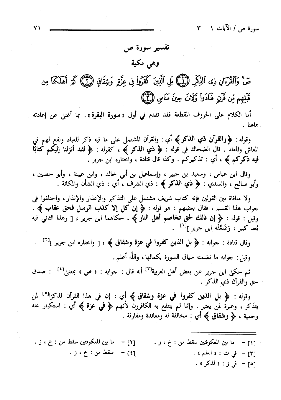 وَقَالَ اِبْن عَبَّاس رَضِيَ اللَّه عَنْهُمَا وَسَعِيد بْن جُبَيْر وَإِسْمَاعِيل بْن أَبِي خَالِد وَابْن عُيَيْنَة وَأَبُو حُصَيْن وَأَبُو صَالِح وَالسُّدِّيّ " ذِي الذِّكْر " ذِي الشَّرَف أَيْ ذِي الشَّأْن وَالْمَكَانَة وَلَا مُنَافَاة بَيْن الْقَوْلَيْنِ فَإِنَّهُ كِتَاب شَرِيف مُشْتَمِل عَلَى التَّذْكِير وَالْإِعْذَار وَالْإِنْذَار وَاخْتَلَفُوا فِي جَوَاب هَذَا الْقَسَم فَقَالَ بَعْضهمْ هُوَ قَوْله تَعَالَى " إِنْ كُلٌّ إِلَّا كَذَّبَ الرُّسُل فَحَقَّ عِقَاب " وَقِيلَ قَوْله تَعَالَى " إِنَّ ذَلِكَ لَحَقٌّ تَخَاصُم أَهْل النَّار " حَكَاهُمَا اِبْن جَرِير وَهَذَا الثَّانِي فِيهِ بُعْد كَبِير وَضَعَّفَهُ اِبْن جَرِير وَقَالَ قَتَادَة جَوَابه" بَلْ الَّذِينَ كَفَرُوا فِي عِزَّة وَشِقَاق " وَاخْتَارَهُ اِبْن جَرِير ثُمَّ حَكَى اِبْن جَرِير عَنْ بَعْض أَهْل الْعَرَبِيَّة أَنَّهُ قَالَ جَوَابه " ص " بِمَعْنَى صِدْق حَقّ " وَالْقُرْآن ذِي الذِّكْر " وَقِيلَ جَوَابه مَا تَضَمَّنَهُ سِيَاق السُّورَة بِكَمَالِهَا وَاَللَّه أَعْلَم .