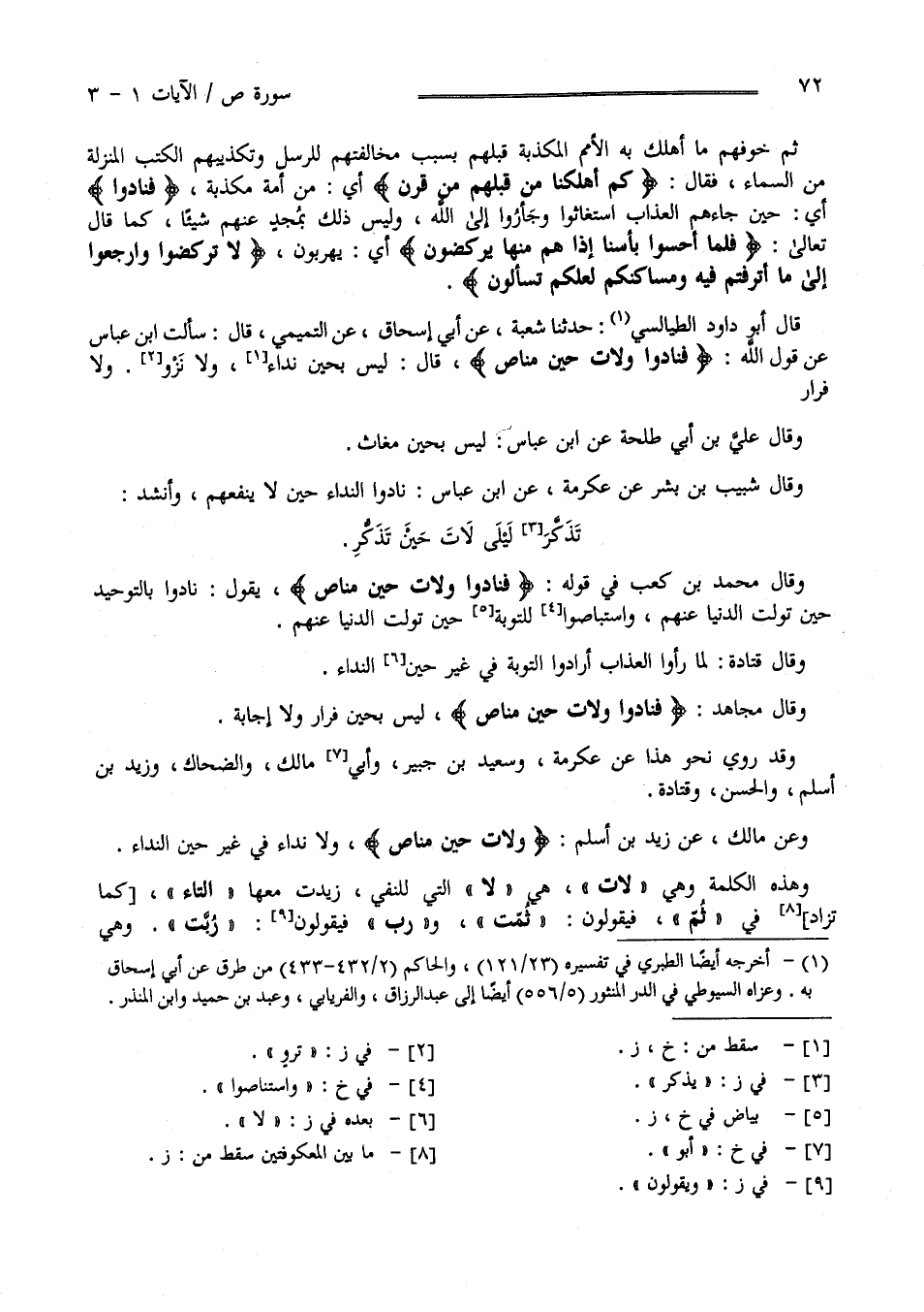 فَقَالَ تَعَالَى " كَمْ أَهْلَكْنَا مِنْ قَبْلهمْ مِنْ قَرْن " أَيْ مِنْ أُمَّة مُكَذِّبَة " فَنَادَوْا " أَيْ حِين جَاءَهُمْ الْعَذَاب اِسْتَغَاثُوا وَجَأَرُوا إِلَى اللَّه تَعَالَى وَلَيْسَ ذَلِكَ بِمُجْدٍ عَنْهُمْ شَيْئًا كَمَا قَالَ عَزَّ وَجَلَّ " فَلَمَّا أَحَسُّوا بَأْسَنَا إِذَا هُمْ مِنْهَا يَرْكُضُونَ " أَيْ يَهْرُبُونَ " لَا تَرْكُضُوا وَارْجِعُوا إِلَى مَا أُتْرِفْتُمْ فِيهِ وَمَسَاكِنكُمْ لَعَلَّكُمْ تُسْأَلُونَ " قَالَ أَبُو دَاوُد الطَّيَالِسِيّ حَدَّثَنَا شُعْبَة عَنْ أَبِي إِسْحَاق التَّمِيمِيّ قَالَ : سَأَلْت اِبْن عَبَّاس رَضِيَ اللَّه تَعَالَى عَنْهُمَا عَنْ قَوْل اللَّه تَبَارَكَ وَتَعَالَى " فَنَادَوْا وَلَاتَ حِين مَنَاص " قَالَ لَيْسَ بِحِينِ نِدَاء وَلَا نَزْو وَلَا فِرَار وَقَالَ عَلِيّ بْن أَبِي طَلْحَة عَنْ اِبْن عَبَّاس رَضِيَ اللَّه تَعَالَى عَنْهُمَا لَيْسَ بِحِينِ مُغَاث وَقَالَ شَبِيب بْن بِشْر عَنْ عِكْرِمَة عَنْ اِبْن عَبَّاس نَادَوْا النِّدَاء حِين لَا يَنْفَعهُمْ وَأَنْشَدَ تَذَكَّرَ لَيْلَى لَاتَ حِين تَذَكُّر وَقَالَ مُحَمَّد بْن كَعْب فِي قَوْله تَعَالَى " فَنَادَوْا وَلَاتَ حِين مَنَاص " يَقُول نَادَوْا بِالتَّوْحِيدِ حِين تَوَلَّتْ الدُّنْيَا عَنْهُمْ وَاسْتَنَاصَوْا لِلتَّوْبَةِ حَيَّتْ تَوَلَّتْ الدُّنْيَا عَنْهُمْ وَقَالَ قَتَادَة لَمَّا رَأَوْا الْعَذَاب أَرَادُوا التَّوْبَة فِي غَيْر حِين النِّدَاء وَقَالَ مُجَاهِد " فَنَادَوْا وَلَاتَ حِين مَنَاص " لَيْسَ بِحِينِ فِرَار وَلَا إِجَابَة وَقَدْ رُوِيَ نَحْو هَذَا عَنْ عِكْرِمَة وَسَعِيد بْن جُبَيْر وَأَبِي مَالِك وَالضَّحَّاك وَزَيْد بْن أَسْلَم وَالْحَسَن وَقَتَادَة وَعَنْ مَالِك عَنْ زَيْد بْن أَسْلَم " وَلَاتَ حِين مَنَاص " وَلَا نِدَاء فِي غَيْر حِين النِّدَاء وَهَذِهِ الْكَلِمَة وَهِيَ لَاتَ هِيَ لَا الَّتِي لِلنَّفْيِ زِيدَتْ مَعَهَا التَّاء كَمَا تُزَاد فِي ثُمَّ فَيَقُولُونَ ثُمَّتْ وَرُبَّ فَيَقُولُونَ رُبَّتْ وَهِيَ