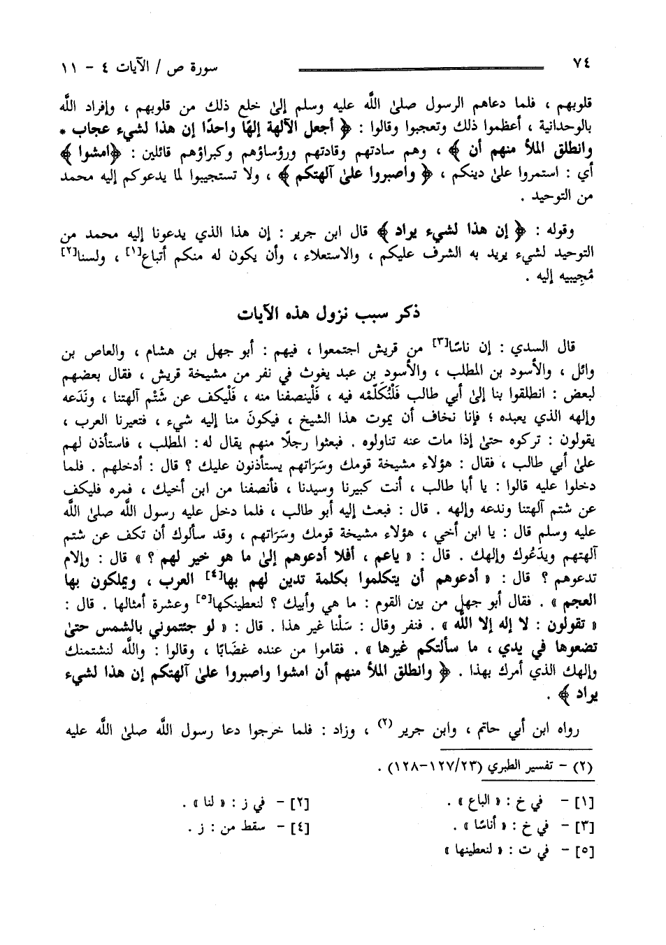 " وَانْطَلَقَ الْمَلَأ مِنْهُمْ " وَهُمْ سَادَتُهُمْ وَقَادَتُهُمْ وَرُؤَسَاؤُهُمْ وَكُبَرَاؤُهُمْ قَائِلِينَ " اِمْشُوا " أَيْ اِسْتَمِرُّوا عَلَى دِينكُمْ " وَاصْبِرُوا عَلَى آلِهَتكُمْ " وَلَا تَسْتَجِيبُوا لِمَا يَدْعُوكُمْ إِلَيْهِ مُحَمَّد مِنْ التَّوْحِيد وَقَوْله تَعَالَى " إِنَّ هَذَا لَشَيْءٌ يُرَاد " قَالَ اِبْن جَرِير إِنَّ هَذَا الَّذِي يَدْعُونَا إِلَيْهِ مُحَمَّد صَلَّى اللَّه عَلَيْهِ وَسَلَّمَ مِنْ التَّوْحِيد لَشَيْء يُرِيد بِهِ الشَّرَف عَلَيْكُمْ وَالِاسْتِعْلَاء وَأَنْ يَكُون لَهُ مِنْكُمْ أَتْبَاع وَلَسْنَا نُجِيبهُ إِلَيْهِ " ذِكْر سَبَب نُزُول هَذِهِ الْآيَات الْكَرِيمَات " قَالَ السُّدِّيّ إِنَّ نَاسًا مِنْ قُرَيْش اِجْتَمَعُوا فِيهِمْ أَبُو جَهْل بْن هِشَام وَالْعَاص بْن وَائِل وَالْأَسْوَد بْن الْمُطَّلِب وَالْأَسْوَد بْن عَبْد يَغُوث فِي نَفَر مِنْ مَشْيَخَة قُرَيْش فَقَالَ بَعْضهمْ لِبَعْضٍ اِنْطَلِقُوا بِنَا إِلَى أَبِي طَالِب فَلْنُكَلِّمْهُ فِيهِ فَلْيُنْصِفْنَا مِنْهُ فَلْيَكُفَّ عَنْ شَتْم آلِهَتنَا وَنَدَعْهُ وَإِلَهه الَّذِي يَعْبُدهُ فَإِنَّا نَخَاف أَنْ يَمُوت هَذَا الشَّيْخ فَيَكُون مِنَّا إِلَيْهِ شَيْء فَتُعَيِّرنَا بِهِ الْعَرَب يَقُولُونَ تَرَكُوهُ حَتَّى إِذَا مَاتَ عَنْهُ تَنَاوَلُوهُ فَبَعَثُوا رَجُلًا مِنْهُمْ يُقَال لَهُ الْمُطَّلِب فَاسْتَأْذَنَ لَهُمْ عَلَى أَبِي طَالِب فَقَالَ هَؤُلَاءِ مَشْيَخَة قَوْمك وَسَرَاتهمْ يَسْتَأْذِنُونَ عَلَيْك قَالَ أَدْخِلْهُمْ فَلَمَّا دَخَلُوا عَلَيْهِ قَالُوا يَا أَبَا طَالِب أَنْتَ كَبِيرنَا وَسَيِّدنَا فَأَنْصِفْنَا مِنْ اِبْن أَخِيك فَمُرْهُ فَلْيَكُفَّ عَنْ شَتْم آلِهَتنَا نَدْعُهُ وَإِلَهه قَالَ فَبَعَثَ إِلَيْهِ أَبُو طَالِب فَلَمَّا دَخَلَ عَلَيْهِ رَسُول اللَّه صَلَّى اللَّه عَلَيْهِ وَسَلَّمَ قَالَ : يَا اِبْن أَخِي هَؤُلَاءِ مَشْيَخَة قَوْمك وَسَرَاتُهُمْ وَقَدْ سَأَلُوك أَنْ تَكُفَّ عَنْ شَتْمِ آلِهَتهمْ وَيَدْعُوك وَإِلَهك قَالَ صَلَّى اللَّه عَلَيْهِ وَسَلَّمَ " يَا عَمّ أَفَلَا أَدْعُوهُمْ إِلَى مَا هُوَ خَيْر لَهُمْ ؟ " قَالَ وَإِلَامَ تَدْعُوهُمْ ؟ قَالَ صَلَّى اللَّه عَلَيْهِ وَسَلَّمَ " أَدْعُوهُمْ أَنْ يَتَكَلَّمُوا بِكَلِمَةٍ تَدِين لَهُمْ بِهَا الْعَرَب وَيَمْلِكُونَ بِهَا الْعَجَم " فَقَالَ أَبُو جَهْل لَعَنَهُ اللَّه مِنْ بَيْن الْقَوْم مَا هِيَ وَأَبِيك لَأُعْطِيَنَّكَهَا وَعَشْر أَمْثَالهَا قَالَ صَلَّى اللَّه عَلَيْهِ وَسَلَّمَ " تَقُولُونَ لَا إِلَه إِلَّا اللَّه " فَنَفَرُوا وَقَالُوا سَلْنَا غَيْرهَا قَالَ صَلَّى اللَّه عَلَيْهِ وَسَلَّمَ" لَوْ جِئْتُمُونِي بِالشَّمْسِ حَتَّى تَضَعُوهَا فِي يَدَيَّ مَا سَأَلْتُكُمْ غَيْرهَا " فَقَامُوا مِنْ عِنْده غِضَابًا وَقَالُوا وَاَللَّه لَأَشْتُمَنَّك وَإِلَهك الَّذِي أَمَرَك بِهَذَا " وَانْطَلَقَ الْمَلَأ مِنْهُمْ أَنْ اِمْشُوا وَاصْبِرُوا عَلَى آلِهَتكُمْ إِنَّ هَذَا لَشَيْء يُرَاد" وَرَوَاهُ اِبْن أَبِي حَاتِم وَابْن جَرِير وَزَادَ فَلَمَّا خَرَجُوا دَعَا رَسُول اللَّه صَلَّى اللَّه عَلَيْه