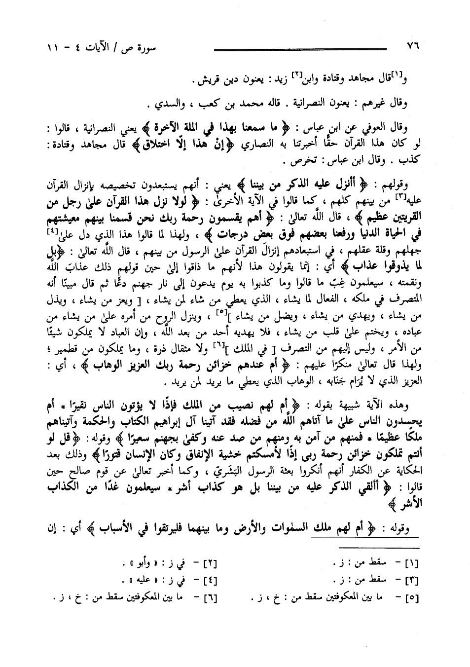 قَالَ مُجَاهِد وَقَتَادَة وَأَبُو زَيْد يَعْنُونَ دِين قُرَيْش وَقَالَ غَيْرهمْ يَعْنُونَ النَّصْرَانِيَّة قَالُوا مُحَمَّد بْن كَعْب وَالسُّدِّيّ وَقَالَ الْعَوْفِيّ عَنْ اِبْن عَبَّاس رَضِيَ اللَّه عَنْهُمَا مَا سَمِعْنَا بِهَذَا فِي الْمِلَّة الْآخِرَة يَعْنِي النَّصْرَانِيَّة قَالُوا لَوْ كَانَ هَذَا الْقُرْآن حَقًّا لَأَخْبَرَتْنَا بِهِ النَّصَارَى " إِنْ اِخْتِلَاق ".