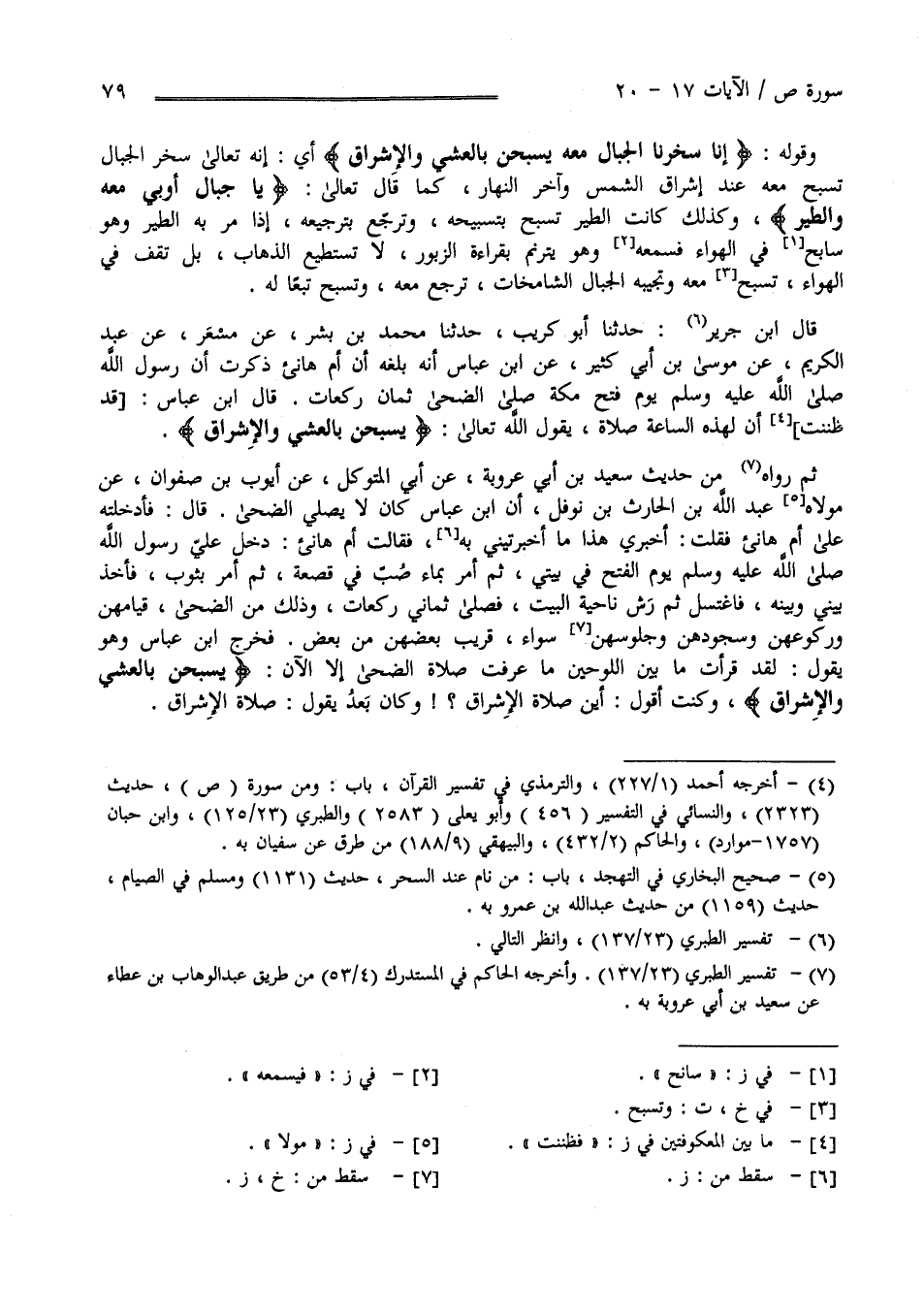 وَقَوْله تَعَالَى " إِنَّا سَخَّرْنَا الْجِبَال مَعَهُ يُسَبِّحْنَ بِالْعَشِيِّ وَالْإِشْرَاق " أَيْ أَنَّهُ تَعَالَى سَخَّرَ الْجِبَال تُسَبِّح مَعَهُ عِنْد إِشْرَاق الشَّمْس وَآخِر النَّهَار كَمَا قَالَ عَزَّ وَجَلَّ " يَا جِبَال أَوِّبِي مَعَهُ وَالطَّيْر " وَكَذَلِكَ كَانَتْ الطَّيْر تُسَبِّح بِتَسْبِيحِهِ وَتُرَجِّع بِتَرْجِيعِهِ إِذَا مَرَّ بِهِ الطَّيْر وَهُوَ سَابِح فِي الْهَوَاء فَسَمِعَهُ وَهُوَ يَتَرَنَّم بِقِرَاءَةِ الزَّبُور لَا يَسْتَطِيع الذَّهَاب بَلْ يَقِف فِي الْهَوَاء وَيُسَبِّح مَعَهُ وَتُجِيبهُ الْجِبَال الشَّامِخَات تُرَجِّع مَعَهُ وَتُسَبِّح تَبَعًا لَهُ قَالَ اِبْن جَرِير حَدَّثَنَا أَبُو كُرَيْب حَدَّثَنَا مُحَمَّد بْن بِشْر عَنْ مِسْعَر عَنْ عَبْد الْكَرِيم عَنْ مُوسَى بْن أَبِي كَثِير عَنْ اِبْن عَبَّاس رَضِيَ اللَّه عَنْهُمَا أَنَّهُ بَلَغَهُ أَنَّ أُمَّ هَانِئ رَضِيَ اللَّه عَنْهَا ذَكَرَتْ أَنَّ رَسُول اللَّه صَلَّى اللَّه عَلَيْهِ وَسَلَّمَ يَوْم فَتْح مَكَّة صَلَّى الضُّحَى ثَمَانِ رَكَعَات فَقَالَ اِبْن عَبَّاس رَضِيَ اللَّه عَنْهُمَا قَدْ ظَنَنْت أَنَّ لِهَذِهِ السَّاعَة صَلَاة يَقُول اللَّه عَزَّ وَجَلَّ " يُسَبِّحْنَ بِالْعَشِيِّ وَالْإِشْرَاق " ثُمَّ رَوَاهُ مِنْ حَدِيث سَعِيد بْن أَبِي عَرُوبَة عَنْ أَبِي الْمُتَوَكِّل عَنْ أَيُّوب بْن صَفْوَان عَنْ مَوْلَاهُ عَبْد اللَّه بْن الْحَارِث بْن نَوْفَل أَنَّ اِبْن عَبَّاس رَضِيَ اللَّه عَنْهُمَا كَانَ لَا يُصَلِّي الضُّحَى قَالَ فَأَدْخَلْته عَلَى أُمّ هَانِئ رَضِيَ اللَّه عَنْهَا فَقُلْت أَخْبِرِي هَذَا مَا أَخَّرَتْنِي فَقَالَتْ : دَخَلَ عَلَيَّ رَسُول اللَّه صَلَّى اللَّه عَلَيْهِ وَسَلَّمَ يَوْم الْفَتْح فِي بَيْتِي ثُمَّ أَمَرَ بِمَاءٍ صُبَّ فِي قَصْعَة ثُمَّ أَمَرَ بِثَوْبٍ فَأَخَذَ بَيْنِي وَبَيْنه فَاغْتَسَلَ ثُمَّ رَشَّ نَاحِيَة الْبَيْت فَصَلَّى ثَمَانِ رَكَعَات وَذَلِكَ مِنْ الضُّحَى قِيَامهنَّ وَرُكُوعهنَّ وَسُجُودهنَّ وَجُلُوسهنَّ سَوَاء قَرِيب بَعْضهمْ مِنْ بَعْض فَخَرَجَ اِبْن عَبَّاس رَضِيَ اللَّه عَنْهُمَا وَهُوَ يَقُول لَقَدْ قَرَأْت مَا بَيْن اللَّوْحَيْنِ مَا عَرَفْت صَلَاة الضُّحَى إِلَّا الْآن " يُسَبِّحْنَ بِالْعَشِيِّ وَالْإِشْرَاق " وَكُنْت أَقُول أَيْنَ صَلَاة الْإِشْرَاق وَكَانَ بَعْد يَقُول صَلَاة الْإِشْرَاق