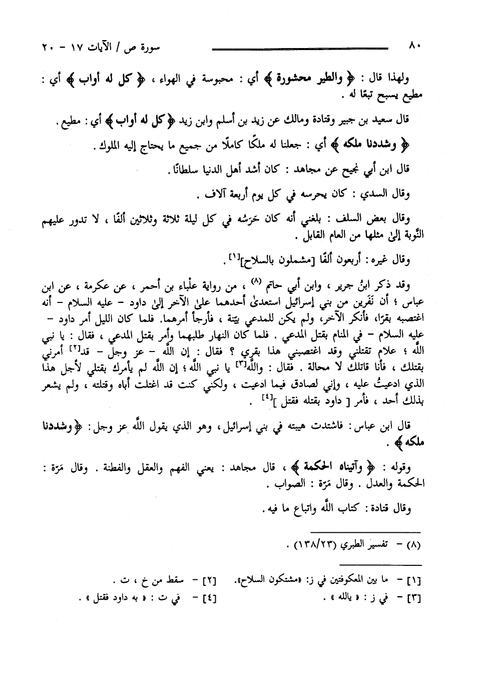 وَقَوْله تَعَالَى " وَشَدَدْنَا مُلْكَهُ " أَنْ جَعَلْنَا لَهُ مُلْكًا كَامِلًا مِنْ جَمِيع مَا يَحْتَاج إِلَيْهِ الْمُلُوك قَالَ اِبْن أَبِي نَجِيح عَنْ مُجَاهِد كَانَ أَشَدّ أَهْل الدُّنْيَا سُلْطَانًا وَقَالَ السُّدِّيّ كَانَ يَحْرُسهُ كُلّ يَوْم أَرْبَعَة آلَاف وَقَالَ بَعْض السَّلَف بَلَغَنِي أَنَّهُ كَانَ يَحْرُسهُ فِي كُلّ لَيْلَة ثَلَاثَة وَثَلَاثُونَ أَلْفًا لَا تَدُور عَلَيْهِمْ النَّوْبَة إِلَى مِثْلهَا مِنْ الْعَام الْقَابِل وَقَالَ غَيْره أَرْبَعُونَ أَلْفًا مُشْتَمِلُونَ بِالسِّلَاحِ وَقَدْ ذَكَرَ اِبْن جَرِير وَابْن أَبِي حَاتِم مِنْ رِوَايَة عَلْبَاء بْن أَحْمَر عَنْ عِكْرِمَة عَنْ اِبْن عَبَّاس رَضِيَ اللَّه عَنْهُمَا أَنَّ نَفَرَيْنِ مِنْ بَنِي إِسْرَائِيل اِسْتَعْدَى أَحَدهمَا عَلَى الْآخَر إِلَى دَاوُد عَلَيْهِ الصَّلَاة وَالسَّلَام أَنَّهُ اِغْتَصَبَهُ بَقَرًا فَأَنْكَرَ الْآخَر وَلَمْ يَكُنْ لِلْمُدَّعِي بَيِّنَة فَأَرْجَأَ أَمْرَهُمَا فَلَمَّا كَانَ اللَّيْل أُمِرَ دَاوُد عَلَيْهِ الصَّلَاة وَالسَّلَام فِي الْمَنَام بِقَتْلِ الْمُدَّعِي فَلَمَّا كَانَ النَّهَار طَلَبَهُمَا وَأَمَرَ بِقَتْلِ الْمُدَّعِي فَقَالَ يَا نَبِيَّ اللَّه عَلَامَ تَقْتُلُنِي وَقَدْ اِغْتَصَبَنِي هَذَا بَقَرِي ؟ فَقَالَ لَهُ إِنَّ اللَّه تَعَالَى أَمَرَنِي بِقَتْلِك فَأَنَا قَاتِلُك لَا مَحَالَة فَقَالَ وَاَللَّهِ يَا نَبِيَّ اللَّهِ إِنَّ اللَّه لَمْ يَأْمُرْك بِقَتْلِي لِأَجْلِ هَذَا الَّذِي اِدَّعَيْت عَلَيْهِ وَإِنِّي لَصَادِقٌ فِيمَا اِدَّعَيْت وَلَكِنِّي كُنْت قَدْ اِغْتَلْت أَبَاهُ وَقَتَلْته وَلَمْ يَشْعُرْ بِذَلِكَ أَحَدٌ فَأَمَرَ بِهِ دَاوُد عَلَيْهِ السَّلَام فَقُتِلَ قَالَ اِبْن عَبَّاس عَلَيْهِ السَّلَام فَاشْتَدَّتْ هَيْبَتُهُ فِي بَنِي إِسْرَائِيل وَهُوَ الَّذِي يَقُول اللَّه عَزَّ وَجَلَّ " وَشَدَدْنَا مُلْكه " وَقَوْله جَلَّ وَعَلَا " وَآتَيْنَاهُ الْحِكْمَة " قَالَ مُجَاهِد يَعْنِي الْفَهْم وَالْعَقْل وَالْفِطْنَة وَقَالَ مَرَّة : الْحِكْمَة : الْعَدْل وَقَالَ مَرَّة : الصَّوَاب وَقَالَ قَتَادَة كِتَاب اللَّه وَاتِّبَاع مَا فِيهِ