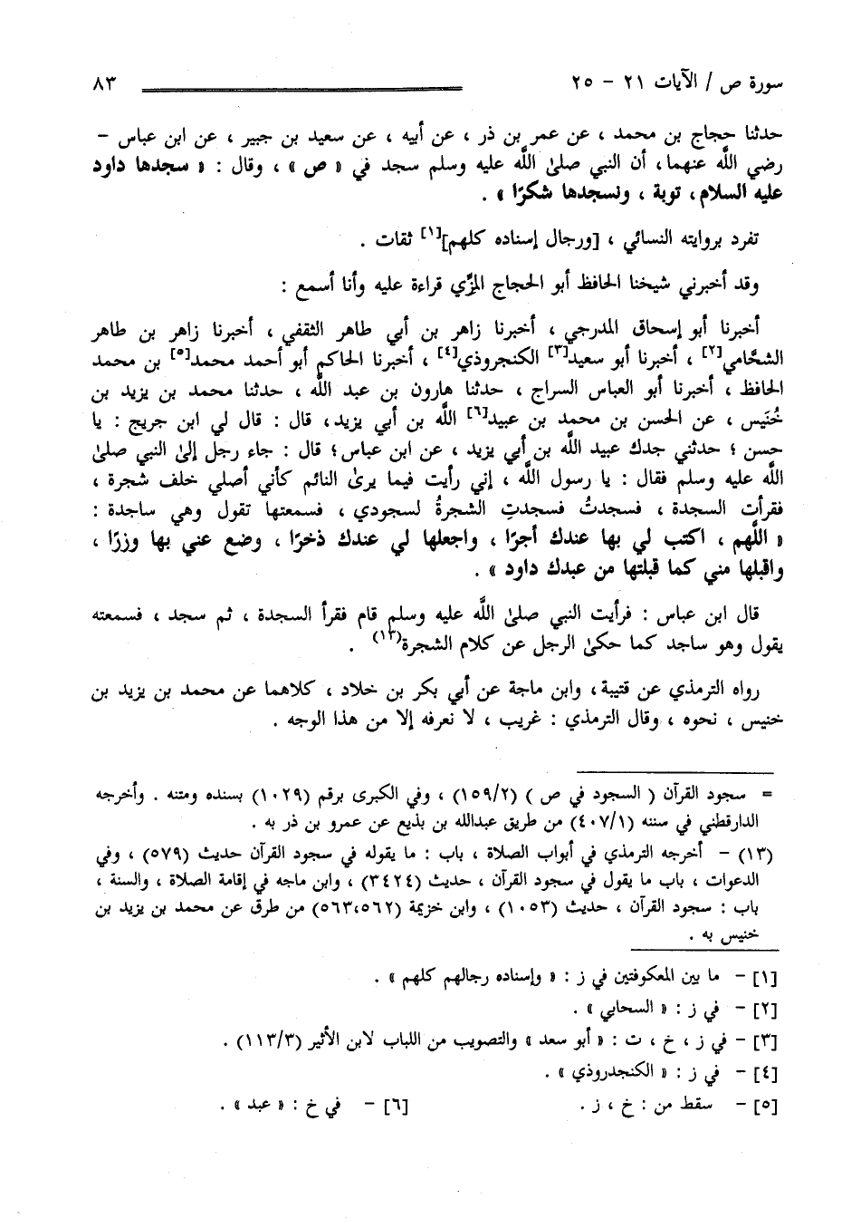 حَدَّثَنَا حَجَّاج بْن مُحَمَّد عَنْ عُمَر بْن ذَرّ عَنْ أَبِيهِ عَنْ سَعِيد بْن جُبَيْر عَنْ اِبْن عَبَّاس رَضِيَ اللَّه عَنْهُمَا قَالَ : إِنَّ النَّبِيّ صَلَّى اللَّه عَلَيْهِ وَسَلَّمَ سَجَدَ فِي ص وَقَالَ " سَجَدَهَا دَاوُد عَلَيْهِ الصَّلَاة وَالسَّلَام تَوْبَة وَنَسْجُدهَا شُكْرًا " تَفَرَّدَ بِرِوَايَتِهِ النَّسَائِيّ وَرِجَال إِسْنَاده كُلّهمْ ثِقَات وَقَدْ أَخْبَرَنِي شَيْخنَا الْحَافِظ أَبُو الْحَجَّاج الْمِزِّيّ قِرَاءَة عَلَيْهِ وَأَنَا أَسْمَع أَخْبَرَنَا أَبُو إِسْحَاق المدرجي أَخْبَرَنَا زَاهِر بْن أَبِي طَاهِر الثَّقَفِيّ حَدَّثَنَا زَاهِر بْن أَبِي طَاهِر الشحامي أَخْبَرَنَا أَبُو سَعِيد الكنجدروذي أَخْبَرَنَا الْحَاكِم أَبُو أَحْمَد مُحَمَّد بْن مُحَمَّد الْحَافِظ أَخْبَرَنَا أَبُو الْعَبَّاس السَّرَّاج