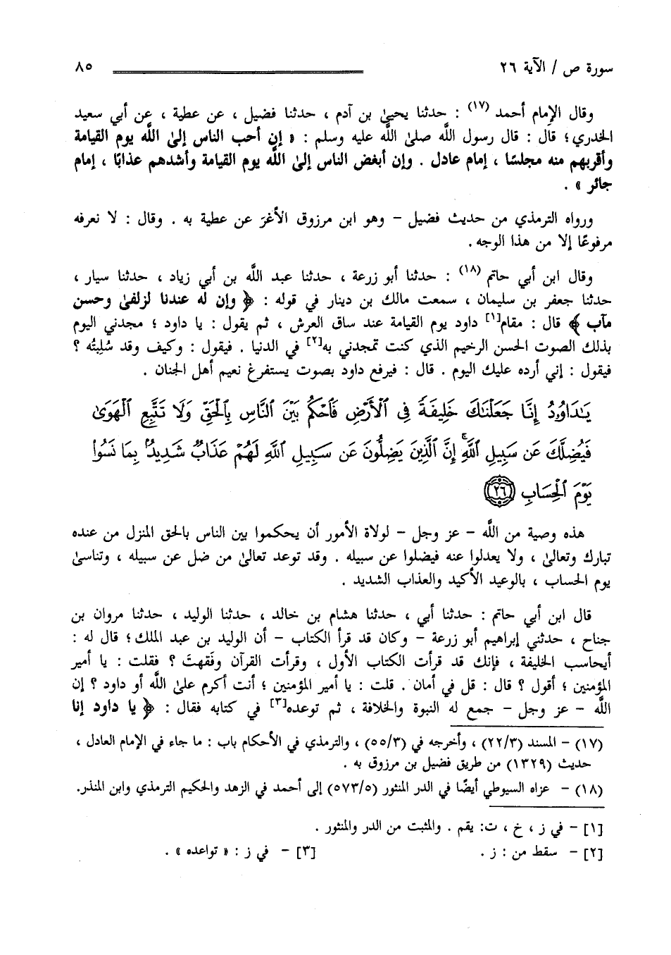 يَا دَاوُودُ إِنَّا جَعَلْنَاكَ خَلِيفَةً فِي الْأَرْضِ فَاحْكُمْ بَيْنَ النَّاسِ بِالْحَقِّ وَلَا تَتَّبِعِ الْهَوَى فَيُضِلَّكَ عَنْ سَبِيلِ اللَّهِ إِنَّ الَّذِينَ يَضِلُّونَ عَنْ سَبِيلِ اللَّهِ لَهُمْ عَذَابٌ شَدِيدٌ بِمَا نَسُوا يَوْمَ الْحِسَابِ (26)