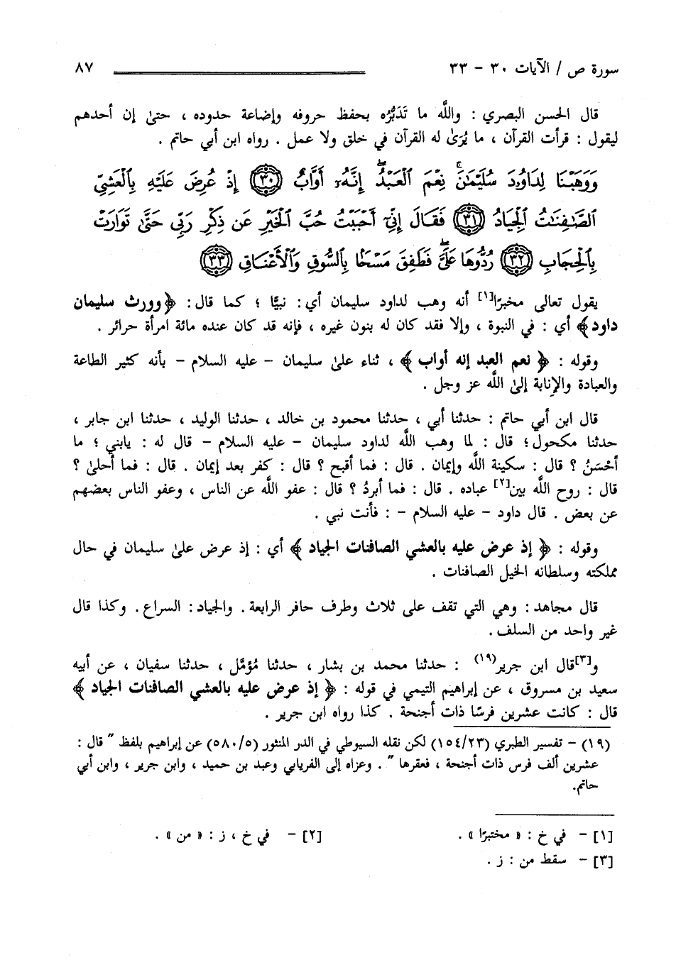 قَوْله تَعَالَى " إِذْ عُرِضَ عَلَيْهِ بِالْعَشِيِّ الصَّافِنَات الْجِيَاد " أَيْ إِذْ عُرِضَ عَلَى سُلَيْمَان عَلَيْهِ الصَّلَاة وَالسَّلَام فِي حَال مَمْلَكَته وَسُلْطَانه الْخَيْل الصَّافِنَات قَالَ مُجَاهِد وَهِيَ الَّتِي تَقِف عَلَى ثَلَاث وَطَرَف حَافِر الرَّابِعَة وَالْجِيَاد السِّرَاع وَكَذَا قَالَ غَيْر وَاحِد مِنْ السَّلَف وَقَالَ اِبْن جَرِير حَدَّثَنَا مُحَمَّد بْن بَشَّار حَدَّثَنَا مُؤَمِّل حَدَّثَنَا سُفْيَان عَنْ أَبِيهِ سَعِيد بْن مَسْرُوق عَنْ إِبْرَاهِيم التَّيْمِيّ فِي قَوْله عَزَّ وَجَلَّ " إِذْ عُرِضَ عَلَيْهِ بِالْعَشِيِّ الصَّافِنَات الْجِيَاد " قَالَ كَانَتْ عِشْرِينَ فَرَسًا ذَات أَجْنِحَة كَذَا رَوَاهُ اِبْن جَرِير.