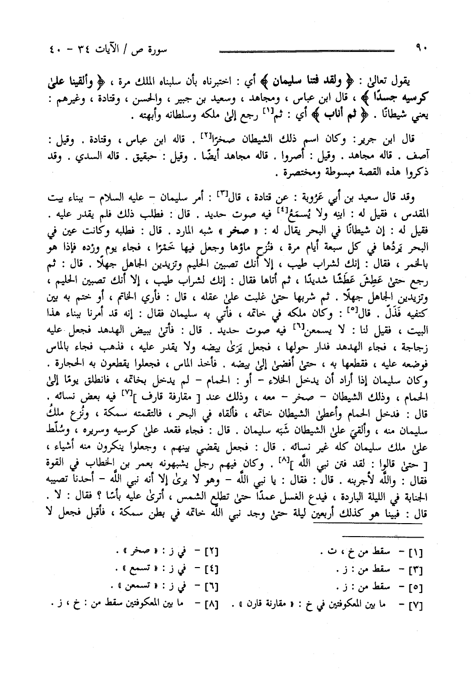 يَقُول تَعَالَى " وَلَقَدْ فَتَنَّا سُلَيْمَان " أَيْ اِخْتَبَرْنَاهُ بِأَنْ سَلَبْنَاهُ الْمُلْك " وَأَلْقَيْنَا عَلَى كُرْسِيّه جَسَدًا " قَالَ اِبْن عَبَّاس رَضِيَ اللَّه عَنْهُمَا وَمُجَاهِد وَسَعِيد بْن جُبَيْر وَالْحَسَن وَقَتَادَة وَغَيْرهمْ يَعْنِي شَيْطَانًا " ثُمَّ أَنَابَ" أَيْ رَجَعَ إِلَى مُلْكه وَسُلْطَانه وَأُبَّهَته قَالَ اِبْن جَرِير وَكَانَ اِسْم ذَلِكَ الشَّيْطَان صَخْرًا قَالَهُ اِبْن عَبَّاس رَضِيَ اللَّه عَنْهُمَا وَقَتَادَة وَقِيلَ آصَف قَالَهُ مُجَاهِد وَقِيلَ آصَر وَقَالَهُ مُجَاهِد أَيْضًا وَقِيلَ حبيق قَالَهُ السُّدِّيّ وَقَدْ ذَكَرُوا هَذِهِ الْقِصَّة مَبْسُوطَة وَمُخْتَصَرَة وَقَدْ قَالَ سَعِيد بْن أَبِي عَرُوبَة عَنْ قَتَادَة قَالَ أُمِرَ سُلَيْمَان عَلَيْهِ الصَّلَاة وَالسَّلَام بِبِنَاءِ بَيْت الْمَقْدِس فَقِيلَ لَهُ اِبْنِهِ وَلَا يُسْمَع فِيهِ صَوْت حَدِيد قَالَ فَطَلَبَ ذَلِكَ فَلَمْ يَقْدِر عَلَيْهِ فَقِيلَ لَهُ إِنَّ شَيْطَانًا فِي الْبَحْر يُقَال لَهُ صَخْر شِبْه الْمَارِد قَالَ فَطَلَبَهُ وَكَانَتْ فِي الْبَحْر عَيْن يَرِدُهَا فِي كُلّ سَبْعَة أَيَّام مَرَّة فَنَزَحَ مَاءَهَا وَجَعَلَ فِيهَا خَمْرًا فَجَاءَ يَوْم وُرُوده فَإِذَا هُوَ بِالْخَمْرِ فَقَالَ إِنَّك لَشَرَاب طَيِّب إِلَّا أَنَّك تُصْبِينَ الْحَلِيم وَتَزِيدِينَ الْجَاهِل جَهْلًا قَالَ ثُمَّ رَجَعَ حَتَّى عَطِشَ عَطَشًا شَدِيدًا ثُمَّ أَتَاهَا فَقَالَ إِنَّك لَشَرَاب طَيِّب إِلَّا أَنَّك تُصْبِينَ الْحَلِيم وَتَزِيدِينَ الْجَاهِل جَهْلًا قَالَ ثُمَّ شَرِبَهَا حَتَّى غَلَبَ عَلَى عَقْله قَالَ فَأُرِيَ الْخَاتَم أَوْ خُتِمَ بِهِ بَيْن كَتِفَيْهِ فَذَلَّ قَالَ وَكَانَ مُلْكه فِي خَاتَمه فَأُتِيَ بِهِ سُلَيْمَان عَلَيْهِ الصَّلَاة وَالسَّلَام فَقَالَ إِنَّا قَدْ أُمِرْنَا بِبِنَاءِ هَذَا الْبَيْت وَقِيلَ لَنَا لَا يُسْمَعَنَّ فِيهِ صَوْت حَدِيد قَالَ فَأَتَى بِبَيْضِ الْهُدْهُد فَجَعَلَ عَلَيْهِ زُجَاجَة فَجَاءَ الْهُدْهُد فَدَار حَوْلهَا فَجَعَلَ يَرَى بَيْضه وَلَا يَقْدِر عَلَيْهِ فَذَهَبَ فَجَاءَ بِالْمَاسِ فَوَضَعَهُ عَلَيْهِ فَقَطَعَهَا بِهِ حَتَّى أَفْضَى إِلَى بَيْضه فَأَخَذَ الْمَاس فَجَعَلُوا يَقْطَعُونَ بِهِ الْحِجَارَة وَكَانَ سُلَيْمَان عَلَيْهِ الصَّلَاة وَالسَّلَام إِذَا أَرَادَ أَنْ يَدْخُل الْخَلَاء أَوْ الْحَمَّام لَمْ يَدْخُل بِالْخَاتَمِ فَانْطَلَقَ يَوْمًا إِلَى الْحَمَّام وَذَلِكَ الشَّيْطَان صَخْر مَعَهُ وَذَلِكَ عِنْد مُقَارَفَة قَارَفَ فِيهَا بَعْض نِسَائِهِ قَالَ فَدَخَلَ الْحَمَّام وَأَعْطَى الشَّيْطَان خَاتَمه فَأَلْقَاهُ فِي الْبَحْر فَالْتَقَمَتْهُ سَمَكَة وَنُزِعَ مُلْك سُلَيْمَان مِنْهُ وَأُلْقِيَ عَلَى الشَّيْطَان شَبَه سُلَيْمَان قَالَ فَجَاءَ فَقَعَدَ عَلَى كُرْسِيّه وَسَرِيره وَسُلِّطَ عَلَى مُلْك سُلَيْمَان كُلّه غَيْر نِسَائِهِ قَالَ فَجَعَلَ يَقْضِي بَيْنهمْ وَجَعَلُوا يُنْكِرُونَ مِنْهُ أَشْيَاء حَتَّى قَالُوا لَقَدْ فُتِنَ نَبِيّ اللَّه وَكَانَ فِيهِمْ رَجُل يُشَبِّهُونَهُ بِعُمَرَ بْن الْخَطَّاب رَضِيَ اللَّه عَنْهُ فِي الْقُوَّة فَقَالَ وَاَللَّه لَأُجَرِّبَنَّهُ قَالَ فَقَالَ يَا نَبِيّ اللَّه وَهُوَ لَا يَرَى إِلَّا أَنَّهُ نَبِيّ اللَّه أَحَدنَا تُصِيبهُ الْجَنَابَة فِي اللَّيْلَة الْبَارِدَة فَيَدَع الْغُسْل عَمْدًا حَتَّى تَطْلُع الشَّمْس أَتَرَى عَلَيْهِ بَأْسًا ؟ قَالَ لَا فَبَيْنَمَا هُوَ كَذَلِكَ