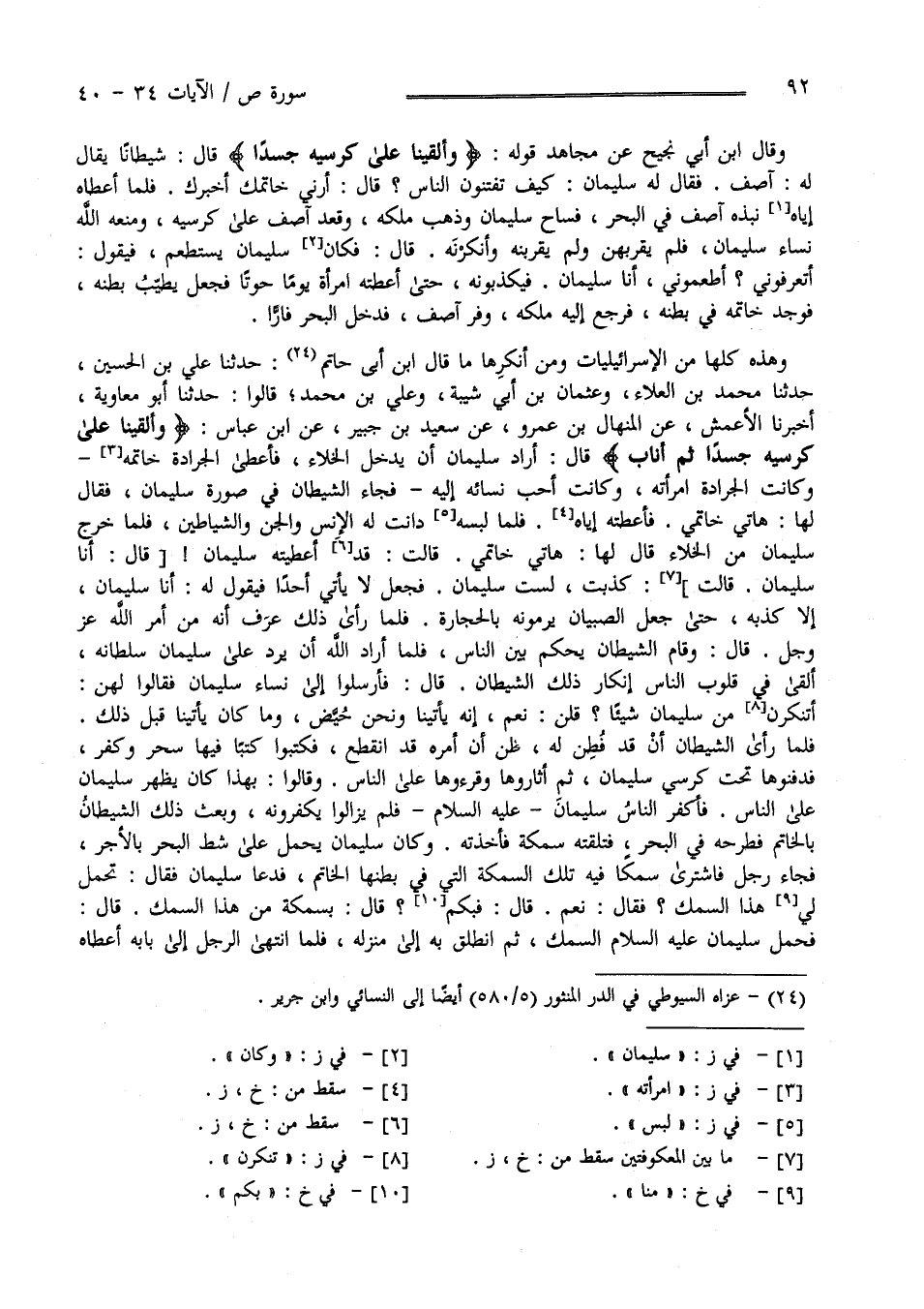 وَقَالَ اِبْن أَبِي نَجِيح عَنْ مُجَاهِد فِي قَوْله تَبَارَكَ وَتَعَالَى " وَأَلْقَيْنَا عَلَى كُرْسِيّه جَسَدًا " قَالَ شَيْطَانًا يُقَال لَهُ آصَف فَقَالَ لَهُ سُلَيْمَان عَلَيْهِ السَّلَام كَيْفَ تَفْتِنُونَ النَّاس ؟ قَالَ أَرِنِي خَاتَمك أُخْبِرك فَلَمَّا أَعْطَاهُ إِيَّاهُ نَبَذَهُ آصَف فِي الْبَحْر فَسَاحَ سُلَيْمَان عَلَيْهِ السَّلَام وَذَهَبَ مُلْكه وَقَعَدَ آصَف عَلَى كُرْسِيّه وَمَنَعَهُ اللَّه تَبَارَكَ وَتَعَالَى مِنْ نِسَاء سُلَيْمَان فَلَمْ يَقْرَبهُنَّ وَلَمْ يَقْرَبْنَهُ وَأَنْكَرْنَهُ قَالَ فَكَانَ سُلَيْمَان عَلَيْهِ الصَّلَاة وَالسَّلَام يَسْتَطْعِم فَيَقُول أَتَعْرِفُونَنِي ؟ أَطْعِمُونِي أَنَا سُلَيْمَان فَيُكَذِّبُونَهُ حَتَّى أَعْطَتْهُ اِمْرَأَته يَوْمًا حُوتًا فَفَتَحَ بَطْنه فَوَجَدَ خَاتَمه فِي بَطْنه فَرَجَعَ إِلَيْهِ مُلْكه وَفَرَّ آصَف فَدَخَلَ الْبَحْر هَذِهِ كُلّهَا مِنْ الْإِسْرَائِيلِيَّات وَمِنْ أَنْكَرهَا مَا قَالَهُ اِبْن أَبِي حَاتِم حَدَّثَنَا عَلِيّ بْن الْحُسَيْن حَدَّثَنَا مُحَمَّد بْن الْعَلَاء وَعُثْمَان بْن أَبِي شَيْبَة وَعَلِيّ بْن مُحَمَّد قَالُوا حَدَّثَنَا أَبُو مُعَاوِيَة أَخْبَرَنَا الْأَعْمَش عَنْ الْمِنْهَال بْن عَمْرو عَنْ سَعِيد بْن جُبَيْر عَنْ اِبْن عَبَّاس رَضِيَ اللَّه عَنْهُمَا فِي قَوْله تَعَالَى " وَأَلْقَيْنَا عَلَى كُرْسِيّه جَسَدًا ثُمَّ أَنَابَ " قَالَ أَرَادَ سُلَيْمَان عَلَيْهِ الصَّلَاة وَالسَّلَام أَنْ يَدْخُل الْخَلَاء فَأَعْطَى الْجَرَادَة خَاتَمه وَكَانَتْ الْجَرَادَة اِمْرَأَته وَكَانَتْ أَحَبّ نِسَائِهِ إِلَيْهِ فَجَاءَ الشَّيْطَان فِي صُورَة سُلَيْمَان فَقَالَ لَهَا هَاتِي خَاتَمِي فَأَعْطَتْهُ إِيَّاهُ فَلَمَّا لَبِسَهُ دَانَتْ لَهُ الْإِنْس وَالْجِنّ وَالشَّيَاطِين فَلَمَّا خَرَجَ سُلَيْمَان عَلَيْهِ السَّلَام مِنْ الْخَلَاء قَالَ لَهَا هَاتِي خَاتَمِي قَالَتْ قَدْ أَعْطَيْته سُلَيْمَان قَالَ أَنَا سُلَيْمَان قَالَتْ كَذَبْت مَا أَنْتَ بِسُلَيْمَانَ فَجَعَلَ لَا يَأْتِي أَحَدًا يَقُول لَهُ أَنَا سُلَيْمَان إِلَّا كَذَّبَهُ حَتِّي جَعَلَ الصِّبْيَان يَرْمُونَهُ بِالْحِجَارَةِ فَلَمَّا رَأَى ذَلِكَ سُلَيْمَان عَرَفَ أَنَّهُ مِنْ أَمْر اللَّه عَزَّ وَجَلَّ قَالَ وَقَامَ الشَّيْطَان يَحْكُم بَيْن النَّاس فَلَمَّا أَرَادَ اللَّه تَبَارَكَ وَتَعَالَى أَنْ يَرُدَّ عَلَى سُلَيْمَان سُلْطَانه أَلْقَى فِي قُلُوب النَّاس إِنْكَار ذَلِكَ الشَّيْطَان قَالَ فَأَرْسَلُوا إِلَى نِسَاء سُلَيْمَان فَقَالُوا لَهُنَّ أَتُنْكِرْنَ مِنْ سُلَيْمَان شَيْئًا ؟ قُلْنَ نَعَمْ إِنَّهُ يَأْتِينَا وَنَحْنُ حُيَّض وَمَا كَانَ يَأْتِينَا قَبْل ذَلِكَ فَلَمَّا رَأَى الشَّيْطَان أَنَّهُ قَدْ فُطِنَ لَهُ ظَنَّ أَنَّ أَمْره قَدْ اِنْقَطَعَ فَكَتَبُوا كُتُبًا فِيهَا سِحْر وَكُفْر فَدَفَنُوهَا تَحْت كُرْسِيّ سُلَيْمَان ثُمَّ أَثَارُوهَا وَقَرَءُوهَا عَلَى النَّاس وَقَالُوا بِهَذَا كَانَ يَظْهَر سُلَيْمَان عَلَى النَّاس وَيَغْلِبهُمْ فَأَكْفَرَ النَّاسُ سُلَيْمَانَ عَلَيْهِ الصَّلَاة وَالسَّلَام فَلَمْ يَزَالُوا يُكَفِّرُونَهُ وَبَعَثَ ذَلِكَ الشَّيْطَان بِالْخَاتَمِ فَطَرَحَهُ فِي