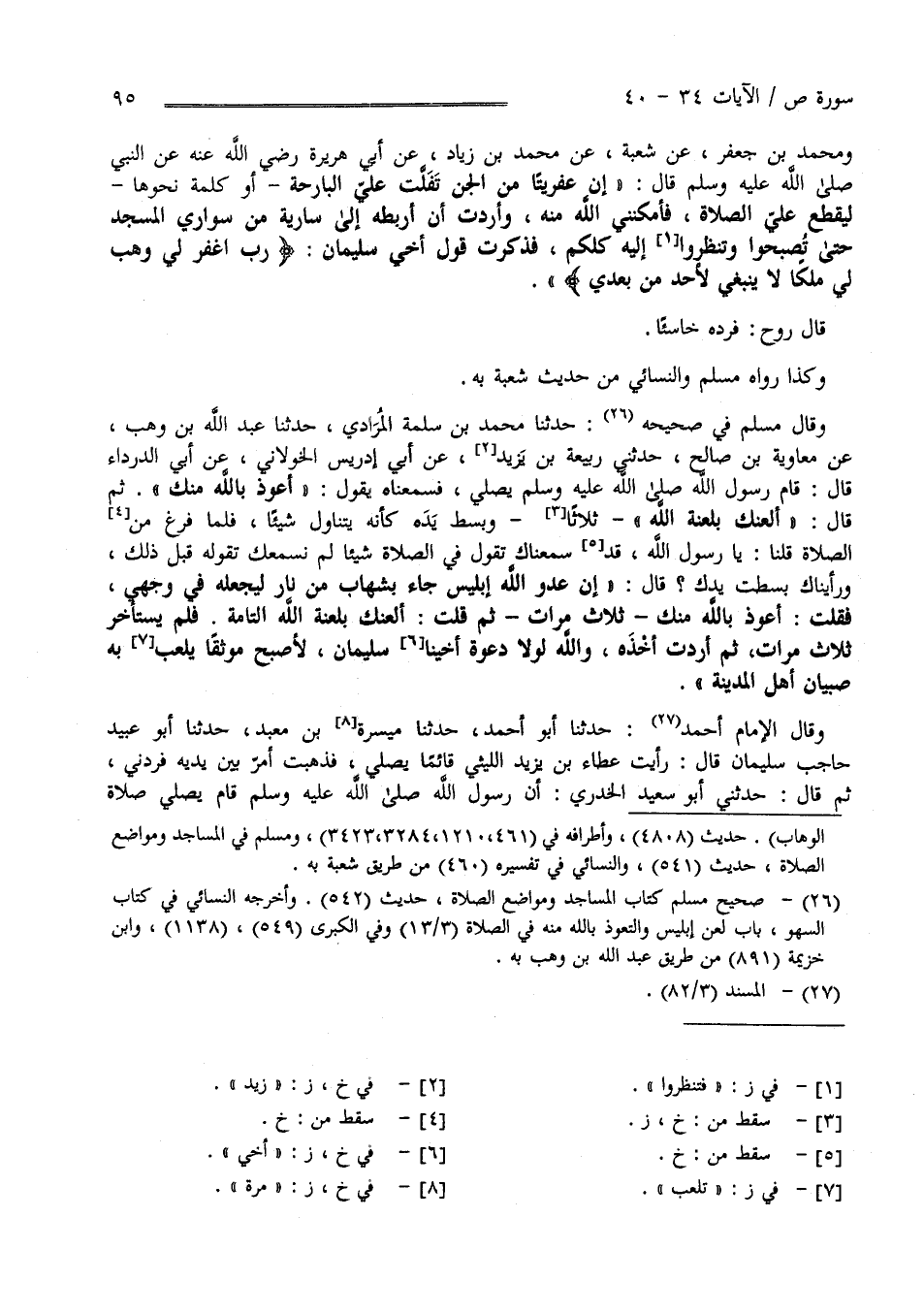 وَمُحَمَّد بْن جَعْفَر عَنْ شُعْبَة عَنْ مُحَمَّد بْن زِيَاد عَنْ أَبِي هُرَيْرَة رَضِيَ اللَّه عَنْهُ عَنْ النَّبِيّ صَلَّى اللَّه عَلَيْهِ وَسَلَّمَ قَالَ " إِنَّ عِفْرِيتًا مِنْ الْجِنّ تَفَلَّتَ عَلَيَّ الْبَارِحَة - أَوْ كَلِمَة نَحْوهَا لِيَقْطَع عَلَيَّ الصَّلَاة فَأَمْكَنَنِي اللَّه تَبَارَكَ وَتَعَالَى مِنْهُ وَأَرَدْت أَنْ أَرْبِطهُ إِلَى سَارِيَة مِنْ سَوَارِي الْمَسْجِد حَتَّى تُصْبِحُوا وَتَنْظُرُوا إِلَيْهِ كُلّكُمْ فَذَكَرْت قَوْل أَخِي سُلَيْمَان عَلَيْهِ الصَّلَاة وَالسَّلَام " رَبّ اِغْفِرْ لِي وَهَبْ لِي مُلْكًا لَا يَنْبَغِي لِأَحَدٍ مِنْ بَعْدِي " قَالَ رَوْح فَرَدَّهُ خَاسِئًا وَكَذَا رَوَاهُ مُسْلِم وَالنَّسَائِيّ مِنْ حَدِيث شُعْبَة بِهِ وَقَالَ مُسْلِم فِي صَحِيحه حَدَّثَنَا مُحَمَّد بْن سَلَمَة الْمُرَادِيّ حَدَّثَنَا عَبْد اللَّه بْن وَهْب عَنْ مُعَاوِيَة بْن صَالِح حَدَّثَنِي رَبِيعه بْن يَزِيد عَنْ أَبِي إِدْرِيس الْخَوْلَانِيّ عَنْ أَبِي الدَّرْدَاء رَضِيَ اللَّه عَنْهُ قَالَ قَامَ رَسُول اللَّه صَلَّى اللَّه عَلَيْهِ وَسَلَّمَ يُصَلِّي فَسَمِعْنَاهُ يَقُول " أَعُوذ بِاَللَّهِ مِنْك - ثُمَّ قَالَ أَلْعَنك بِلَعْنَةِ اللَّه " ثَلَاثًا وَبَسَطَ يَده كَأَنَّهُ يَتَنَاوَل شَيْئًا فَلَمَّا فَرَغَ مِنْ الصَّلَاة قُلْنَا يَا رَسُول اللَّه سَمِعْنَاك تَقُول فِي الصَّلَاة شَيْئًا لَمْ نَسْمَعك تَقُولهُ قَبْل ذَلِكَ وَرَأَيْنَاك بَسَطْت يَدك قَالَ صَلَّى اللَّه عَلَيْهِ وَسَلَّمَ " إِنَّ عَدُوّ اللَّه إِبْلِيس جَاءَ بِشِهَابٍ مِنْ نَار لِيَجْعَلهُ فِي وَجْهِي فَقُلْت أَعُوذ بِاَللَّهِ مِنْك ثَلَاث مَرَّات ثُمَّ قُلْت أَلْعَنك بِلَعْنَةِ اللَّه التَّامَّة فَلَمْ يَسْتَأْخِر ثَلَاث مَرَّات ثُمَّ أَرَدْت أَنْ آخُذَهُ وَاَللَّه لَوْلَا دَعْوَة أَخِينَا سُلَيْمَان لَأَصْبَحَ مُوثَقًا يَلْعَب بِهِ صِبْيَان أَهْل الْمَدِينَة " وَقَالَ الْإِمَام أَحْمَد حَدَّثَنَا أَبُو أَحْمَد ثنا مَيْسَرَة بْن مَعْبَد حَدَّثَنَا أَبُو عُبَيْد حَاجِب سُلَيْمَان قَالَ رَأَيْت عَطَاء بْن يَزِيد اللَّيْثِيّ قَائِمًا يُصَلِّي فَذَهَبْت أَمُرُّ بَيْن يَدَيْهِ فَرَدَّنِي ثُمَّ قَالَ حَدَّثَنِي أَبُو سَعِيد الْخُدْرِيّ رَضِيَ اللَّه عَنْهُ أَنَّ رَسُول اللَّه صَلَّى اللَّه عَلَيْهِ وَسَلَّمَ قَامَ يُصَلِّي صَلَاة