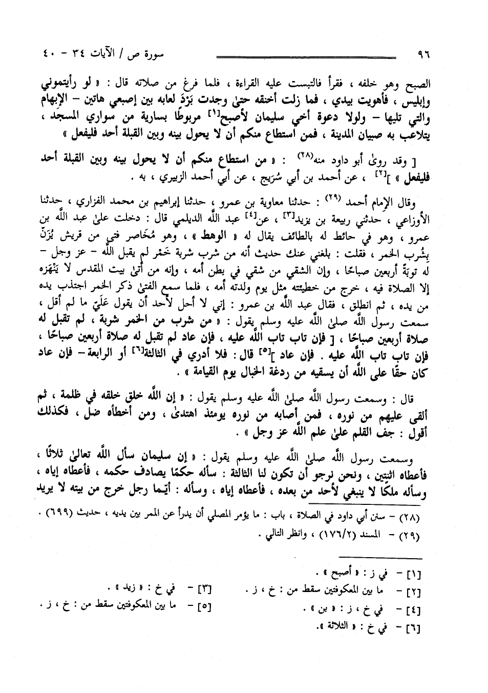 وَاَلَّتِي تَلِيهَا - وَلَوْلَا دَعْوَة أَخِي سُلَيْمَان لَأَصْبَحَ مَرْبُوطًا بِسَارِيَةٍ مِنْ سَوَارِي الْمَسْجِد يَتَلَاعَب بِهِ صِبْيَان الْمَدِينَة فَمَنْ اِسْتَطَاعَ مِنْكُمْ أَنْ لَا يَحُول بَيْنه وَبَيْن الْقِبْلَة أَحَد فَلْيَفْعَلْ " وَقَدْ رَوَى أَبُو دَاوُد مِنْهُ " مَنْ اِسْتَطَاعَ مِنْكُمْ أَنْ لَا يَحُول بَيْنه وَبَيْن الْقِبْلَة أَحَد فَلْيَفْعَلْ " عَنْ أَحْمَد بْن أَبِي سُرَيْج عَنْ أَبِي أَحْمَد الزُّبَيْرِيّ بِهِ وَقَالَ الْإِمَام أَحْمَد حَدَّثَنَا مُعَاوِيَة بْن عَمْرو حَدَّثَنَا إِبْرَاهِيم بْن مُحَمَّد الْفَزَارِيّ حَدَّثَنَا الْأَوْزَاعِيّ حَدَّثَنِي رَبِيعَة بْن يَزِيد بْن عَبْد اللَّه الدَّيْلَمِيّ قَالَ دَخَلْت عَلَى عَبْد اللَّه بْن عَمْرو رَضِيَ اللَّه عَنْهُمَا وَهُوَ فِي حَائِط لَهُ بِالطَّائِفِ يُقَال لَهُ الْوَهْط وَهُوَ مَخَاصِر فَتًى مِنْ قُرَيْش يُزَنُّ بِشُرْبِ الْخَمْر فَقُلْت بَلَغَنِي عَنْك حَدِيث أَنَّهُ " مَنْ شَرِبَ مِنْ الْخَمْر لَمْ يَقْبَل اللَّه عَزَّ وَجَلَّ لَهُ تَوْبَة أَرْبَعِينَ صَبَاحًا وَأَنَّ الشَّقِيَّ مَنْ شَقِيَ فِي بَطْن أُمّه وَأَنَّهُ مَنْ أَتَى بَيْت الْمَقْدِس لَا تَنْهَزهُ إِلَّا الصَّلَاة فِيهِ خَرَجَ مِنْ خَطِيئَته مِثْل يَوْم وَلَدَتْهُ أُمّه" فَلَمَّا سَمِعَ الْفَتَى ذِكْر الْخَمْر اِجْتَذَبَ يَده مِنْ يَده ثُمَّ اِنْطَلَقَ فَقَالَ عَبْد اللَّه بْن عَمْرو رَضِيَ اللَّه عَنْهُمَا إِنِّي لَا أُحِلُّ لِأَحَدٍ أَنْ يَقُول عَلَيَّ مَا لَمْ أَقُلْ سَمِعْت رَسُول اللَّه صَلَّى اللَّه عَلَيْهِ وَسَلَّمَ يَقُول " مَنْ شَرِبَ مِنْ الْخَمْر شَرْبَة لَا تُقْبَلْ لَهُ صَلَاة أَرْبَعِينَ صَبَاحًا فَإِنْ تَابَ تَابَ اللَّه عَلَيْهِ فَإِنْ عَادَ لَمْ تُقْبَلْ لَهُ صَلَاة أَرْبَعِينَ صَبَاحًا فَإِنْ تَابَ تَابَ اللَّه عَلَيْهِ - قَالَ فَلَا أَدْرِي فِي الثَّالِثَة أَوْ الرَّابِعَة قَالَ - فَإِنْ عَادَ كَانَ حَقًّا عَلَى اللَّه تَعَالَى أَنْ يَسْقِيه مِنْ طِينَة الْخَبَال يَوْم الْقِيَامَة " قَالَ وَسَمِعْت رَسُول اللَّه صَلَّى اللَّه عَلَيْهِ وَسَلَّمَ يَقُول " إِنَّ اللَّه عَزَّ وَجَلَّ خَلَقَ خَلْقه فِي ظُلْمَة ثُمَّ أَلْقَى عَلَيْهِمْ مِنْ نُوره فَمَنْ أَصَابَهُ مِنْ نُوره يَوْمئِذٍ اِهْتَدَى وَمَنْ أَخْطَأَهُ ضَلَّ فَلِذَلِكَ أَقُول جَفَّ الْقَلَم عَلَى عِلْم اللَّه عَزَّ وَجَلَّ " وَسَمِعْت رَسُول اللَّه صَلَّى اللَّه عَلَيْهِ وَسَلَّمَ يَقُول " إِنَّ سُلَيْمَان عَلَيْهِ السَّلَام سَأَلَ اللَّه تَعَالَى ثَلَاثًا فَأَعْطَاهُ اِثْنَتَيْنِ وَنَحْنُ نَرْجُو أَنْ تَكُون لَنَا الثَّالِثَة سَأَلَهُ حُكْمًا يُصَادِف حُكْمه فَأَعْطَاهُ إِيَّاهُ وَسَأَلَهُ مُلْكًا لَا يَنْبَغِي لِأَحَدٍ مِنْ بَعْده فَأَعْطَاهُ إِيَّاهُ وَسَأَلَهُ أَيّمَا رَجُل خَرَجَ مِنْ بَيْته لَا يُرِيد