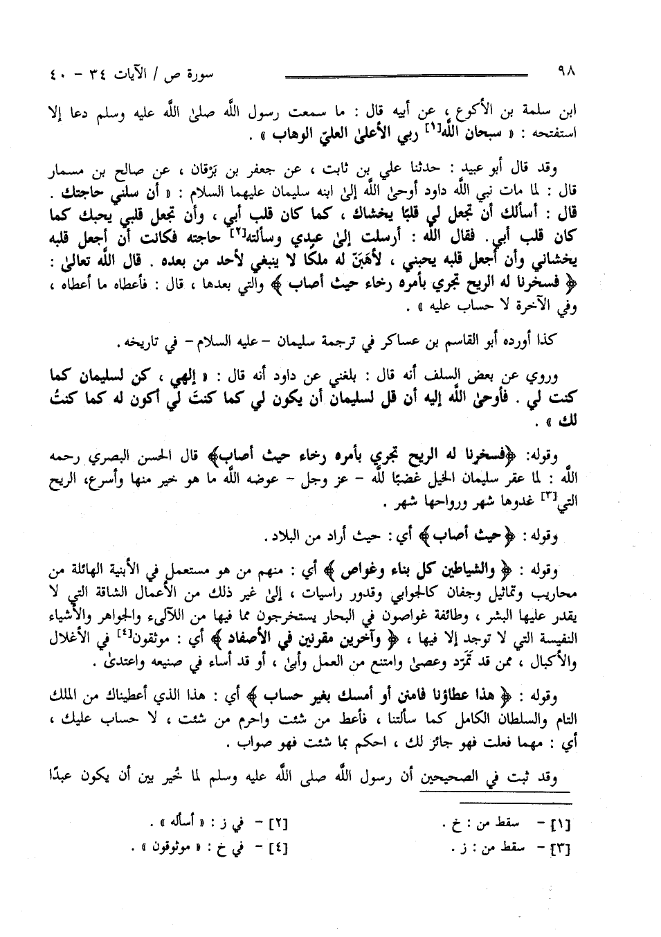 قَالَ اللَّه جَلَّتْ عَظَمَته : " فَسَخَّرْنَا لَهُ الرِّيح تَجْرِي بِأَمْرِهِ رُخَاء حَيْثُ أَصَابَ " - وَاَلَّتِي بَعْدهَا - قَالَ فَأَعْطَاهُ مَا أَعْطَاهُ وَفِي الْآخِرَة لَا حِسَاب عَلَيْهِ .