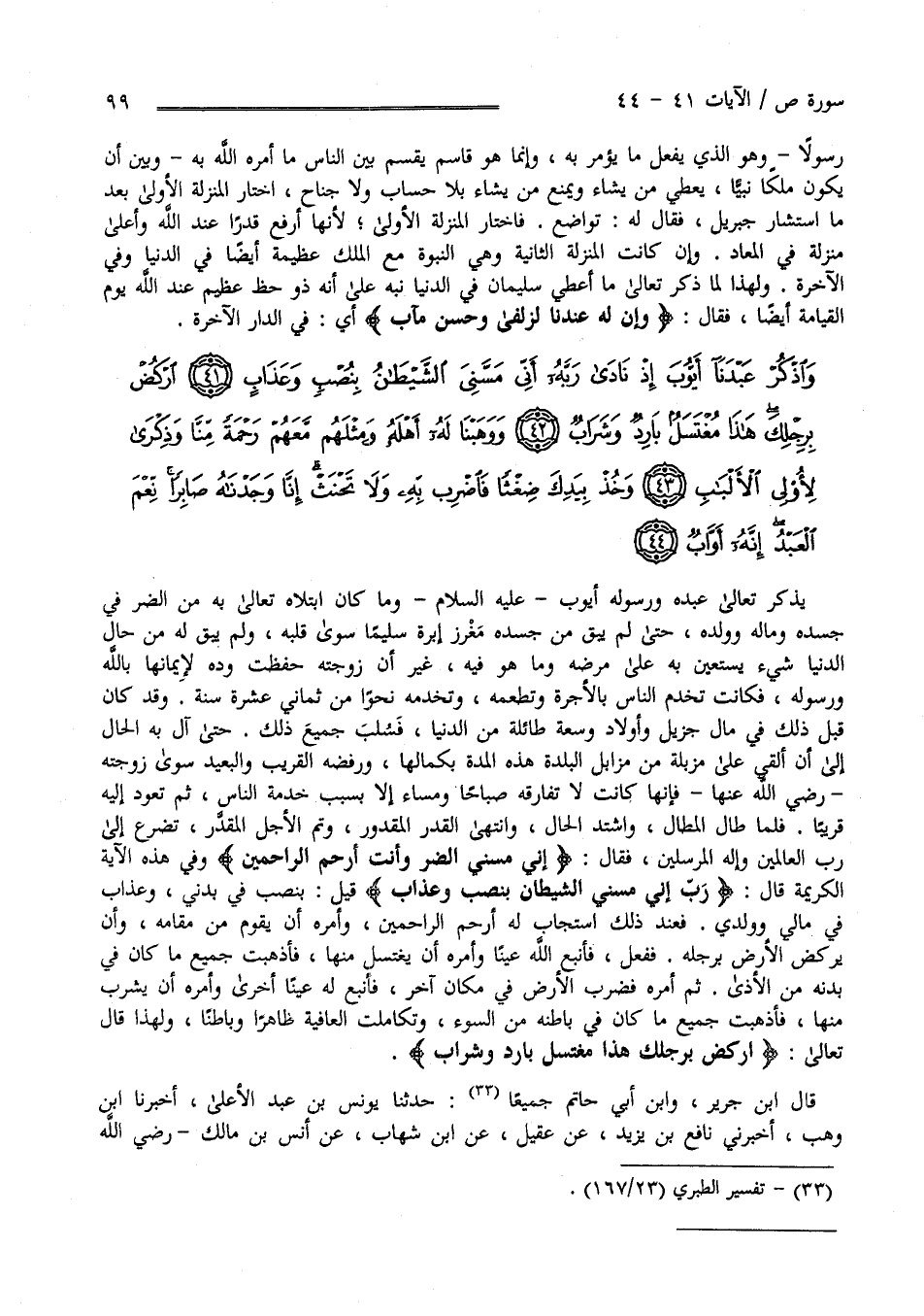 يَذْكُر تَبَارَكَ وَتَعَالَى عَبْده وَرَسُوله أَيُّوب عَلَيْهِ الصَّلَاة وَالسَّلَام وَمَا كَانَ اِبْتَلَاهُ تَعَالَى بِهِ مِنْ الضُّرّ فِي جَسَده وَمَاله وَوَلَده حَتَّى لَمْ يَبْقَ مِنْ جَسَده مَغْرِز إِبْرَة سَلِيمًا سِوَى قَلْبه وَلَمْ يَبْقَ لَهُ مِنْ الدُّنْيَا شَيْء يَسْتَعِين بِهِ عَلَى مَرَضه وَمَا هُوَ فِيهِ غَيْر أَنَّ زَوْجَته حَفِظَتْ وُدَّهُ لِإِيمَانِهَا بِاَللَّهِ تَعَالَى وَرَسُوله فَكَانَتْ تَخْدُم النَّاس بِالْأُجْرَةِ وَتُطْعِمهُ وَتَخْدُمهُ نَحْوًا مِنْ ثَمَانِي عَشْرَة سَنَة وَقَدْ كَانَ قَبْل ذَلِكَ فِي مَال جَزِيل وَأَوْلَاد وَسَعَة طَائِلَة مِنْ الدُّنْيَا فَسُلِبَ جَمِيع ذَلِكَ حَتَّى آلَ بِهِ الْحَال إِلَى أَنْ أُلْقِيَ عَلَى مَزْبَلَة مِنْ مَزَابِل الْبَلْدَة هَذِهِ الْمُدَّة بِكَمَالِهَا وَرَفَضَهُ الْقَرِيب وَالْبَعِيد سِوَى زَوْجَته رَضِيَ اللَّه عَنْهَا فَإِنَّهَا كَانَتْ لَا تُفَارِقُهُ صَبَاحًا وَمَسَاء إِلَّا بِسَبَبِ خِدْمَة النَّاس ثُمَّ تَعُود إِلَيْهِ قَرِيبًا فَلَمَّا طَالَ الْمَطَال وَاشْتَدَّ الْحَال وَانْتَهَى الْقَدْر وَتَمَّ الْأَجَل الْمُقَدَّر تَضَرَّعَ إِلَى رَبّ الْعَالَمِينَ وَإِلَه الْمُرْسَلِينَ فَقَالَ " أَنِّي مَسَّنِي الضُّرّ وَأَنْتَ أَرْحَم الرَّاحِمِينَ " وَفِي هَذِهِ الْآيَة الْكَرِيمَة قَالَ " وَاذْكُرْ عَبْدنَا أَيُّوب إِذْ نَادَى رَبّه أَنِّي مَسَّنِي الشَّيْطَان بِنُصْبٍ وَعَذَاب " قِيلَ بِنُصْبٍ فِي بَدَنِي وَعَذَاب فِي مَالِي وَوَلَدِي فَعِنْد ذَلِكَ اِسْتَجَابَ لَهُ أَرْحَمُ الرَّاحِمِينَ وَأَمَرَهُ أَنْ يَقُوم مِنْ مَقَامه وَأَنْ يَرْكُض الْأَرْض بِرِجْلِهِ فَفَعَلَ فَأَنْبَعَ اللَّه تَعَالَى عَيْنًا وَأَمَرَهُ أَنْ يَغْتَسِل مِنْهَا فَأَذْهَبَتْ جَمِيع مَا كَانَ فِي بَدَنه مِنْ الْأَذَى ثُمَّ أَمَرَهُ فَضَرَبَ الْأَرْض فِي مَكَان آخَر فَأَنْبَعَ لَهُ عَيْنًا أُخْرَى وَأَمَرَهُ أَنْ يَشْرَب مِنْهَا فَأَذْهَبَتْ جَمِيع مَا كَانَ فِي بَاطِنه مِنْ السُّوء وَتَكَامَلَتْ الْعَافِيَة ظَاهِرًا وَبَاطِنًا وَلِهَذَا قَالَ تَبَارَكَ وَتَعَالَى " اُرْكُضْ بِرِجْلِك هَذَا مُغْتَسَل بَارِد وَشَرَاب " قَالَ اِبْن جَرِير وَابْن أَبِي حَاتِم جَمِيعًا حَدَّثَنَا يُونُس بْن عَبْد الْأَعْلَى أَخْبَرَنَا اِبْن وَهْب أَخْبَرَنِي نَافِع بْن يَزِيد عَنْ عُقَيْل عَنْ اِبْن شِهَاب عَنْ أَنَس بْن مَالِك رَضِيَ اللَّه