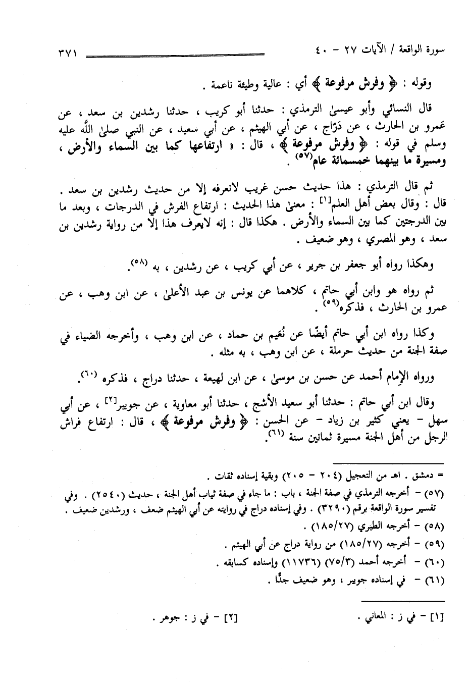 وَقَوْله تَعَالَى " وَفُرُش مَرْفُوعَة " أَيْ عَالِيَة وَطِيئَة نَاعِمَة قَالَ النَّسَائِيّ وَأَبُو عِيسَى التِّرْمِذِيّ حَدَّثَنَا أَبُو كُرَيْب حَدَّثَنَا رِشْدِين بْن سَعْد عَنْ عُمَر بْن الْحَارِث عَنْ دَرَّاج عَنْ أَبِي الْهَيْثَم عَنْ أَبِي سَعِيد عَنْ النَّبِيّ صَلَّى اللَّه عَلَيْهِ وَسَلَّمَ فِي قَوْله تَعَالَى " وَفُرُش مَرْفُوعَة" قَالَ " اِرْتِفَاعهَا كَمَا بَيْن السَّمَاء وَالْأَرْض وَمَسِيرَة مَا بَيْنهمَا خَمْسمِائَةِ عَام " ثُمَّ قَالَ التِّرْمِذِيّ هَذَا حَدِيث حَسَن غَرِيب لَا نَعْرِفهُ إِلَّا مِنْ حَدِيث رِشْدِين بْن سَعْد قَالَ : وَقَالَ بَعْض أَهْل الْعِلْم مَعْنَى هَذَا الْحَدِيث اِرْتِفَاع الْفُرُش فِي الدَّرَجَات وَبُعْد مَا بَيْن الدَّرَجَتَيْنِ كَمَا بَيْن السَّمَاء وَالْأَرْض هَكَذَا قَالَ إِنَّهُ لَا يَعْرِف هَذَا إِلَّا مِنْ رِوَايَة رِشْدِين بْن سَعْد وَهُوَ الْمِصْرِيّ وَهُوَ ضَعِيف هَكَذَا رَوَاهُ أَبُو جَعْفَر بْن جَرِير عَنْ أَبِي كُرَيْب عَنْ رِشْدِين بِهِ .