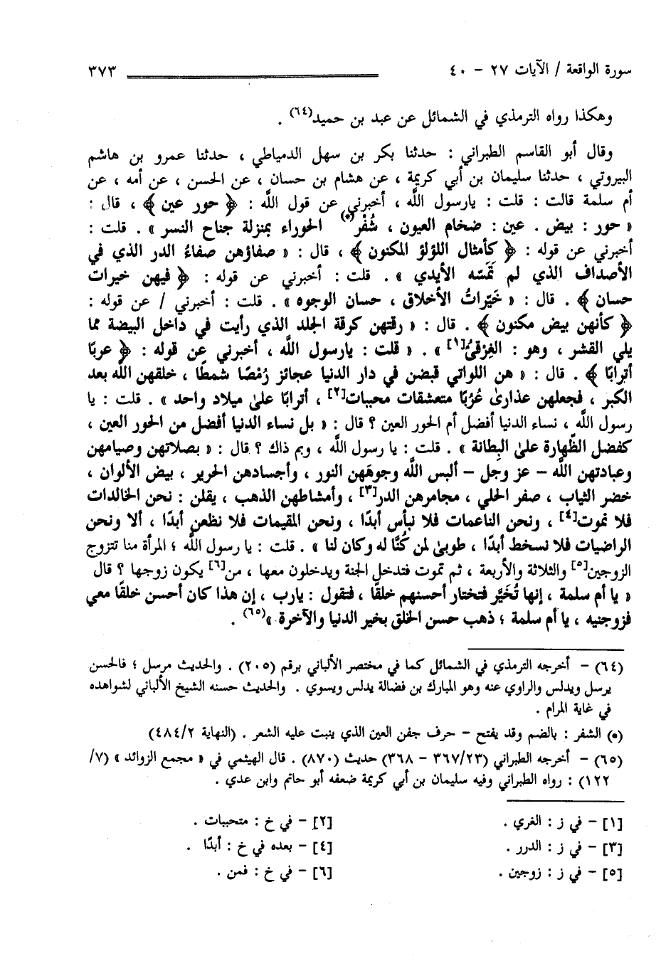وَهَكَذَا رَوَاهُ التِّرْمِذِيّ فِي الشَّمَائِل عَنْ عَبْد بْن حُمَيْد وَقَالَ أَبُو الْقَاسِم الطَّبَرَانِيّ حَدَّثَنَا بَكْر بْن سَهْل الدِّمْيَاطِيّ حَدَّثَنَا عَمْرو بْن هَاشِم الْبَيْرُوتِيّ أَخْبَرَنَا سُلَيْمَان بْن أَبِي كَرِيمَة عَنْ هِشَام بْن حَسَّان عَنْ الْحَسَن عَنْ أُمّه عَنْ أُمّ سَلَمَة قَالَتْ : قُلْت يَا رَسُول اللَّه أَخْبِرْنِي عَنْ قَوْل اللَّه تَعَالَى " حُور عِين " قَالَ" حُور بِيض عِين ضِخَام الْعُيُون شَفْر الْحَوْرَاء بِمَنْزِلَةِ جَنَاح النَّسْر " قُلْت أَخْبِرْنِي عَنْ قَوْله تَعَالَى " كَأَمْثَالِ اللُّؤْلُؤ الْمَكْنُون " قَالَ " صَفَاؤُهُنَّ صَفَاء الدُّرّ الَّذِي فِي الْأَصْدَاف الَّذِي لَمْ تَمَسّهُ الْأَيْدِي " قُلْت أَخْبِرْنِي عَنْ قَوْله " فِيهِنَّ خَيْرَات حِسَان " قَالَ خَيْرَات الْأَخْلَاق حِسَان الْوُجُوه" قُلْت أَخْبِرْنِي عَنْ قَوْله " كَأَنَّهُنَّ بِيض مَكْنُون " قَالَ" رِقَّتهنَّ كَرِقَّةِ الْجِلْد الَّذِي رَأَيْت فِي دَاخِل الْبَيْضَة مِمَّا يَلِي الْقِشْر وَهُوَ الْغِرْقِئ " قُلْت يَا رَسُول اللَّه أَخْبِرْنِي عَنْ قَوْله " عُرُبًا أَتْرَابًا " قَالَ " هُنَّ اللَّوَاتِي قُبِضْنَ فِي الدَّار الدُّنْيَا عَجَائِز رُمْصًا شُمْطًا خَلَقَهُنَّ اللَّه بَعْد الْكِبَر فَجَعَلَهُنَّ عَذَارَى عُرُبًا مُتَعَشَّقَات مُحَبَّبَات أَتْرَابًا عَلَى مِيلَاد وَاحِد " قُلْت يَا رَسُول اللَّه نِسَاء الدُّنْيَا أَفْضَل أَمْ