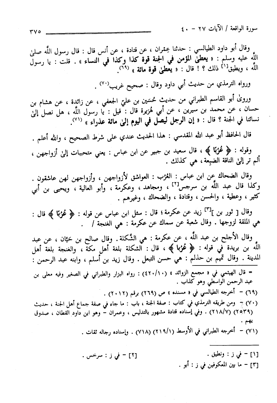 وَقَالَ أَبُو دَاوُد الطَّيَالِسِيّ أَخْبَرَنَا عِمْرَان عَنْ قَتَادَة عَنْ أَنَس قَالَ : قَالَ رَسُول اللَّه صَلَّى اللَّه عَلَيْهِ وَسَلَّمَ " يُعْطَى الْمُؤْمِن فِي الْجَنَّة قُوَّة كَذَا وَكَذَا فِي النِّسَاء " قُلْت يَا رَسُول اللَّه وَيُطِيق ذَلِكَ " قَالَ يُعْطَى قُوَّة مِائَة " وَرَوَاهُ التِّرْمِذِيّ مِنْ حَدِيث أَبِي دَاوُد وَقَالَ صَحِيح غَرِيب : وَرَوَى أَبُو الْقَاسِم الطَّبَرَانِيّ مِنْ حَدِيث حُسَيْن بْن عَلِيّ الْجُعْفِيّ عَنْ زَائِدَة عَنْ هِشَام بْن حَسَّان عَنْ مُحَمَّد بْن سِيرِينَ عَنْ أَبِي هُرَيْرَة قَالَ : قِيلَ يَا رَسُول اللَّه هَلْ نَصِل إِلَى نِسَائِنَا فِي الْجَنَّة ؟ قَالَ " إِنَّ الرَّجُل لِيَصِل فِي الْيَوْم إِلَى مِائَة عَذْرَاء" قَالَ الْحَافِظ أَبُو عَبْد اللَّه الْمَقْدِسِيّ هَذَا الْحَدِيث عِنْدِي عَلَى شَرْط الصَّحِيح وَاَللَّه أَعْلَم .