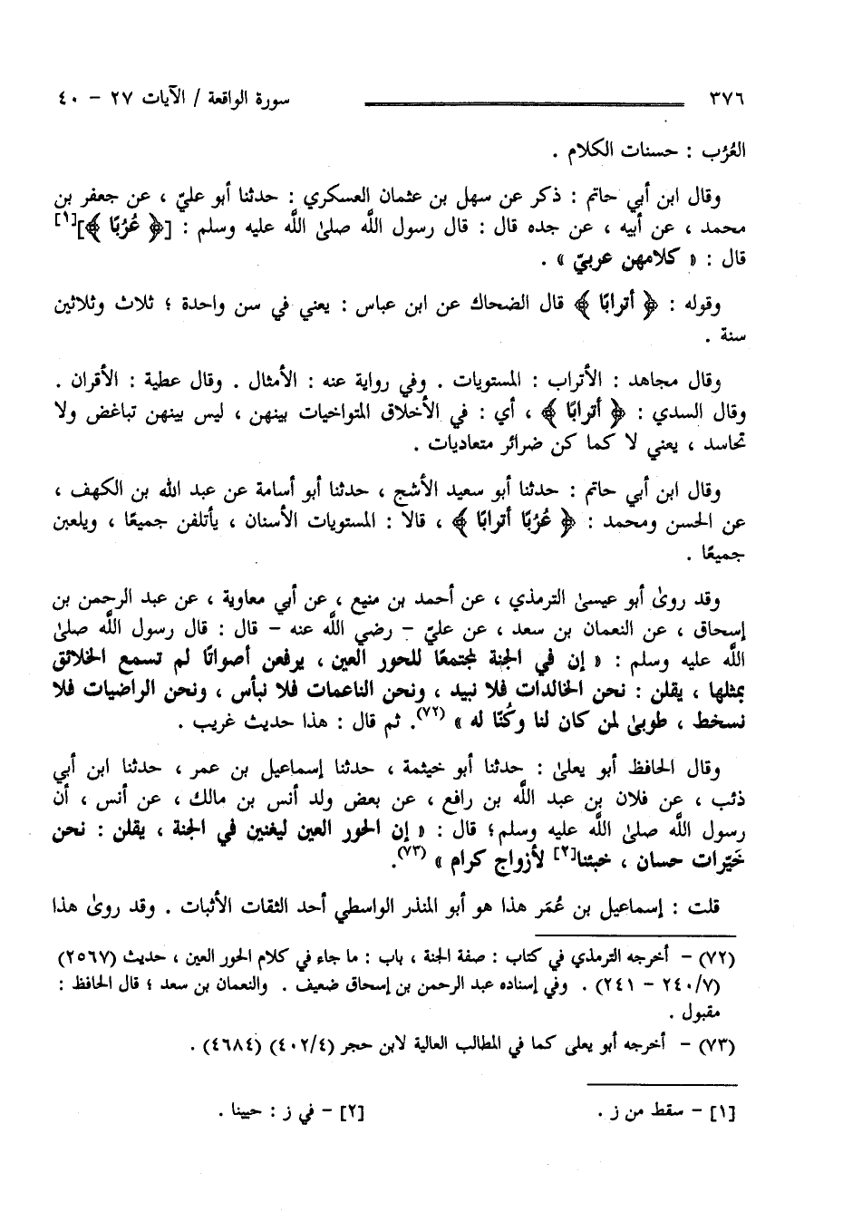 الْعُرُب حَسَنَات الْكَلَام وَقَالَ اِبْن أَبِي حَاتِم ذَكَرَ عَنْ سَهْل بْن عُثْمَان الْعَسْكَرِيّ حَدَّثَنَا أَبُو عَلِيّ عَنْ جَعْفَر بْن مُحَمَّد عَنْ أَبِيهِ عَنْ جَدّه قَالَ : قَالَ رَسُول اللَّه " عُرُبًا " - قَالَ - كَلَامهنَّ عَرَبِيّ " وَقَوْله " أَتْرَابًا" قَالَ الضَّحَّاك عَنْ اِبْن عَبَّاس يَعْنِي فِي سِنّ وَاحِدَة ثَلَاث وَثَلَاثِينَ سَنَة وَقَالَ مُجَاهِد الْأَتْرَاب الْمُسْتَوِيَات وَفِي رِوَايَة عَنْهُ الْأَمْثَال وَقَالَ عَطِيَّة الْأَقْرَان وَقَالَ السُّدِّيّ" أَتْرَابًا " أَيْ فِي الْأَخْلَاق الْمُتَوَاخِيَات بَيْنهنَّ لَيْسَ بَيْنهنَّ تَبَاغُض وَلَا تَحَاسُد يَعْنِي لَا كَمَا كُنَّ ضَرَائِر مُتَعَادِيَات وَقَالَ اِبْن أَبِي حَاتِم حَدَّثَنَا أَبُو سَعِيد الْأَشَجّ حَدَّثَنَا أَبُو أُسَامَة عَنْ عَبْد اللَّه بْن الْكَهْف عَنْ الْحَسَن وَمُحَمَّد " عُرُبًا أَتْرَابًا " "قَالَ الْمُسْتَوِيَات الْأَسْنَان يَأْتَلِفْنَ جَمِيعًا وَيَلْعَبْنَ جَمِيعًا وَقَدْ رَوَى أَبُو عِيسَى التِّرْمِذِيّ عَنْ أَحْمَد بْن مَنِيع عَنْ أَبِي مُعَاوِيَة عَنْ عَبْد الرَّحْمَن بْن إِسْحَاق عَنْ النُّعْمَان بْن سَعْد عَنْ عَلِيّ رَضِيَ اللَّه عَنْهُ قَالَ : قَالَ رَسُول اللَّه صَلِّي اللَّه عَلَيْهِ وَسَلَّمَ" إِنَّ فِي الْجَنَّة لَمُجْتَمَعًا لِلْحُورِ الْعِين يَرْفَعْنَ أَصْوَاتًا لَمْ تَسْمَع الْخَلَائِق بِمِثْلِهَا قَالَ يَقُلْنَ نَحْنُ الْخَالِدَات فَلَا نَبِيد وَنَحْنُ النَّاعِمَات فَلَا نَبْأَس وَنَحْنُ الرَّاضِيَات فَلَا نَسْخَط طُوبَى لِمَنْ كَانَ لَنَا وَكُنَّا لَهُ " ثُمَّ قَالَ هَذَا حَدِيث غَرِيب .