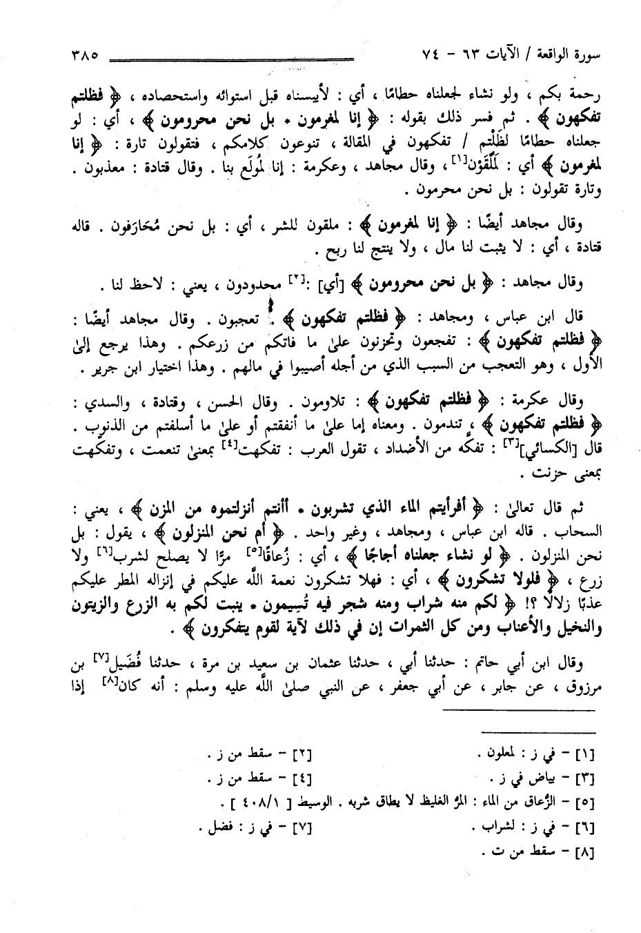 ثُمَّ فَسَّرَ ذَلِكَ بِقَوْلِهِ " إِنَّا لَمُغْرَمُونَ بَلْ نَحْنُ مَحْرُومُونَ " أَيْ لَوْ جَعَلْنَاهُ حُطَامًا لَظَلَلْتُمْ تَفَكَّهُونَ فِي الْمَقَالَة تُنَوِّعُونَ كَلَامكُمْ فَتَقُولُونَ تَارَة إِنَّا لَمُغْرَمُونَ أَيْ لَمُلْقُونَ وَقَالَ مُجَاهِد وَعِكْرِمَة إِنَّا لَمُوَقَّع بِنَا وَقَالَ قَتَادَة مُعَذَّبُونَ وَتَّاره تَقُولُونَ بَلْ نَحْنُ مَحْرُومُونَ وَقَالَ مُجَاهِد أَيْضًا إِنَّا لَمُغْرَمُونَ مُلْقُونَ لِلشَّرِّ أَيْ بَلْ نَحْنُ مُحَارِفُونَ قَالَهُ قَتَادَة أَيْ لَا يَثْبُت لَنَا مَال وَلَا يُنْتَج لَنَا رِبْح وَقَالَ مُجَاهِد بَلْ نَحْنُ مَحْرُومُونَ أَيْ مَجْدُودُونَ يَعْنِي لَا حَظّ لَنَا قَالَ اِبْن عَبَّاس وَمُجَاهِد " فَظَلْتُمْ تَفَكَّهُونَ" تُعْجِبُونَ وَقَالَ مُجَاهِد أَيْضًا فَظَلْتُمْ تَفَكَّهُونَ تَفْجَعُونَ وَتَحْزَنُونَ عَلَى مَا فَاتَكُمْ مِنْ زَرْعكُمْ وَهَذَا يَرْجِع إِلَى الْأَوَّل وَهُوَ التَّعَجُّب مِنْ السَّبَب الَّذِي مِنْ أَجْله أُصِيبُوا فِي مَالهمْ وَهَذَا اِخْتِيَار اِبْن جَرِير .