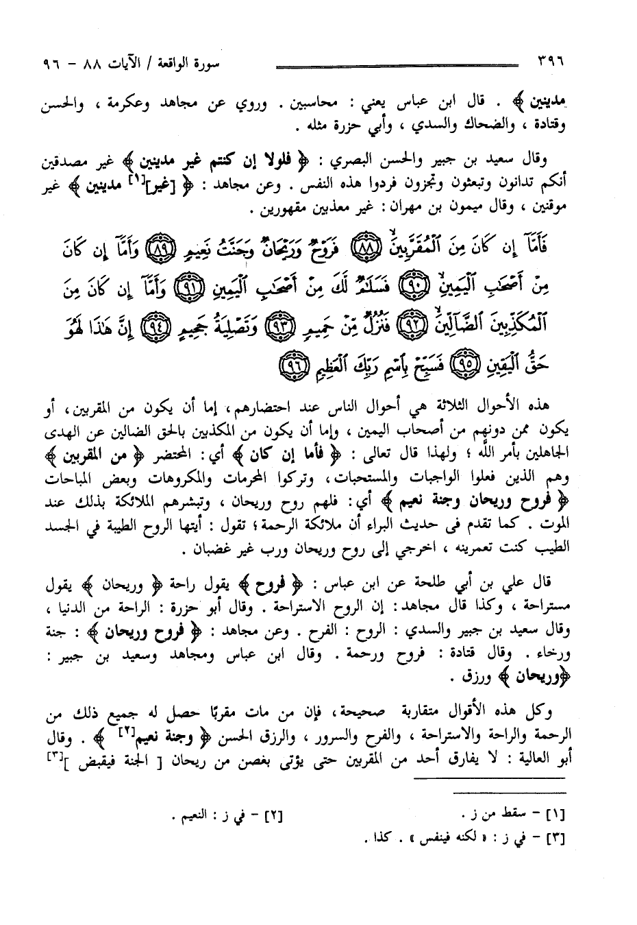 أَيْ فَلَهُمْ رَوْح وَرَيْحَان وَتُبَشِّرهُمْ الْمَلَائِكَة بِذَلِكَ عِنْد الْمَوْت كَمَا تَقَدَّمَ فِي حَدِيث الْبَرَاء أَنَّ مَلَائِكَة الرَّحْمَة تَقُول " أَيَّتهَا الرُّوح الطَّيِّبَة فِي الْجَسَد الطَّيِّب كُنْت تَعْمُرِينَهُ اُخْرُجِي إِلَى رَوْح وَرَيْحَان وَرَبّ غَيْر غَضْبَان " قَالَ عَلِيّ بْن أَبِي طَلْحَة عَنْ اِبْن عَبَّاس " فَرَوْح " يَقُول رَاحَة وَرَيْحَان يَقُول مُسْتَرَاحَة وَكَذَا قَالَ مُجَاهِد إِنَّ الرَّوْح الِاسْتِرَاحَة وَقَالَ أَبُو حَزْرَة الرَّاحَة مِنْ الدُّنْيَا وَقَالَ سَعِيد بْن جُبَيْر وَالسُّدِّيّ الرَّوْح الْفَرَح وَعَنْ مُجَاهِد " فَرَوْح وَرَيْحَان" جَنَّة وَرَخَاء وَقَالَ قَتَادَة فَرَوْح فَرَحْمَة وَقَالَ اِبْن عَبَّاس وَمُجَاهِد وَسَعِيد بْن جُبَيْر وَرَيْحَان وَرِزْق وَكُلّ هَذِهِ الْأَقْوَال مُتَقَارِبَة صَحِيحَة فَإِنَّ مَنْ مَاتَ مُقَرَّبًا حَصَلَ لَهُ جَمِيع ذَلِكَ مِنْ الرَّحْمَة وَالرَّاحَة وَالِاسْتِرَاحَة وَالْفَرَج وَالسُّرُور وَالرِّزْق الْحَسَن " وَجَنَّة نَعِيم " وَقَالَ أَبُو الْعَالِيَة لَا يُفَارَق أَحَد مِنْ الْمُقَرَّبِينَ حَتَّى يُؤْتَى بِغُصْنٍ مِنْ رَيْحَان الْجَنَّة فَيَقْبِض