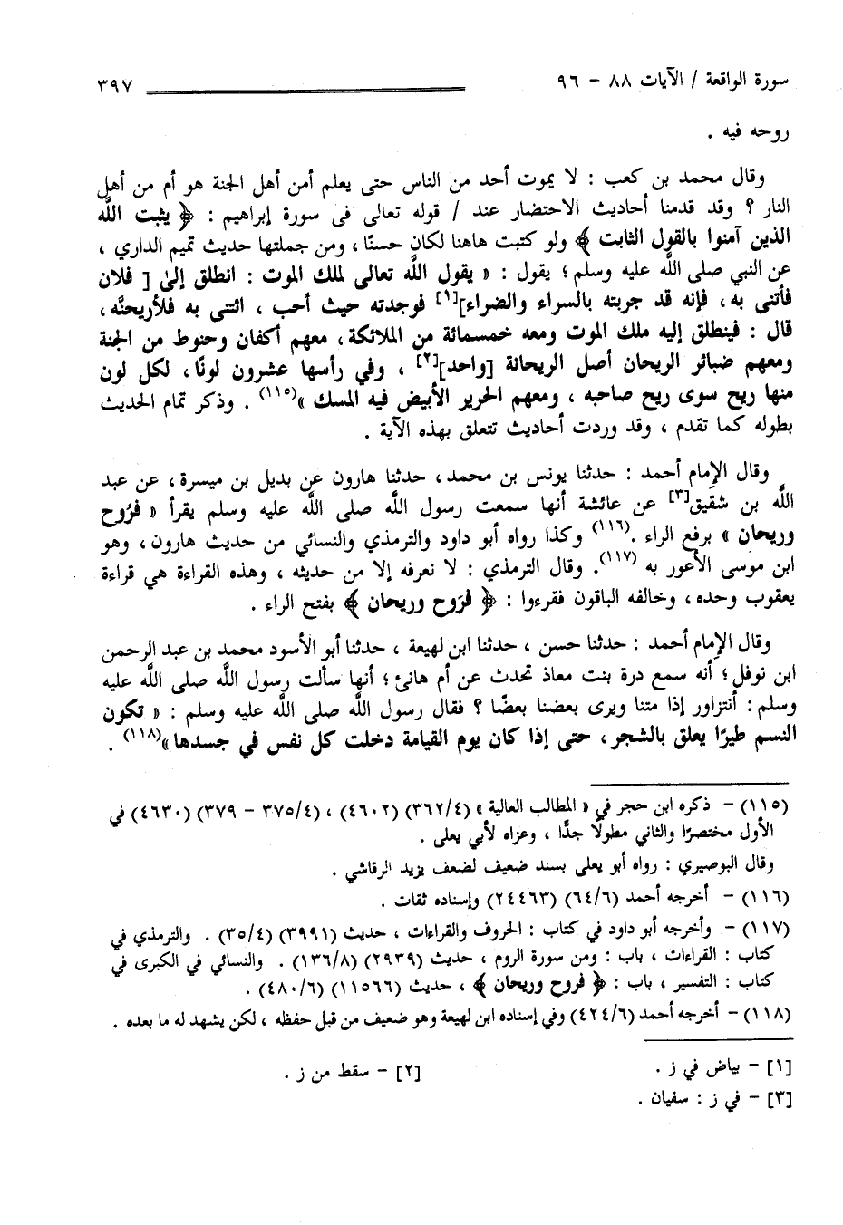 رُوحه فِيهِ وَقَالَ مُحَمَّد بْن كَعْب لَا يَمُوت أَحَد مِنْ النَّاس حَتَّى يَعْلَم مِنْ أَهْل الْجَنَّة هُوَ أَمْ مِنْ أَهْل النَّار ؟ وَقَدْ قَدَّمْنَا أَحَادِيث الِاحْتِضَار عِنْد قَوْله تَعَالَى فِي سُورَة إِبْرَاهِيم " يُثَبِّت اللَّه الَّذِينَ آمَنُوا بِالْقَوْلِ الثَّابِت " وَلَوْ كُتِبَتْ هَهُنَا لَكَانَ حَسَنًا وَأَجَّلَهَا حَدِيث تَمِيم الدَّارِيّ عَنْ النَّبِيّ صَلَّى اللَّه عَلَيْهِ وَسَلَّمَ يَقُول " يَقُول اللَّه تَعَالَى لِمَلَكِ الْمَوْت اِنْطَلِقْ إِلَى فُلَان فَأْتِنِي بِهِ فَإِنَّهُ قَدْ جَرَّبْته بِالسَّرَّاءِ وَالضَّرَّاء فَوَجَدْته حَيْثُ أُحِبّ اِئْتِنِي فَلْأُرِحْهُ - قَالَ - فَيَنْطَلِق إِلَيْهِ مَلَك الْمَوْت وَمَعَهُ خَمْسمِائَةِ مِنْ الْمَلَائِكَة مَعَهُمْ أَكْفَان وَحَنُوط مِنْ الْجَنَّة وَمَعَهُمْ ضَبَائِر الرَّيْحَان أَصْل الرَّيْحَانَة وَاحِد وَفِي رَأْسهَا عِشْرُونَ لَوْنًا لِكُلِّ لَوْن مِنْهَا رِيح سِوَى رِيح صَاحِبه وَمَعَهُمْ الْحَرِير الْأَبْيَض فِيهِ الْمِسْك " وَذَكَرَ تَمَام الْحَدِيث بِطُولِهِ كَمَا تَقَدَّمَ وَقَدْ وَرَدَتْ أَحَادِيث تَتَعَلَّق بِهَذِهِ الْآيَة قَالَ الْإِمَام أَحْمَد حَدَّثَنَا يُونُس بْن مُحَمَّد حَدَّثَنَا هَارُون عَنْ بُدَيْل بْن مَيْسَرَة عَنْ عَبْد اللَّه بْن شَقِيق عَنْ عَائِشَة أَنَّهَا سَمِعَتْ رَسُول اللَّه يَقْرَأ " فَرُوح وَرَيْحَان " بِرَفْعِ الرَّاء وَكَذَا رَوَاهُ أَبُو دَاوُد وَالتِّرْمِذِيّ وَالنَّسَائِيّ مِنْ حَدِيث هَارُون وَهُوَ اِبْن مُوسَى الْأَعْوَر بِهِ .