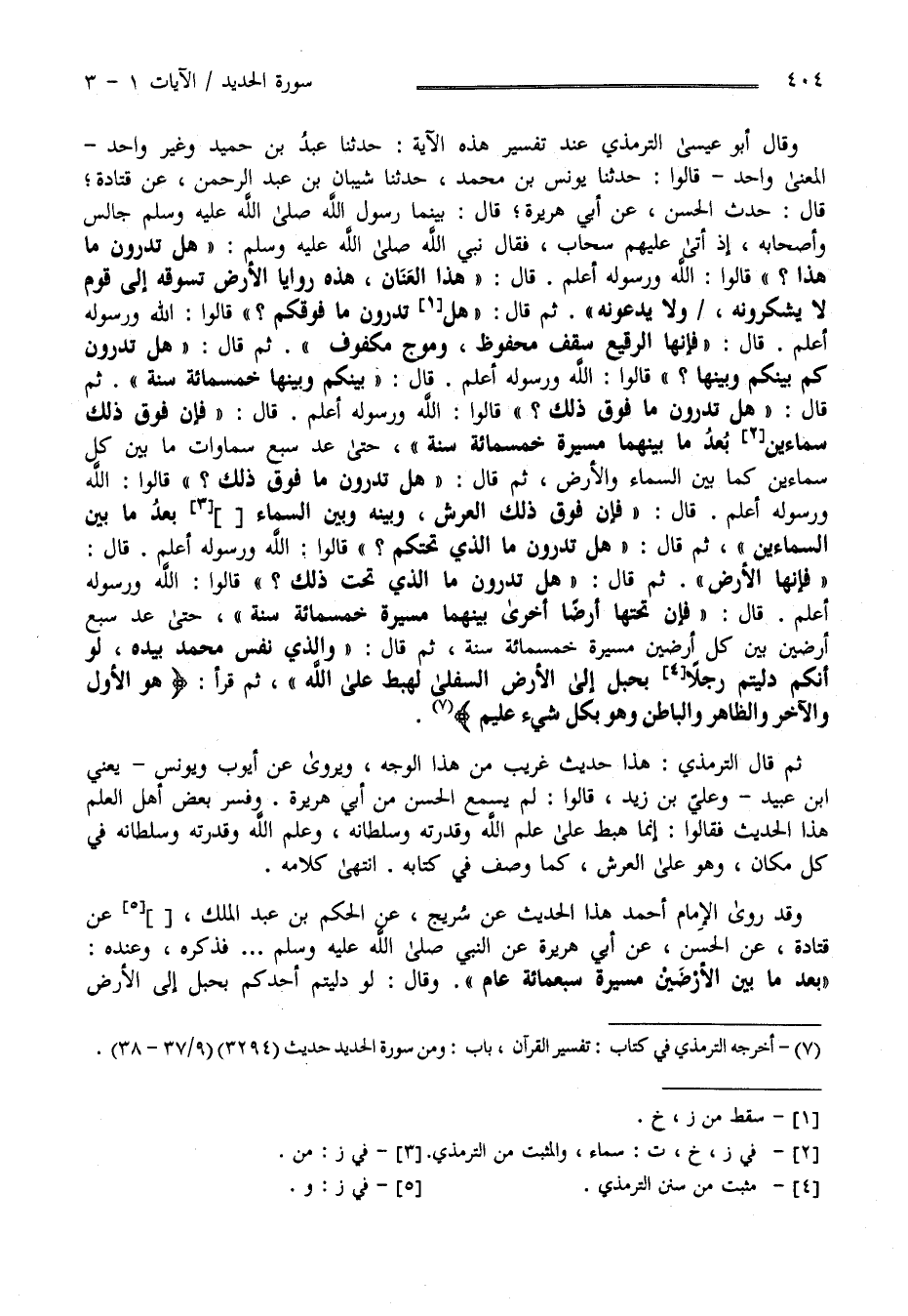 وَقَالَ أَبُو عِيسَى التِّرْمِذِيّ عِنْد تَفْسِير هَذِهِ الْآيَة حَدَّثَنَا عَبْد بْن حُمَيْد وَغَيْر وَاحِد الْمَعْنَى وَاحِد قَالُوا حَدَّثَنَا يُونُس بْن مُحَمَّد حَدَّثَنَا شَيْبَان بْن عَبْد الرَّحْمَن عَنْ قَتَادَة قَالَ حَدَّثَ الْحَسَن عَنْ أَبِي هُرَيْرَة قَالَ بَيْنَمَا نَبِيّ اللَّه صَلَّى اللَّه عَلَيْهِ وَسَلَّمَ جَالِس وَأَصْحَابه إِذْ أَتَى عَلَيْهِمْ سَحَاب فَقَالَ نَبِيّ اللَّه صَلَّى اللَّه عَلَيْهِ وَسَلَّمَ" هَلْ تَدْرُونَ مَا هَذَا " قَالُوا اللَّه وَرَسُوله أَعْلَم قَالَ" هَذَا الْعَنَان هَذِهِ رَوَايَا الْأَرْض تَسُوقهُ إِلَى قَوْم لَا يَشْكُرُونَهُ وَلَا يَدْعُونَهُ - ثُمَّ قَالَ - هَلْ تَدْرُونَ مَا فَوْقكُمْ ؟ قَالُوا اللَّه وَرَسُوله أَعْلَم قَالَ " فَإِنَّهَا الرَّفِيع سَقْف مَحْفُوظ وَمَوْج مَكْفُوف - ثُمَّ قَالَ - هَلْ تَدْرُونَ كَمْ بَيْنكُمْ وَبَيْنهَا ؟ قَالُوا اللَّه وَرَسُوله أَعْلَم قَالَ بَيْنكُمْ وَبَيْنهَا خَمْسمِائَةِ سَنَة - ثُمَّ قَالَ - هَلْ تَدْرُونَ مَا فَوْق ذَلِكَ ؟ قَالُوا اللَّه وَرَسُوله أَعْلَم قَالَ " فَإِنَّ فَوْق ذَلِكَ سَمَاء بُعْد مَا بَيْنهمَا مَسِيرَة خَمْسمِائَةِ سَنَة - حَتَّى عَدَّ سَبْع سَمَاوَات - مَا بَيْن كُلّ سَمَاءَيْنِ كَمَا بَيْن السَّمَاء وَالْأَرْض - ثُمَّ قَالَ - هَلْ تَدْرُونَ مَا فَوْق ذَلِكَ ؟ قَالُوا اللَّه وَرَسُوله أَعْلَم ؟ قَالَ " فَإِنَّ فَوْق ذَلِكَ الْعَرْش وَبَيْنه وَبَيْن السَّمَاء مِثْل بُعْد مَا بَيْن السَّمَاءَيْنِ - ثُمَّ قَالَ - هَلْ تَدْرُونَ مَا الَّذِي تَحْتكُمْ ؟ قَالُوا اللَّه وَرَسُوله أَعْلَم قَالَ " فَإِنَّهَا الْأَرْض - ثُمَّ قَالَ - هَلْ تَدْرُونَ مَا الَّذِي تَحْت ذَلِكَ ؟ قَالُوا اللَّه وَرَسُوله أَعْلَم قَالَ فَإِنَّ تَحْتهَا أَرْضًا أُخْرَى بَيْنهمَا مَسِيرَة خَمْسمِائَةِ سَنَة - حَتَّى عَدَّ سَبْع أَرَضِينَ - بَيْن كُلّ أَرَضِينَ مَسِيرَة خَمْسمِائَةِ سَنَة - ثُمَّ قَالَ - وَاَلَّذِي نَفْس مُحَمَّد بِيَدِهِ لَوْ أَنَّكُمْ دَلَّيْتُمْ حَبْلًا إِلَى الْأَرْض