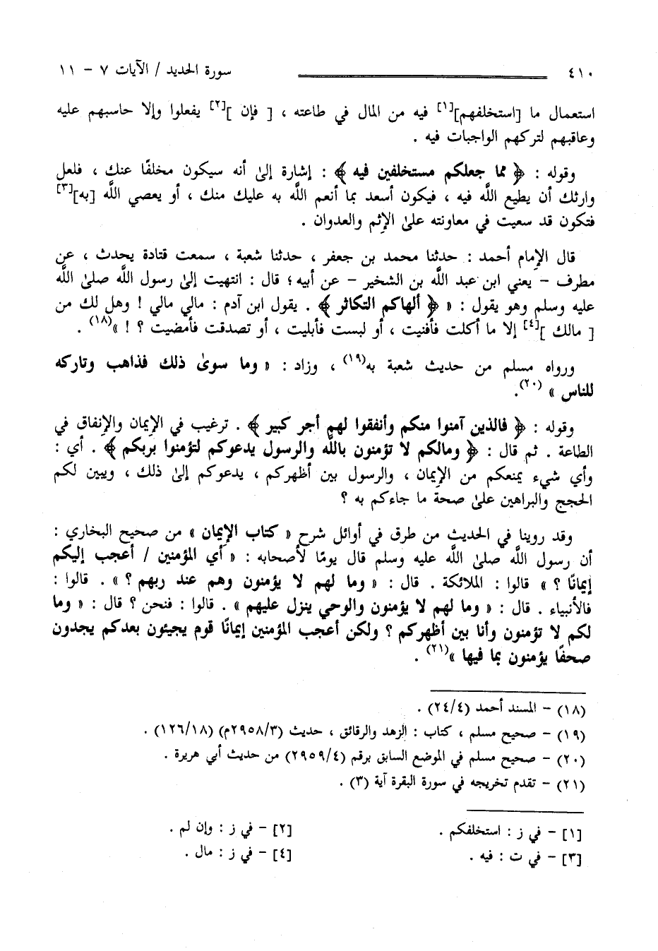 قَالَ الْإِمَام أَحْمَد حَدَّثَنَا مُحَمَّد بْن جَعْفَر حَدَّثَنَا شُعْبَة سَمِعْت قَتَادَة يُحَدِّث عَنْ مُطَرِّف يَعْنِي اِبْن عَبْد اللَّه بْن الشِّخِّير عَنْ أَبِيهِ قَالَ اِنْتَهَيْت إِلَى رَسُول اللَّه صَلَّى اللَّه عَلَيْهِ وَسَلَّمَ وَهُوَ يَقُول " أَلْهَاكُمْ التَّكَاثُر" يَقُول اِبْن آدَم مَالِي مَالِي وَهَلْ لَك مِنْ مَالِك إِلَّا مَا أَكَلْت فَأَفْنَيْت أَوْ لَبِسْت فَأَبْلَيْت أَوْ تَصَدَّقْت فَأَمْضَيْت ؟ وَرَوَاهُ مُسْلِم مِنْ حَدِيث شُعْبَة بِهِ وَزَادَ " وَمَا سِوَى ذَلِكَ فَذَاهِب وَتَارِكه لِلنَّاسِ " وَقَوْله تَعَالَى " فَاَلَّذِينَ آمَنُوا مِنْكُمْ وَأَنْفَقُوا لَهُمْ أَجْر كَبِير " تَرْغِيب فِي الْإِيمَان وَالْإِنْفَاق فِي الطَّاعَة .