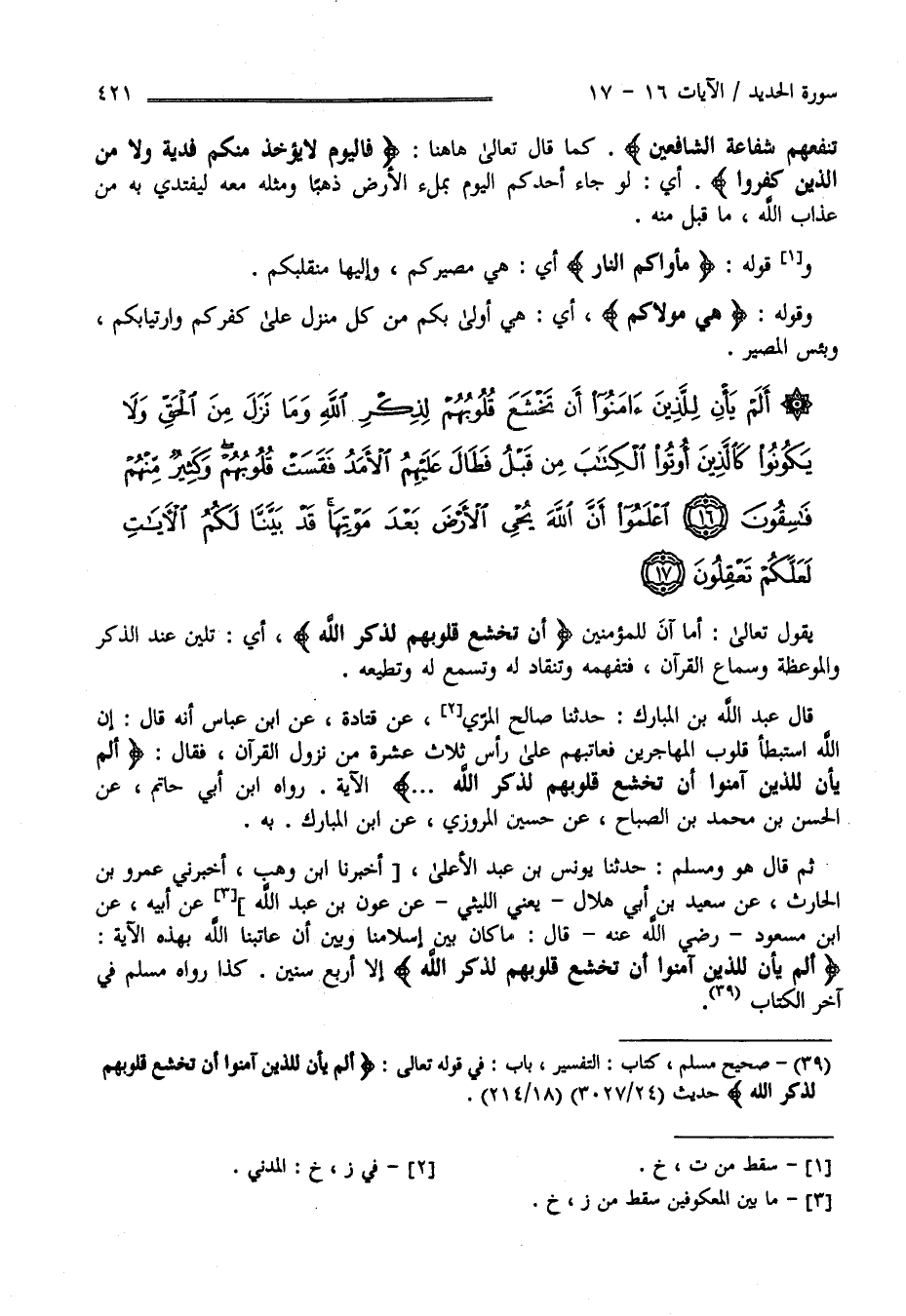 أَلَمْ يَأْنِ لِلَّذِينَ آَمَنُوا أَنْ تَخْشَعَ قُلُوبُهُمْ لِذِكْرِ اللَّهِ وَمَا نَزَلَ مِنَ الْحَقِّ وَلَا يَكُونُوا كَالَّذِينَ أُوتُوا الْكِتَابَ مِنْ قَبْلُ فَطَالَ عَلَيْهِمُ الْأَمَدُ فَقَسَتْ قُلُوبُهُمْ وَكَثِيرٌ مِنْهُمْ فَاسِقُونَ (16)