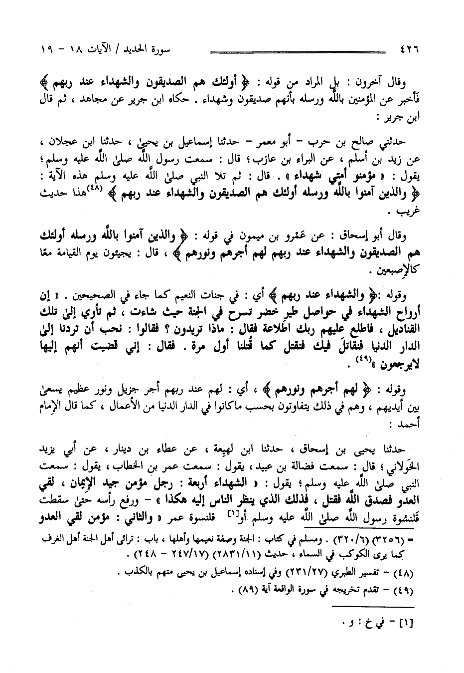 وَقَوْله تَعَالَى " وَالشُّهَدَاء عِنْد رَبّهمْ " أَيْ فِي جَنَّات النَّعِيم كَمَا جَاءَ فِي الصَّحِيحَيْنِ إِنَّ أَرْوَاح الشُّهَدَاء فِي حَوَاصِل طَيْر خُضْر تُسَرَّح فِي الْجَنَّة حَيْثُ شَاءَتْ ثُمَّ تَأْوِي إِلَى تِلْكَ الْقَنَادِيل فَاطَّلَعَ عَلَيْهِمْ رَبّك اِطِّلَاعَة فَقَالَ مَاذَا تُرِيدُونَ ؟ فَقَالُوا نُحِبّ أَنْ تَرُدّنَا إِلَى الدَّار الدُّنْيَا فَنُقَاتِل فِيك فَنُقْتَل كَمَا قُتِلْنَا أَوَّل مَرَّة فَقَالَ إِنِّي قَدْ قَضَيْت أَنَّهُمْ إِلَيْهَا لَا يَرْجِعُونَ " وَقَوْله تَعَالَى " لَهُمْ أَجْرهمْ وَنُورهمْ" أَيْ لَهُمْ عِنْد اللَّه أَجْر جَزِيل وَنُور عَظِيم يَسْعَى بَيْن أَيْدِيهمْ وَهُمْ فِي ذَلِكَ يَتَفَاوَتُونَ بِحَسْب مَا كَانُوا فِي الدَّار الدُّنْيَا مِنْ الْأَعْمَال كَمَا قَالَ الْإِمَام أَحْمَد حَدَّثَنَا يَحْيَى بْن إِسْحَاق حَدَّثَنَا اِبْن لَهِيعَة عَنْ عَطَاء بْن دِينَار عَنْ أَبِي يَزِيد الْخَوْلَانِيّ قَالَ : سَمِعْت فَضَالَة بْن عُبَيْد يَقُول سَمِعْت عُمَر بْن الْخَطَّاب يَقُول سَمِعْت رَسُول اللَّه صَلَّى اللَّه عَلَيْهِ وَسَلَّمَ يَقُول " الشُّهَدَاء أَرْبَعَة رَجُل مُؤْمِن جَيِّد الْإِيمَان لَقِيَ الْعَدُوّ فَصَدَّقَ اللَّه فَقَتْل فَذَاكَ الَّذِي يَنْظُر النَّاس إِلَيْهِ هَكَذَا وَرَفَعَ رَأْسه حَتَّى سَقَطَتْ قَلَنْسُوَة رَسُول اللَّه صَلَّى اللَّه عَلَيْهِ وَسَلَّمَ وَقَلَنْسُوَة عُمَر وَالثَّانِي مُؤْمِن لَقِيَ الْعَدُوّ