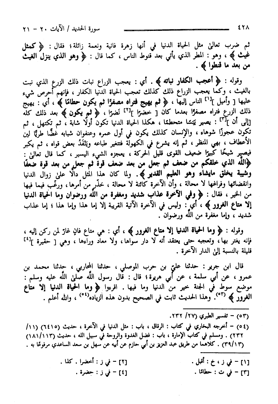 " ثُمَّ يَهِيج فَتَرَاهُ مُصْفَرًّا ثُمَّ يَكُون حُطَامًا " أَيْ يَهِيج ذَلِكَ الزَّرْع فَتَرَاهُ مُصْفَرًّا بَعْد مَا كَانَ خَضِرًا نَضِرًا ثُمَّ يَكُون بَعْد ذَلِكَ كُلّه حُطَامًا أَيْ يَصِير يَبِسًا مُتَحَطِّمًا هَكَذَا الْحَيَاة الدُّنْيَا تَكُون أَوَّلًا شَابَّة ثُمَّ تُكْتَهَل ثُمَّ تَكُون عَجُوزًا شَوْهَاء وَالْإِنْسَان يَكُون كَذَلِكَ فِي أَوَّل عُمْره وَعُنْفُوَان شَبَابه غَضًّا طَرِيًّا لَيِّن الْأَعْطَاف بَهِيّ الْمَنْظَر ثُمَّ إِنَّهُ يَشْرَع فِي الْكُهُولَة فَتَتَغَيَّر طِبَاعه وَيَفْقِد بَعْض قُوَاهُ ثُمَّ يَكْبُر فَيَصِير شَيْخًا كَبِيرًا ضَعِيف الْقُوَى قَلِيل الْحَرَكَة يُعْجِزهُ الشَّيْء الْيَسِير كَمَا قَالَ تَعَالَى " اللَّه الَّذِي خَلَقَكُمْ مِنْ ضَعْف ثُمَّ جَعَلَ مِنْ بَعْد ضَعْف قُوَّة ثُمَّ جَعَلَ مِنْ بَعْد قُوَّة ضَعْفًا وَشَيْبًا يَخْلُق مَا يَشَاء وَهُوَ الْعَلِيم الْقَدِير " وَلَمَّا كَانَ هَذَا الْمَثَل دَالًّا عَلَى زَوَال الدُّنْيَا وَانْقِضَائِهَا وَفَرَاغهَا لَا مَحَالَة وَأَنَّ الْآخِرَة كَائِنَة لَا مَحَالَة حَذَّرَ مِنْ أَمْرهَا وَرَغَّبَ فِيمَا فِيهَا مِنْ الْخَيْر فَقَالَ " وَفِي الْآخِرَة عَذَاب شَدِيد وَمَغْفِرَة مِنْ اللَّه وَرِضْوَان وَمَا الْحَيَاة الدُّنْيَا إِلَّا مَتَاع الْغُرُور " أَيْ وَلَيْسَ فِي الْآخِرَة الْآتِيَة الْقَرِيبَة إِلَّا إِمَّا هَذَا وَإِمَّا هَذَا : إِمَّا عَذَاب شَدِيد وَإِمَّا مَغْفِرَة مِنْ اللَّه وَرِضْوَان .